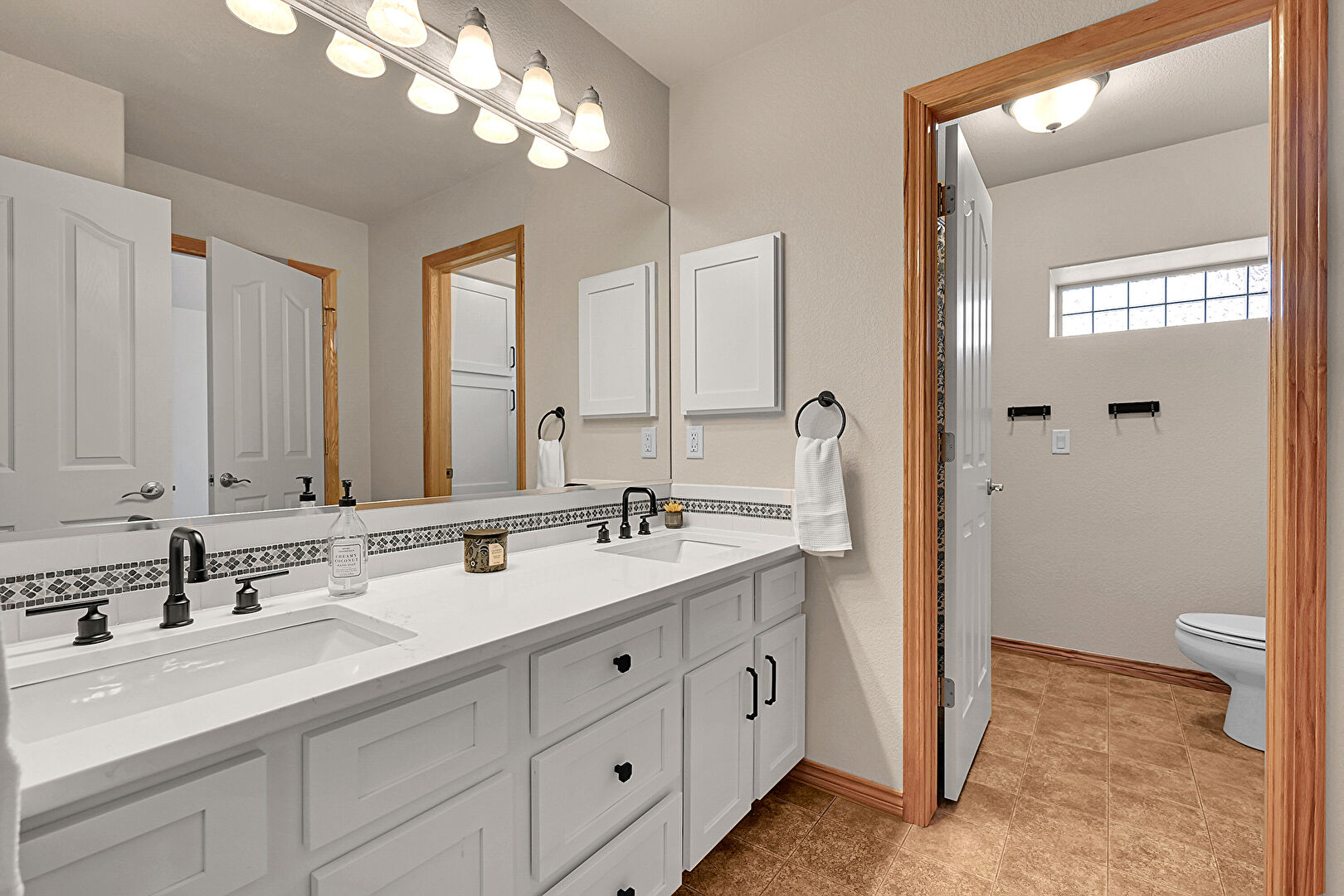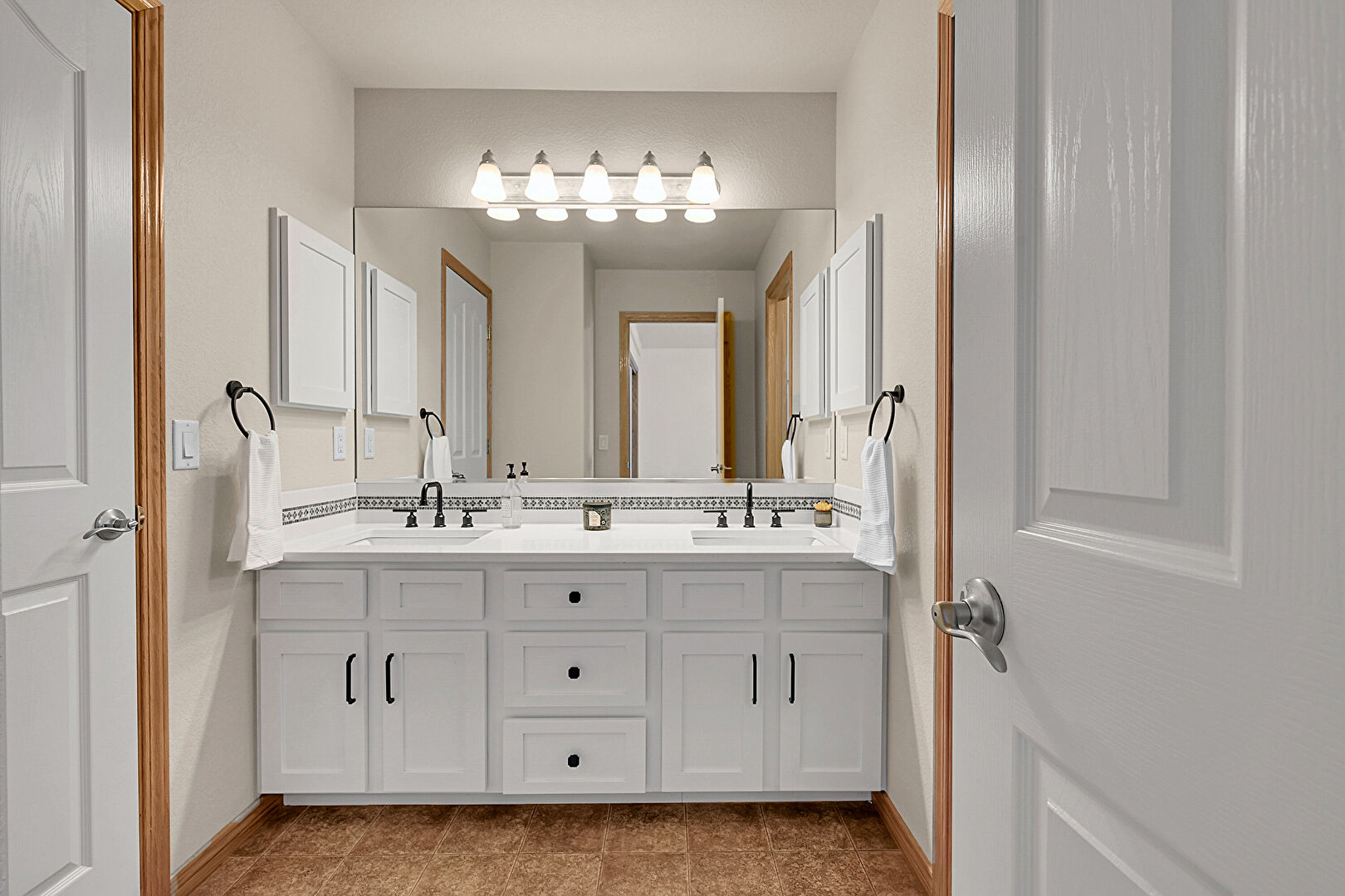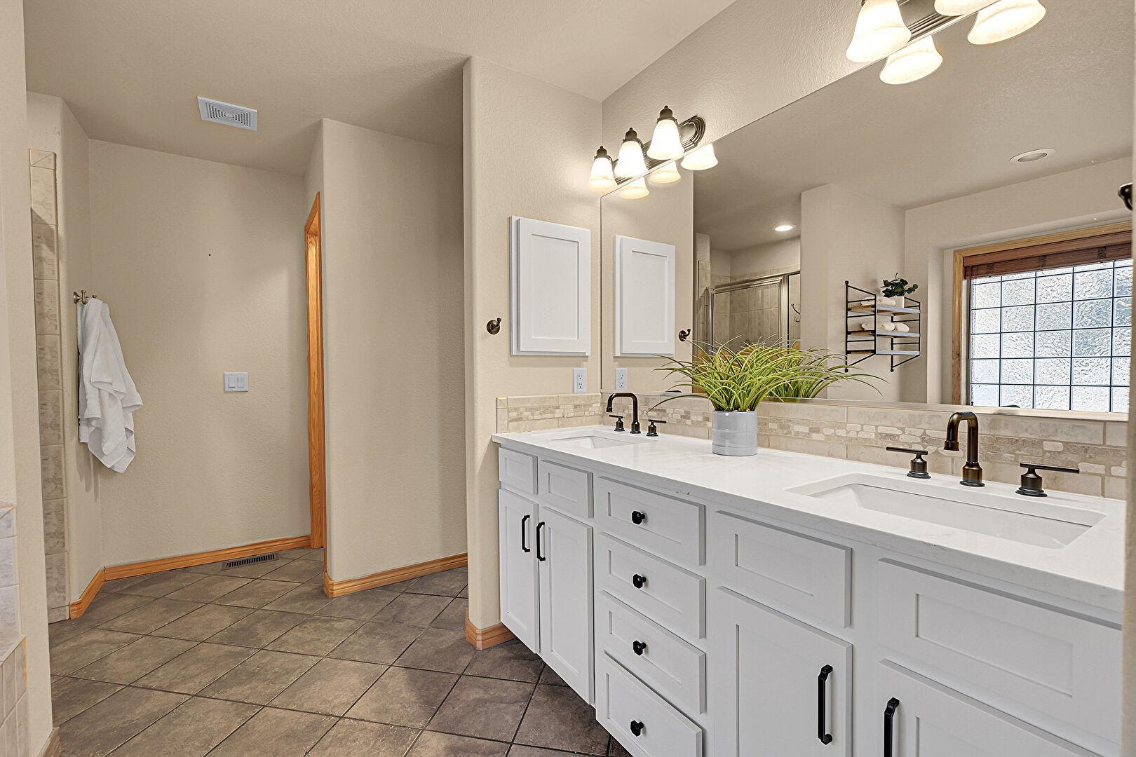 Baseboards Wall, Double Vanity, Drywall, Full Bathroom, Natural Light, Recessed Lighting, Tile Floor, Vanity, Vent, Baseboards Wall, Ensuite Bathroom, Vent