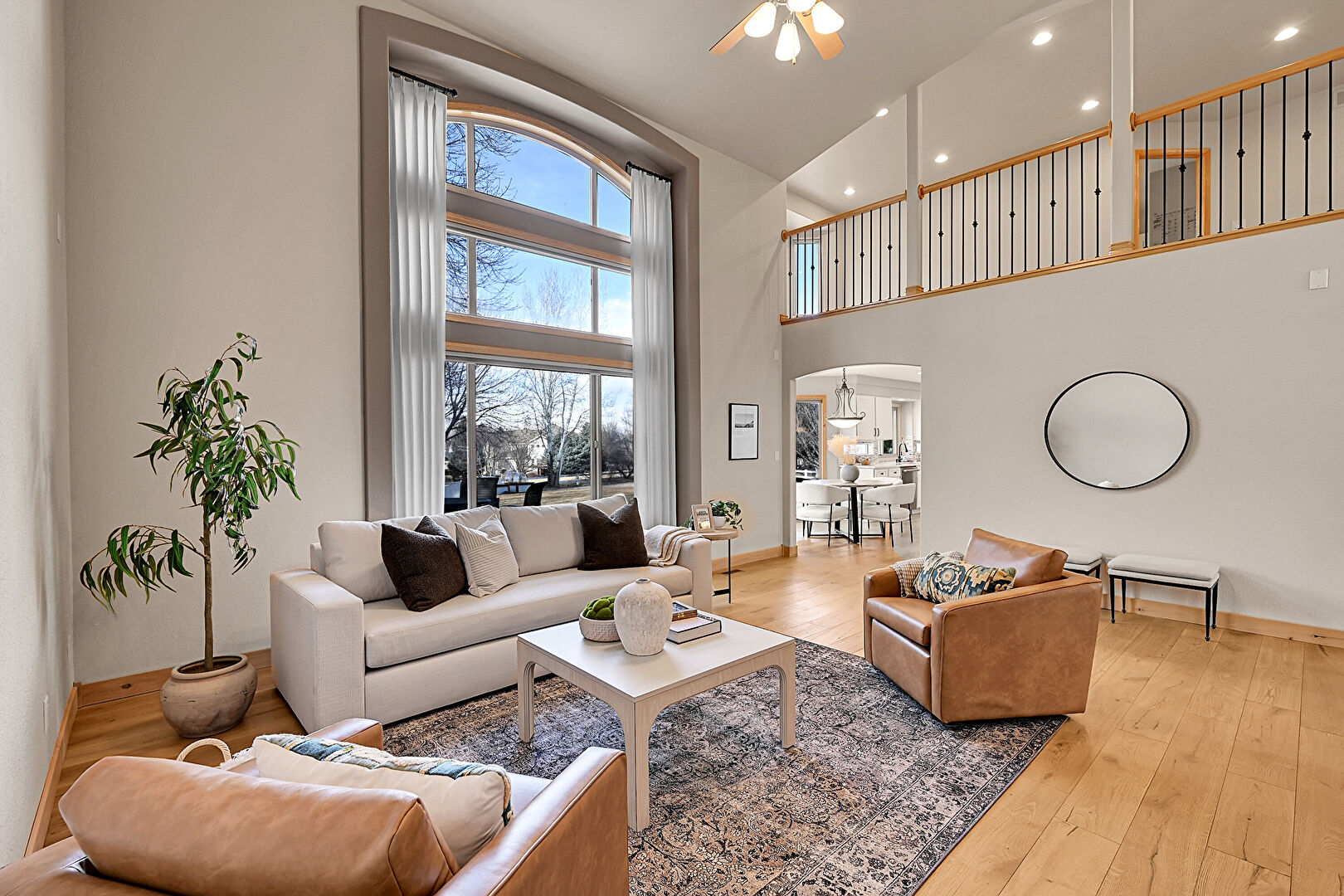 Arched Walkways, Baseboards Wall, Ceiling Fan, Drywall, Fireplace, High Ceiling, Natural Light, Recessed Lighting, Stairs, Vaulted Ceiling, Vent, Wood Finish Floor, Baseboards Wall, Ceiling Fan, Drywall, High Ceiling, Wood Finish Floor