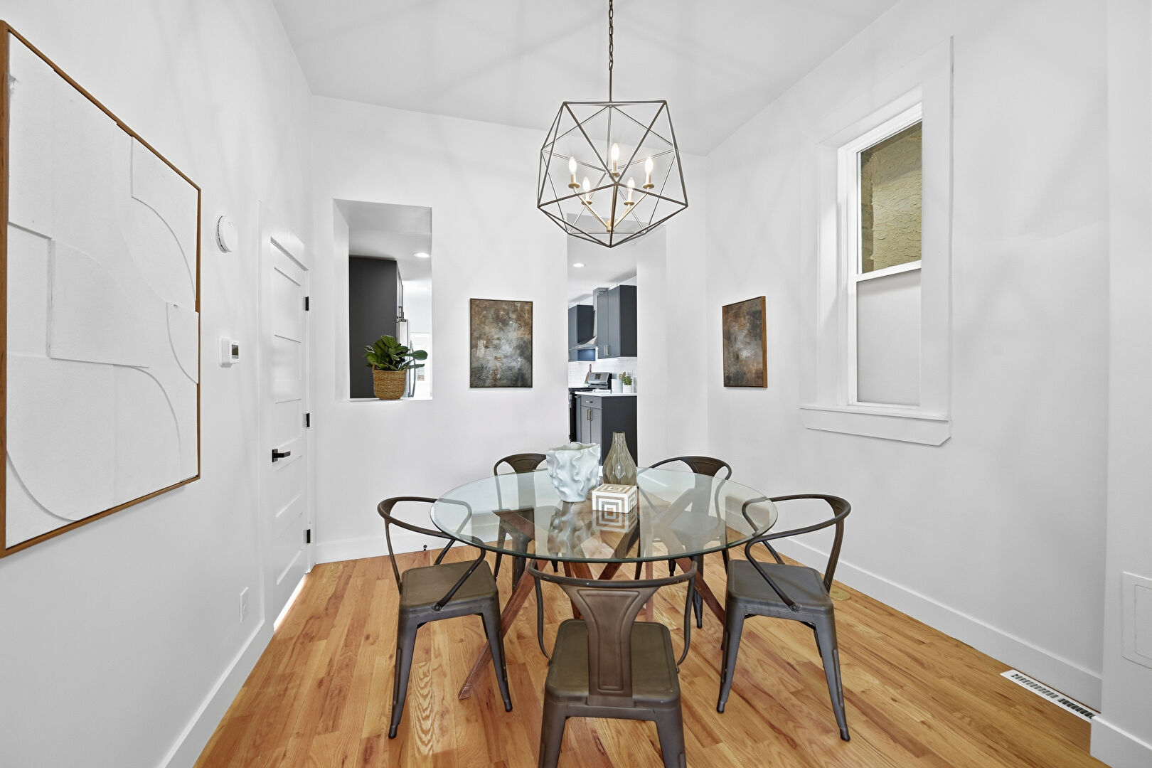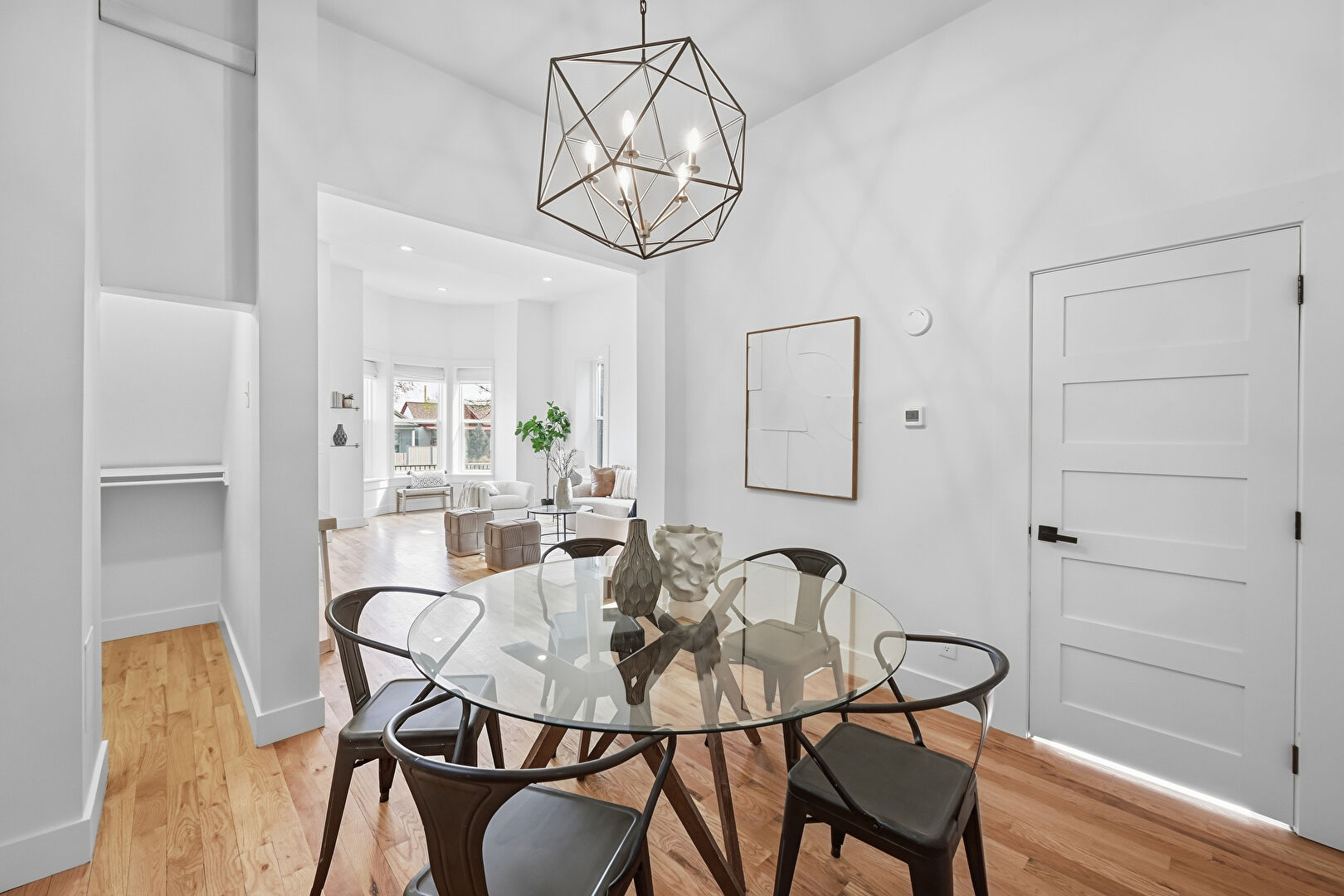 Baseboards Wall, Drywall, High Ceiling, Natural Light, Notable Chandelier, Recessed Lighting, Vent, Wood Finish Floor
