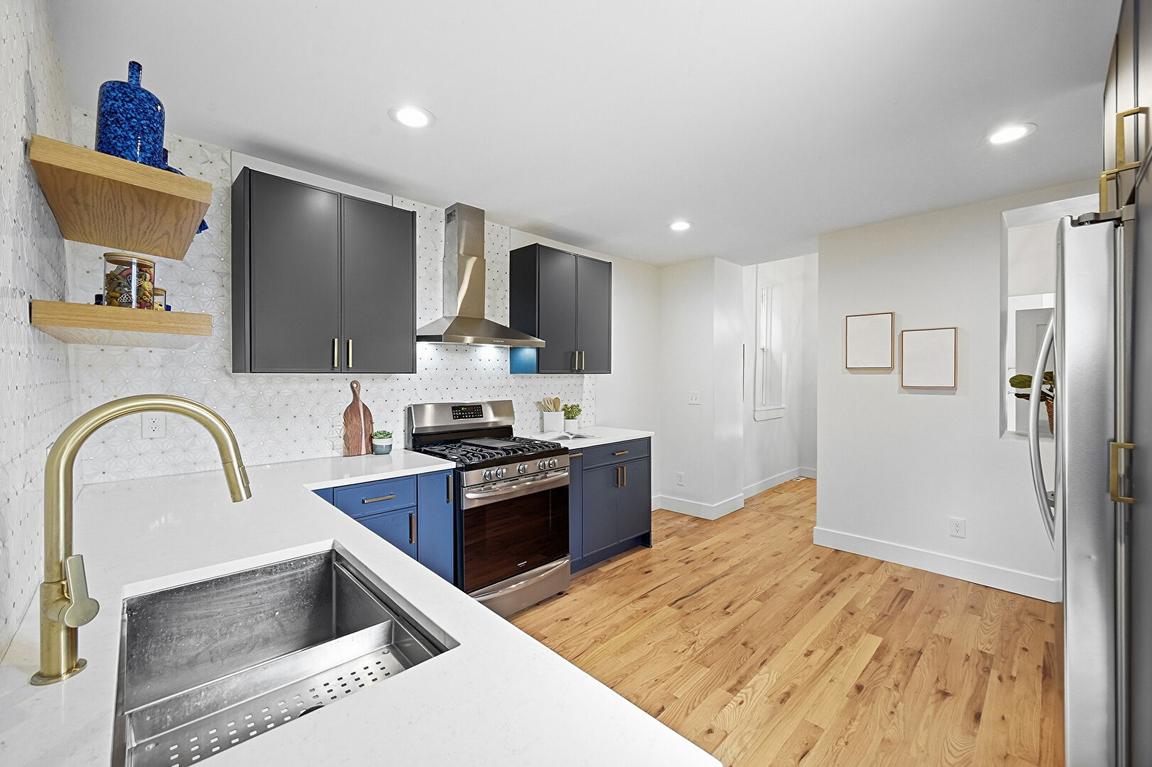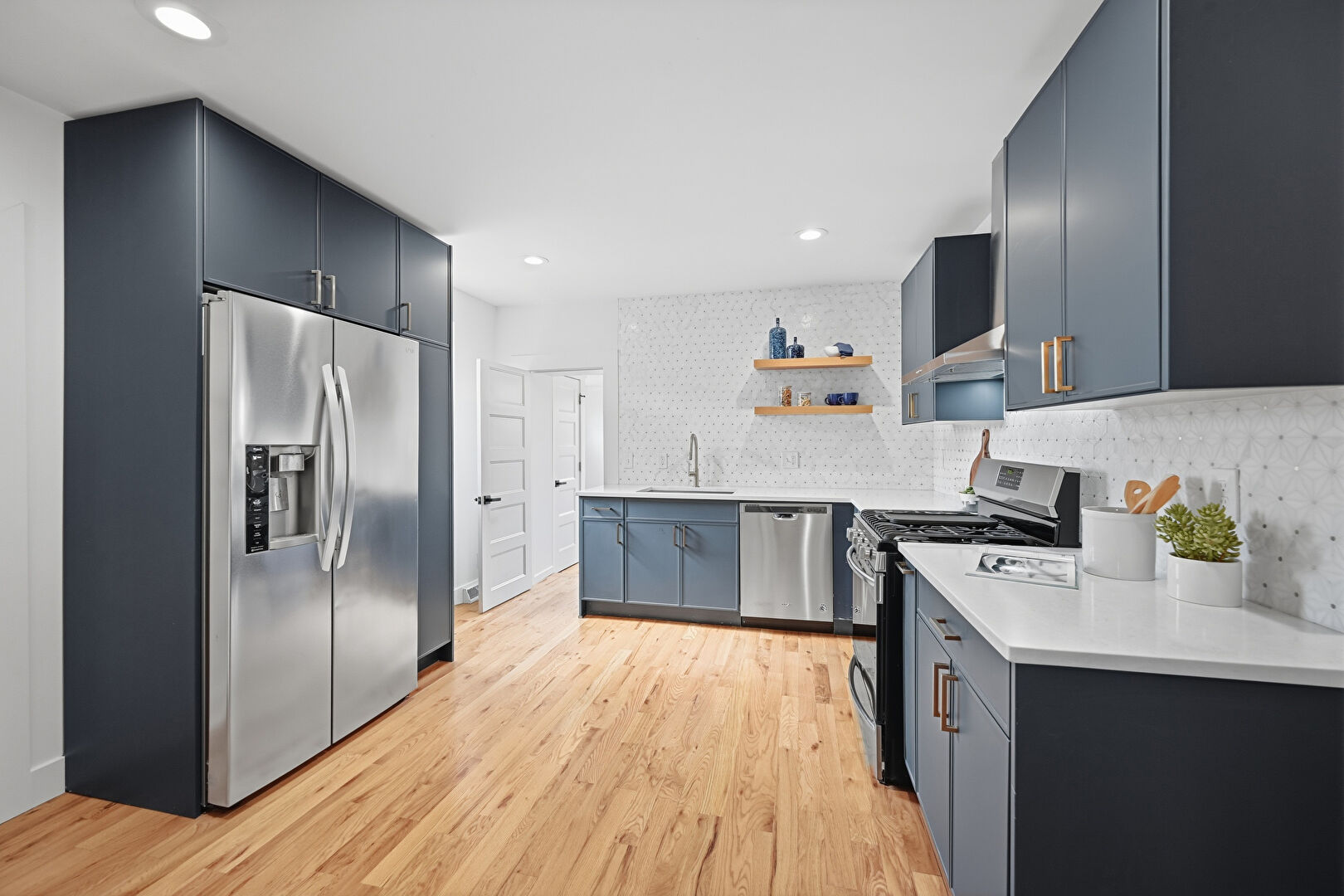 Baseboards Wall, Black Cabinets, Blue Cabinets, Drywall, L Shaped Kitchen, Natural Light, Open Shelves, Recessed Lighting, Shaker Cabinets, Stone Countertops, U Shaped Kitchen, Wood Finish Floor, Blue Cabinets, Open Shelves