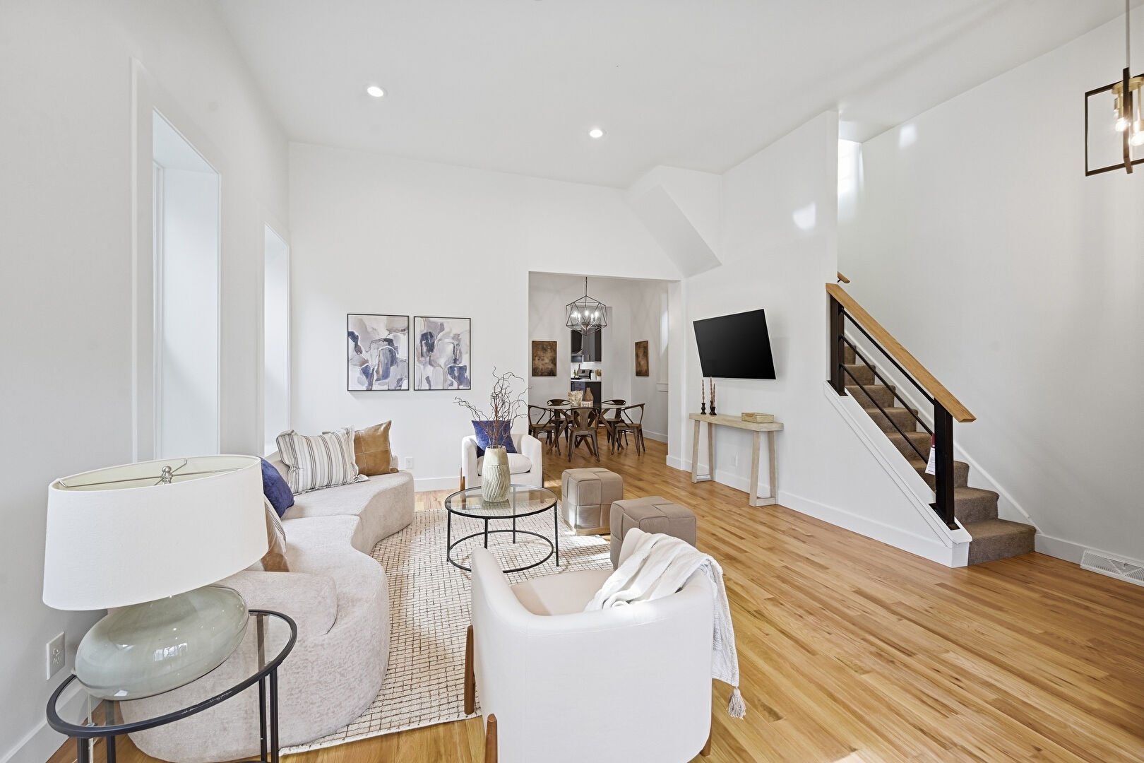 Baseboards Wall, Drywall, High Ceiling, Natural Light, Notable Chandelier, Recessed Lighting, Stairs, Vent, Wood Finish Floor, Baseboards Wall, Recessed Lighting, Wood Finish Floor