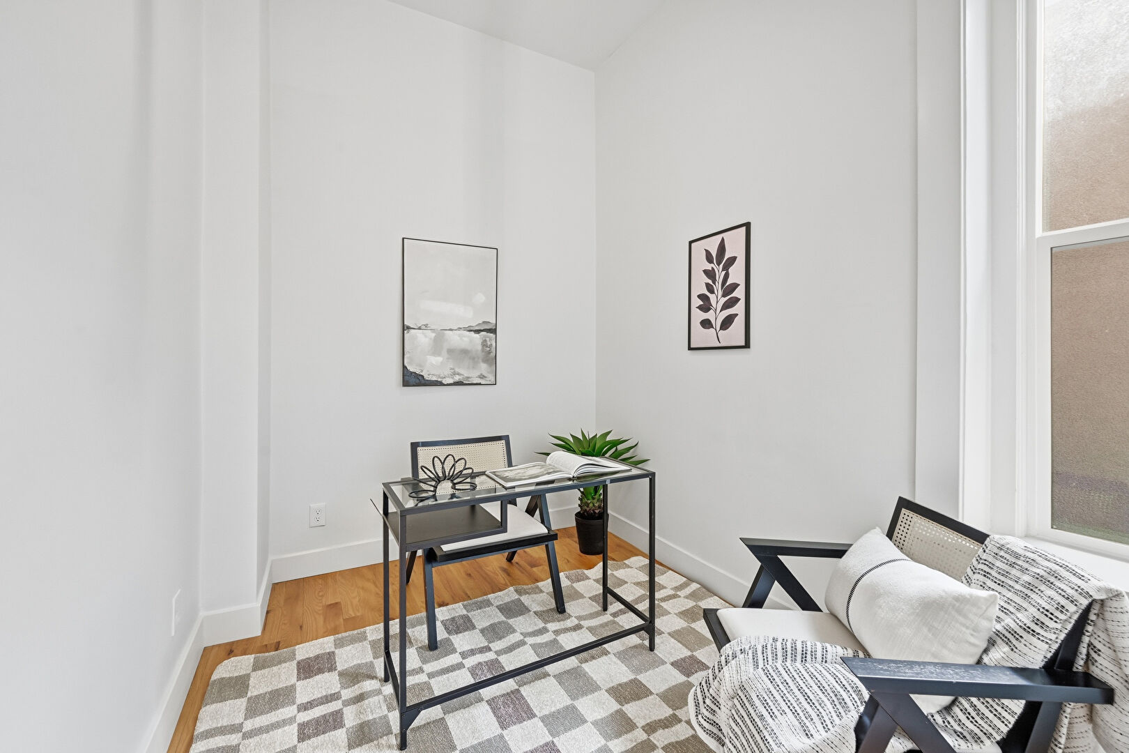 Baseboards Wall, Drywall, Natural Light, Office Area, Wood Finish Floor, High Ceiling