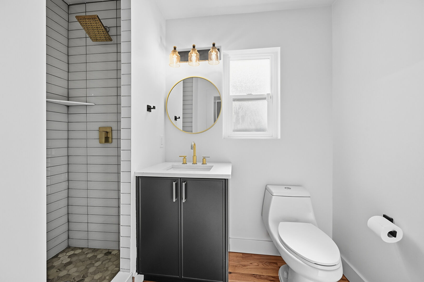 Baseboards Wall, Drywall, Full Bathroom, Natural Light, Wood Finish Floor, Vanity