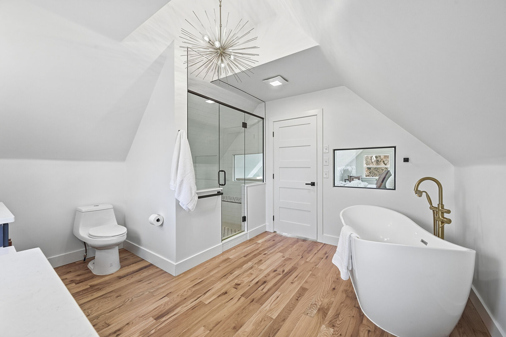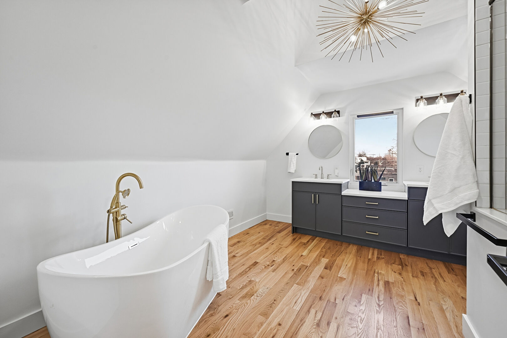 Baseboards Wall, Cathedral Ceiling, Double Vanity, Drywall, Full Bathroom, Natural Light, Notable Chandelier, Vanity, Vaulted Ceiling, Wood Finish Floor, Baseboards Wall, Double Vanity