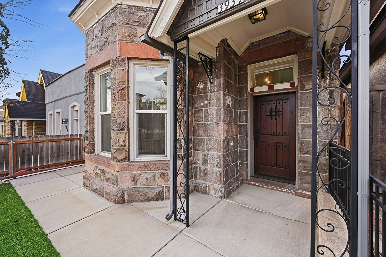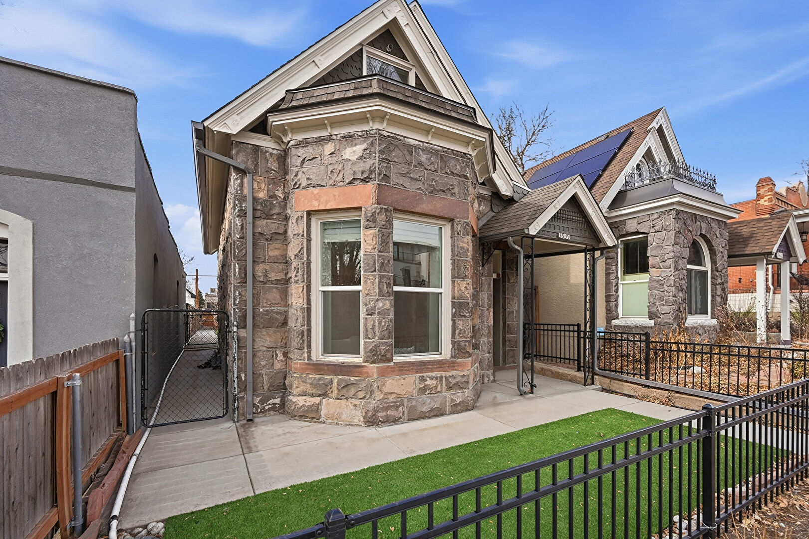 Chimney, Downspout, Fence, Gate, Gutters, Lawn, Shingle Roof, Stone Siding, Stoop, Fence, Gate
