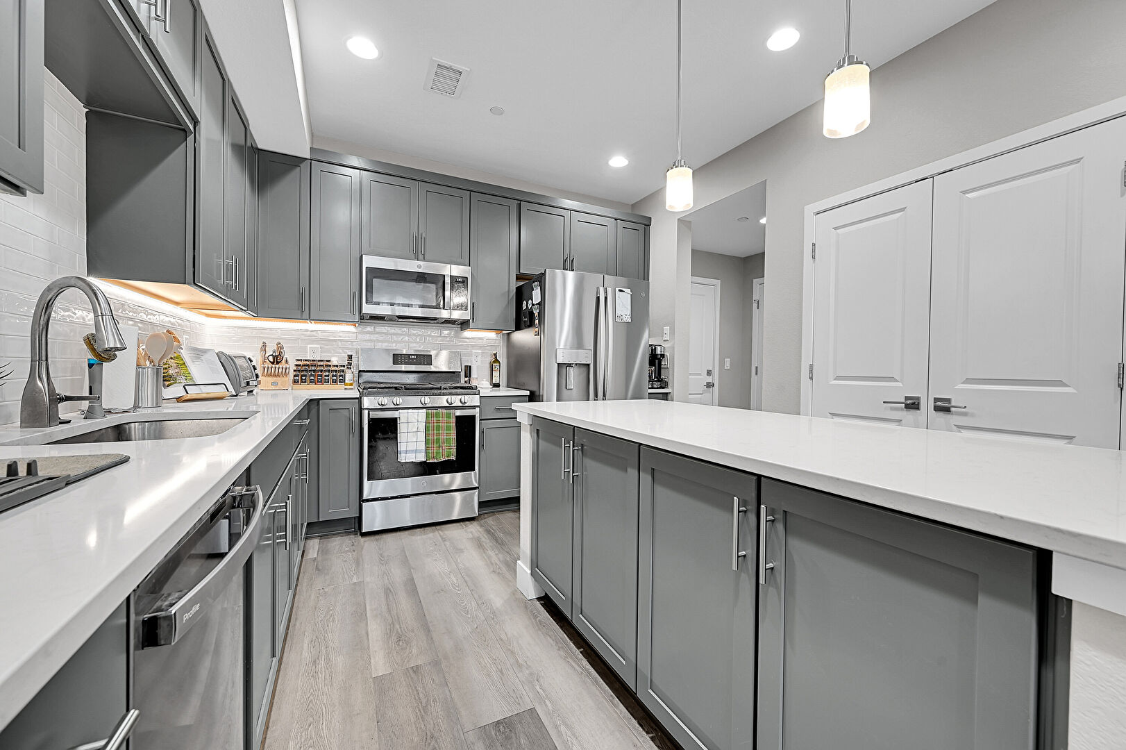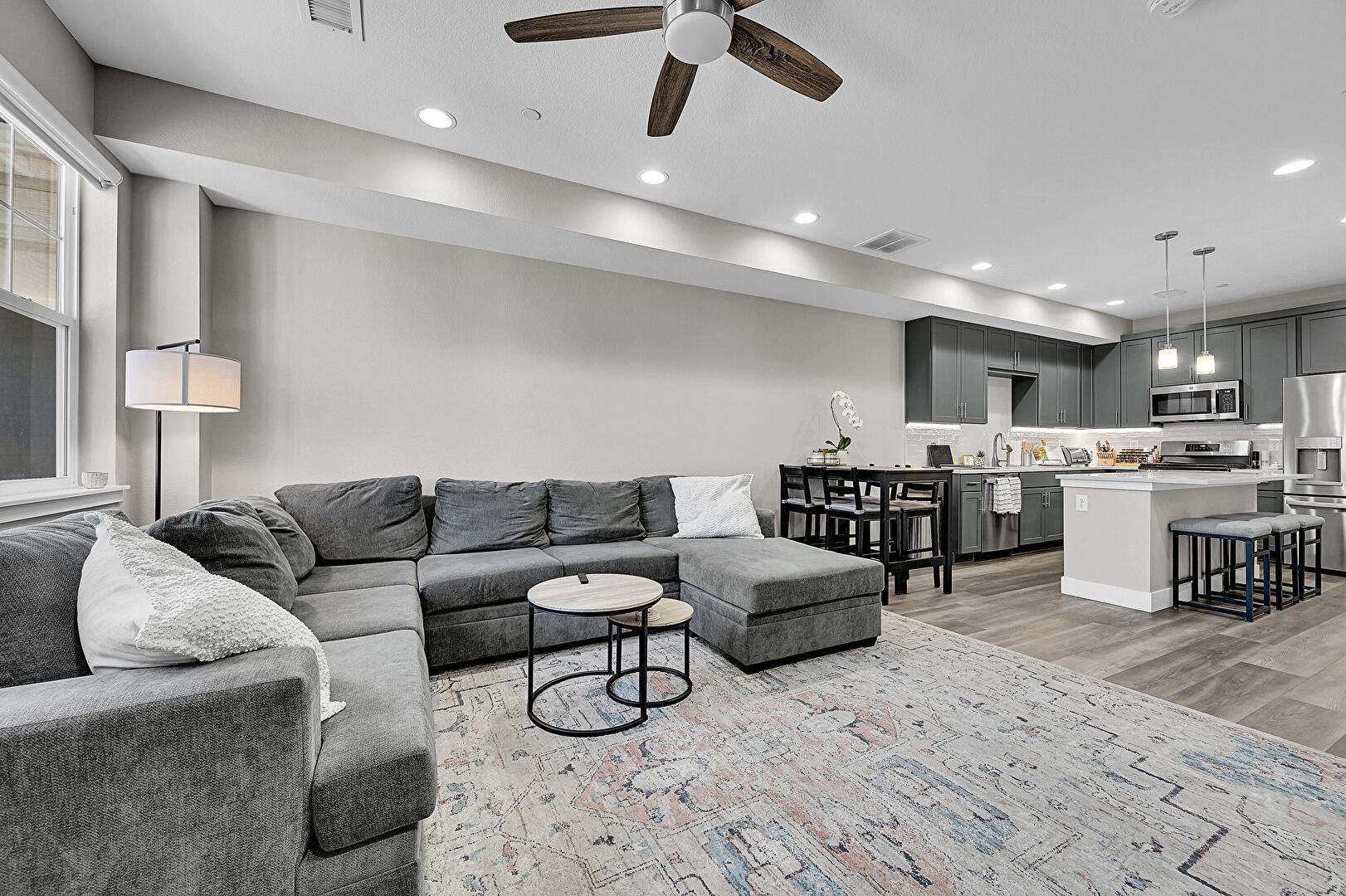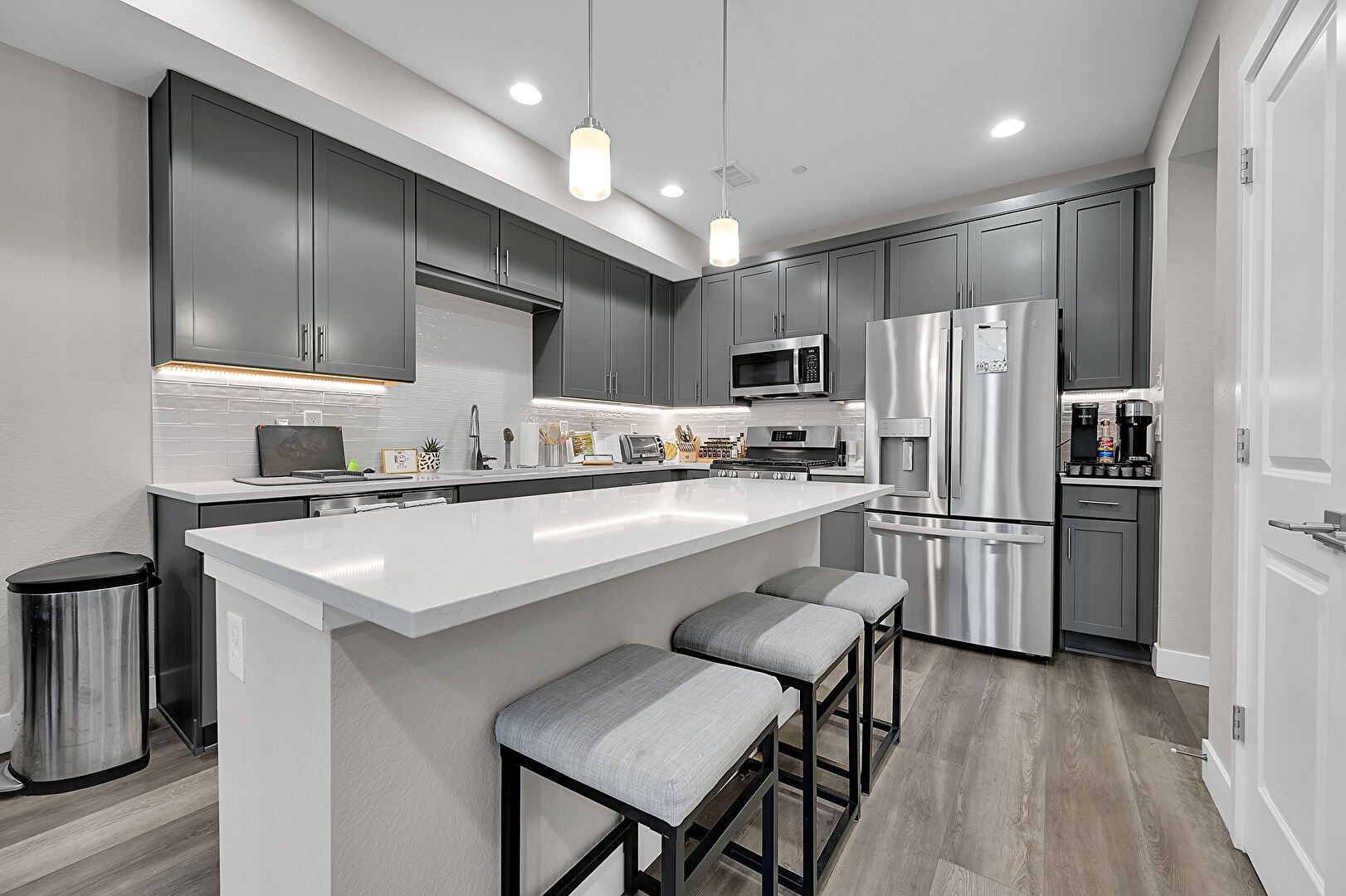 Baseboards Wall, Ceiling Fan, Drywall, Gray Cabinets, Kitchen Bar, Kitchen Island, Natural Light, Opens To Living Area, Pendant Lighting, Recessed Lighting, Shaker Cabinets, Stone Countertops, Toaster, Vent, Wood Finish Floor, L Shaped Kitchen, Pendant Lighting, Shaker Cabinets