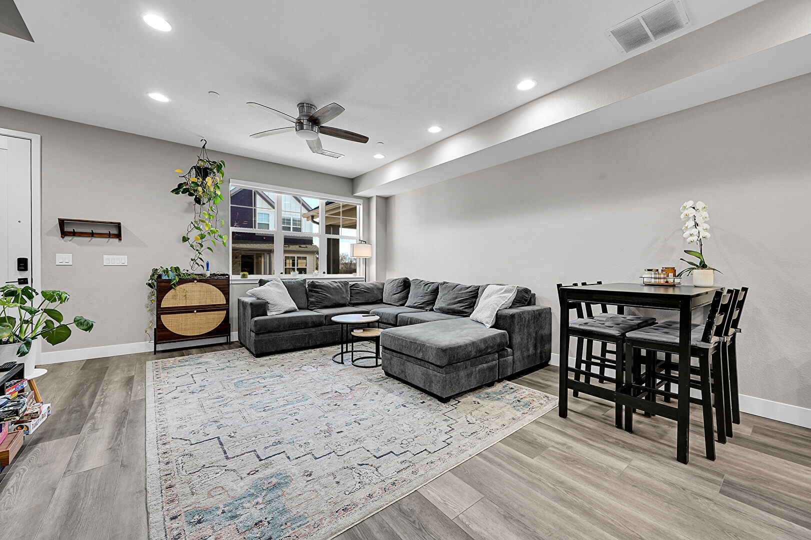 Baseboards Wall, Ceiling Fan, Drywall, Natural Light, Recessed Lighting, Stairs, Vent, Wood Finish Floor, L Shaped Kitchen, Vent, Wine Cooler