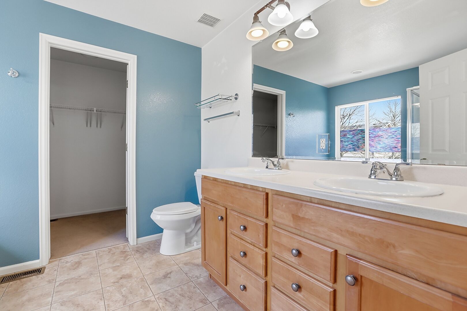 Baseboards Wall, Combined Bath Shower, Double Vanity, Drywall, Full Bathroom, Natural Light, Textured Wall, Tile Floor, Vanity, Vent, Vinyl Floor, Walk In Closet, Drywall, Full Bathroom, Half Bathroom, Tile Floor