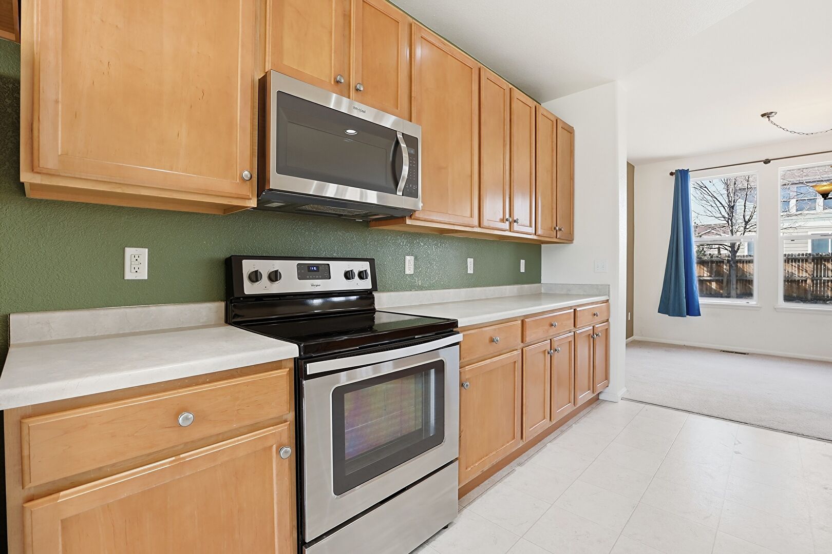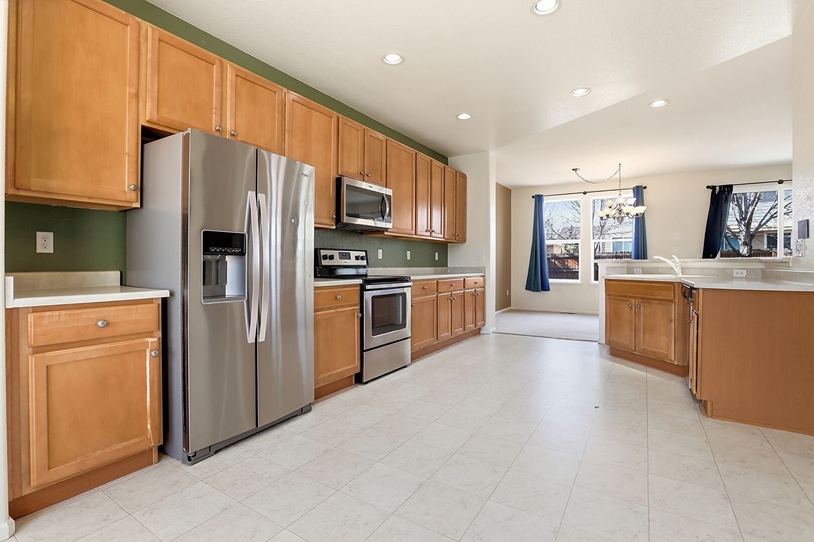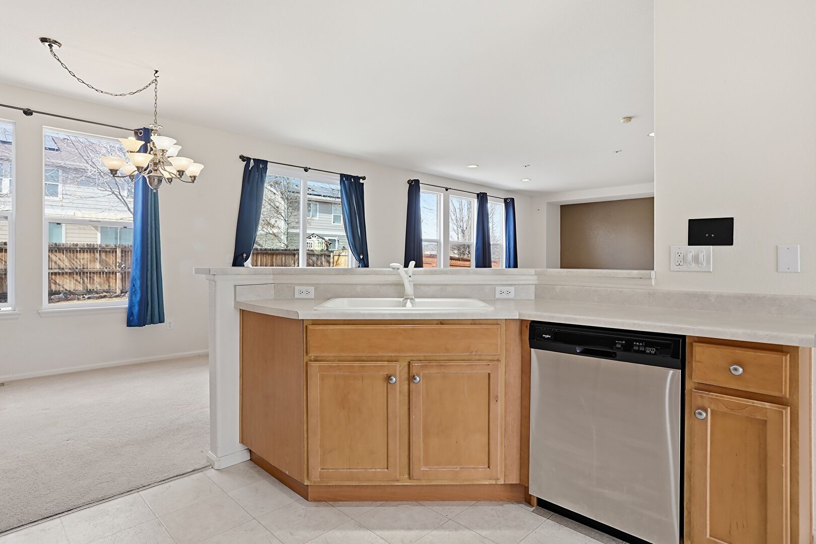 Baseboards Wall, Carpet, Drywall, Galley Kitchen, Kitchen Peninsula, Medium Brown Cabinets, Natural Light, Notable Chandelier, Opens To Living Area, Pendant Lighting, Raised Cabinets, Recessed Lighting, Shaker Cabinets, Textured Wall, Tile Floor, Vent, Vinyl Floor, Carpet, Drywall, Natural Light, Notable Chandelier, Recessed Lighting, Shaker Cabinets