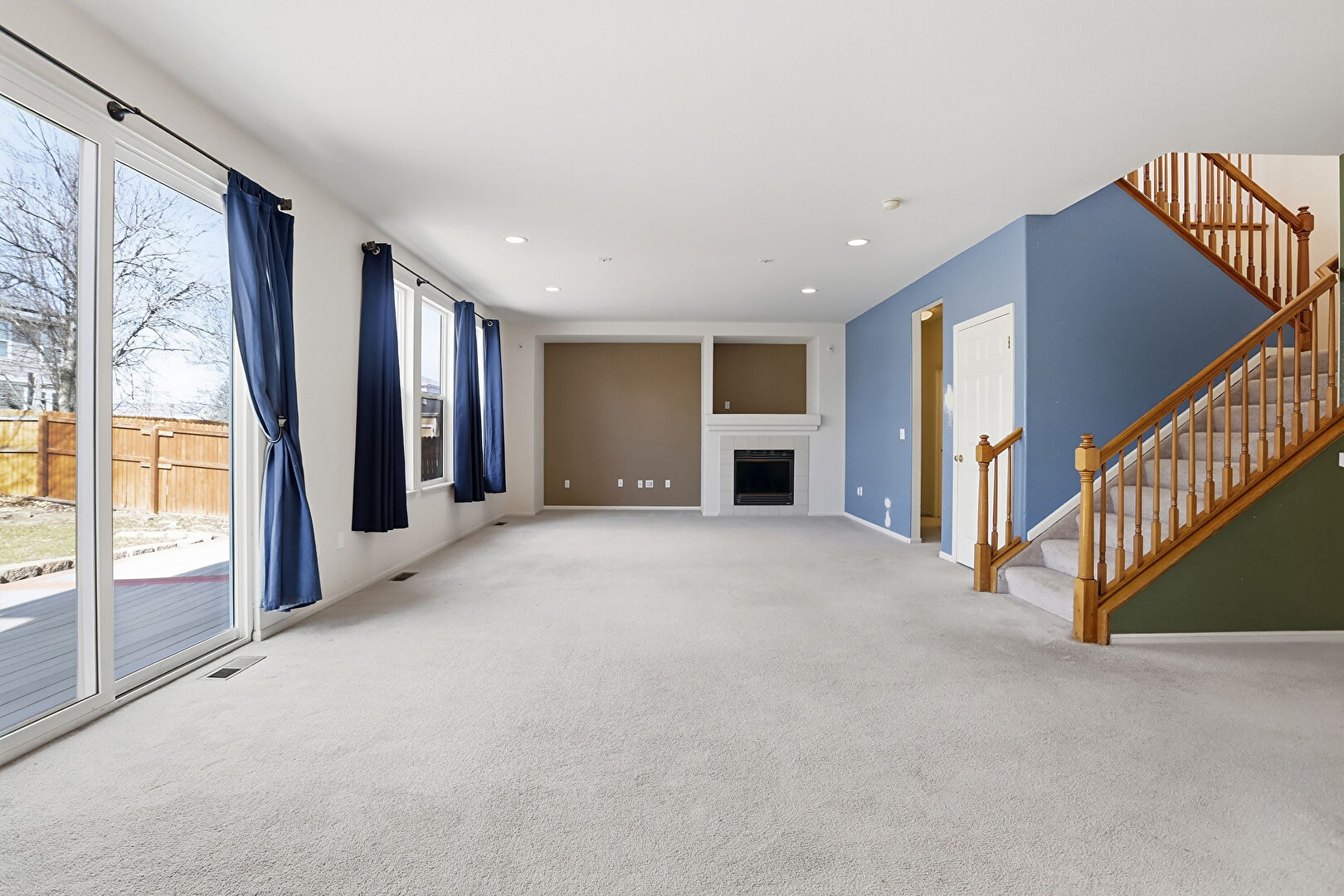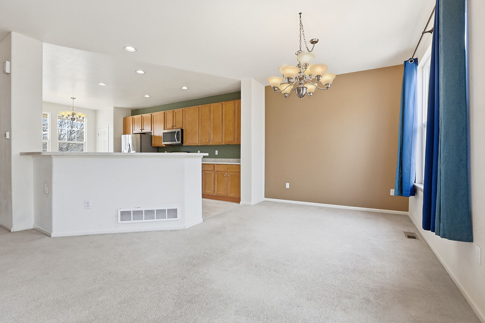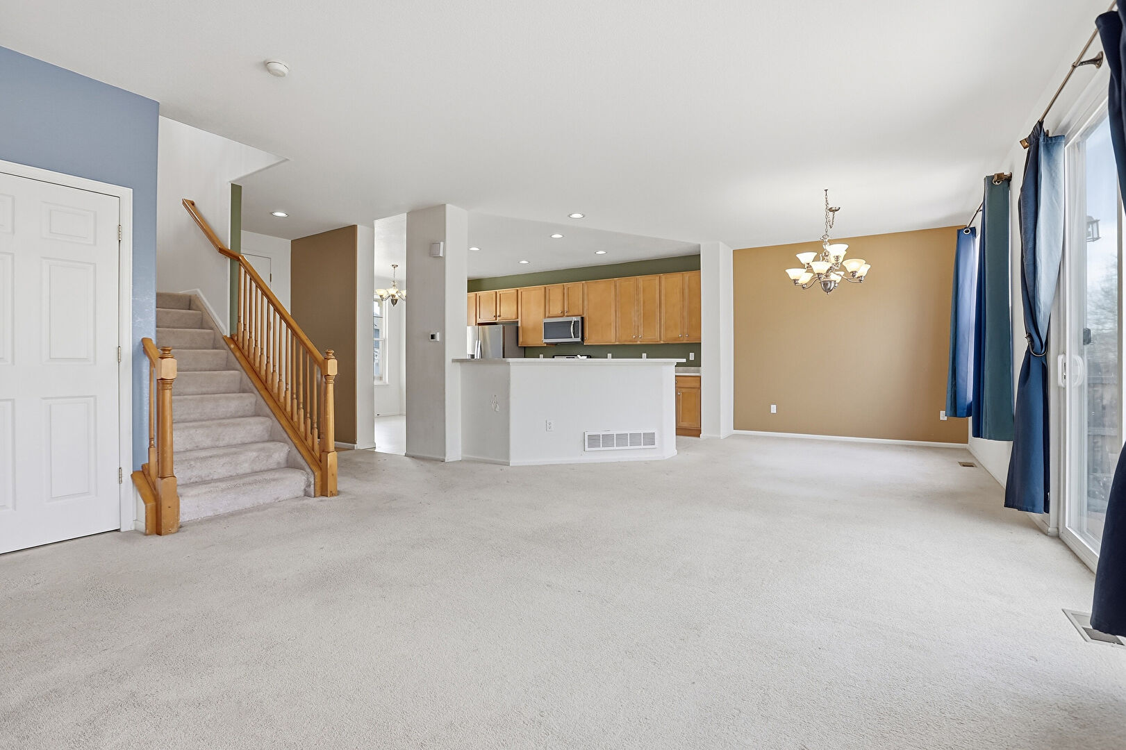 Baseboards Wall, Carpet, Drywall, Fireplace, L Shaped Kitchen, Natural Light, Notable Chandelier, Recessed Lighting, Stairs, Vent, Baseboards Wall, Carpet, Fireplace, Recessed Lighting, Vent