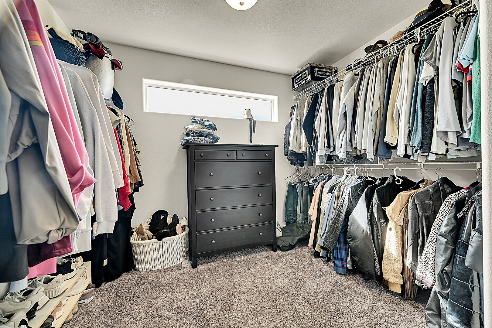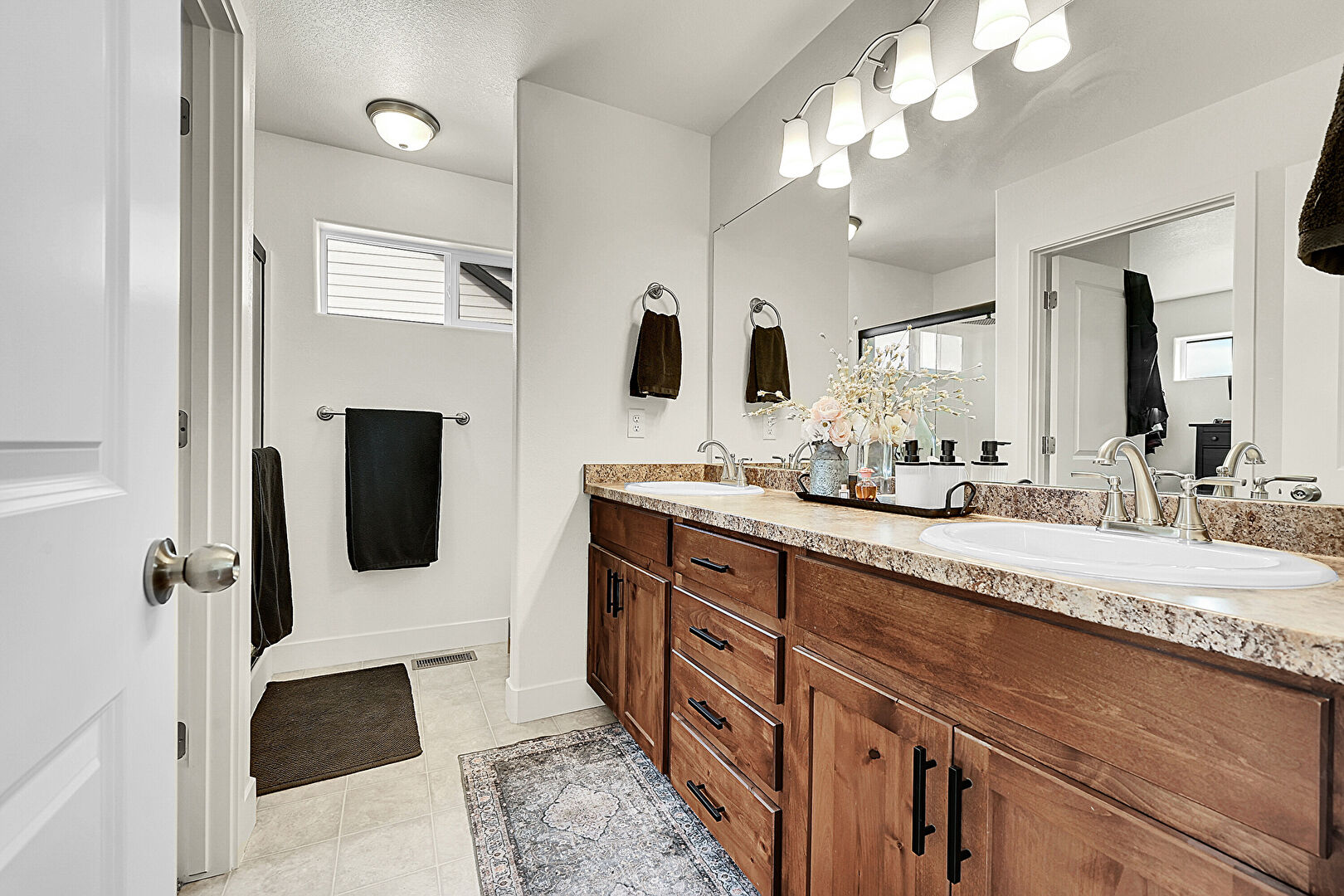 Baseboards Wall, Double Vanity, Drywall, Ensuite Bathroom, Full Bathroom, Natural Light, Textured Ceiling, Tile Floor, Vent, Walk In Closet, Carpet, Tile Floor