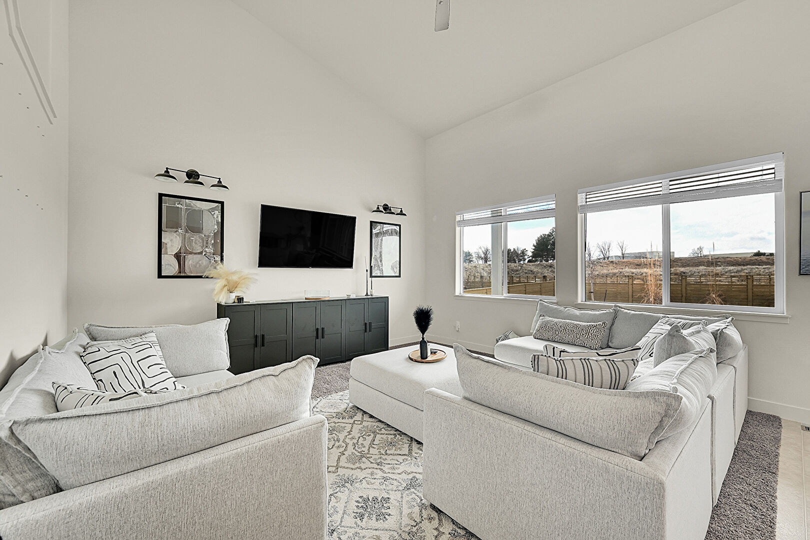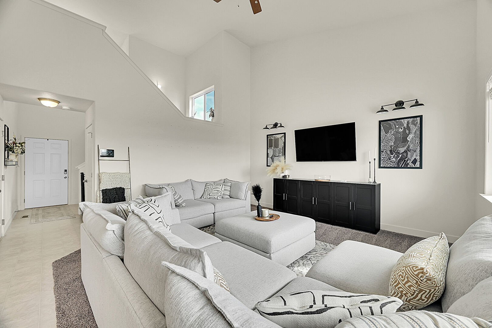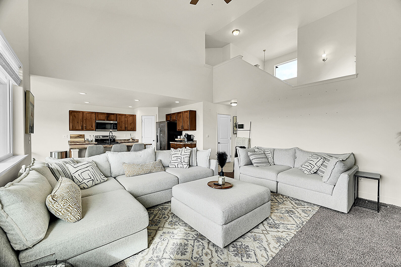 Baseboards Wall, Carpet, Ceiling Fan, Drywall, High Ceiling, L Shaped Kitchen, Natural Light, Recessed Lighting, Vaulted Ceiling, Ceiling Fan, Natural Light, Recessed Lighting, Vinyl Floor