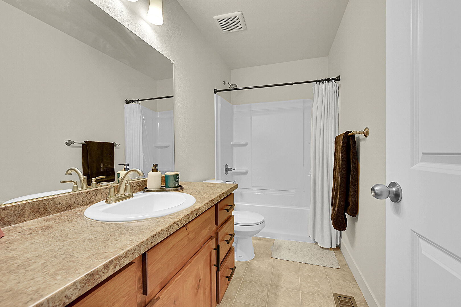 Baseboards Wall, Combined Bath Shower, Drywall, Tile Floor, Vanity, Vent, Full Bathroom