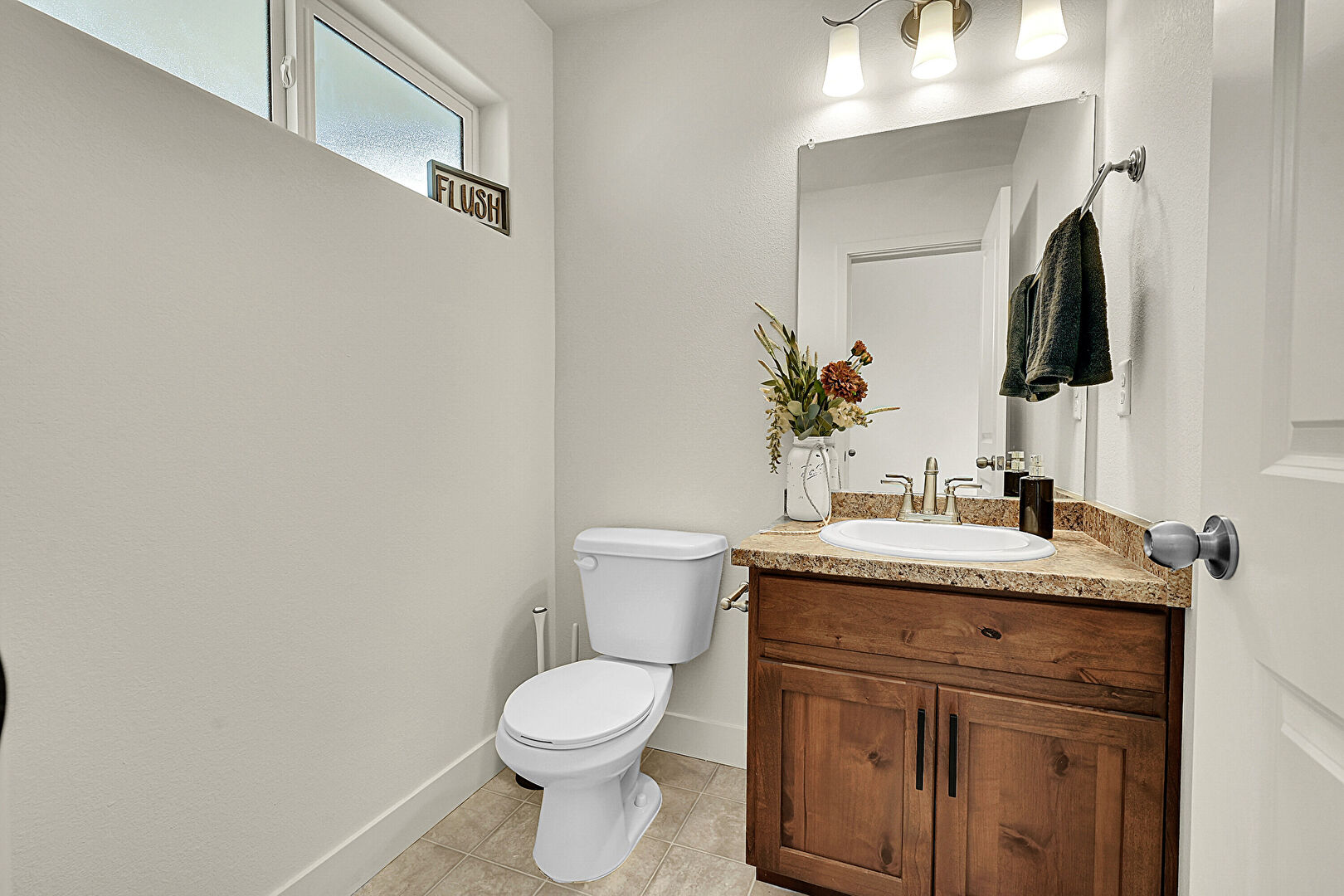 Baseboards Wall, Half Bathroom, Natural Light, Tile Floor, Vanity, Drywall
