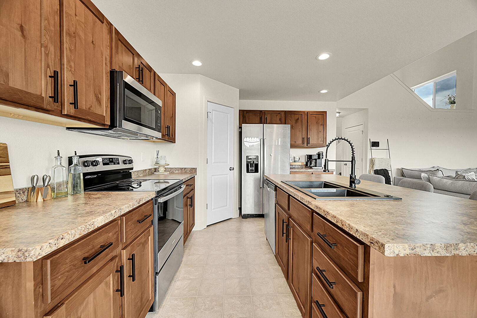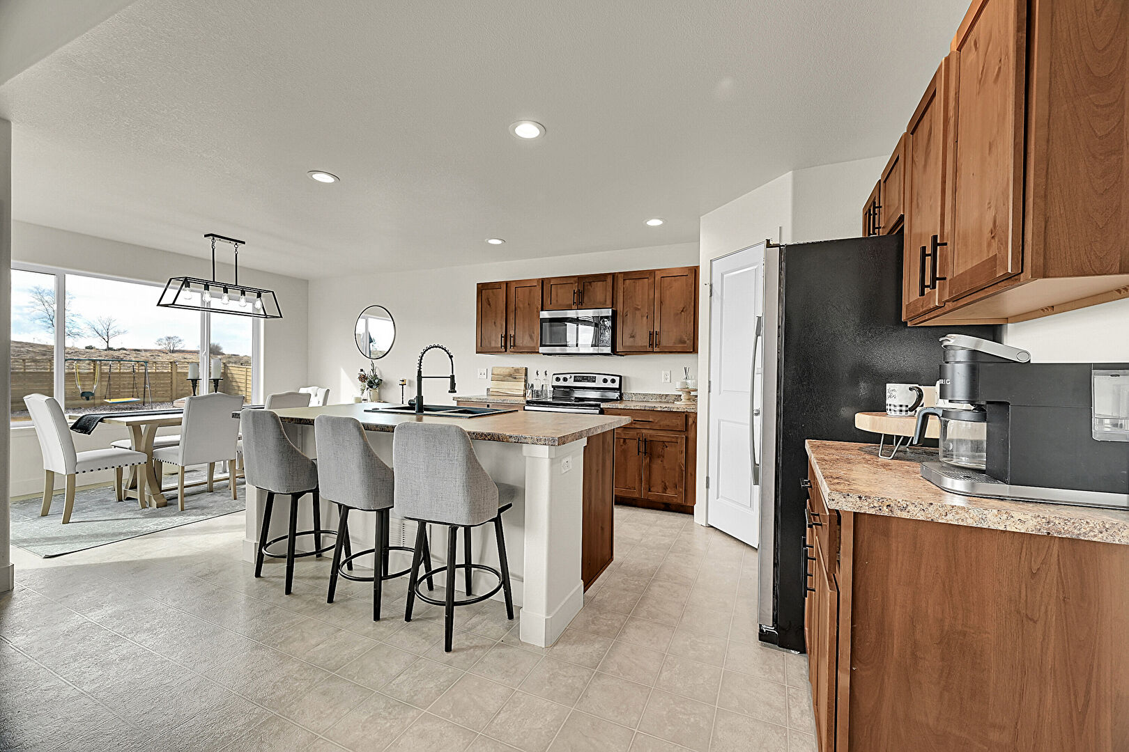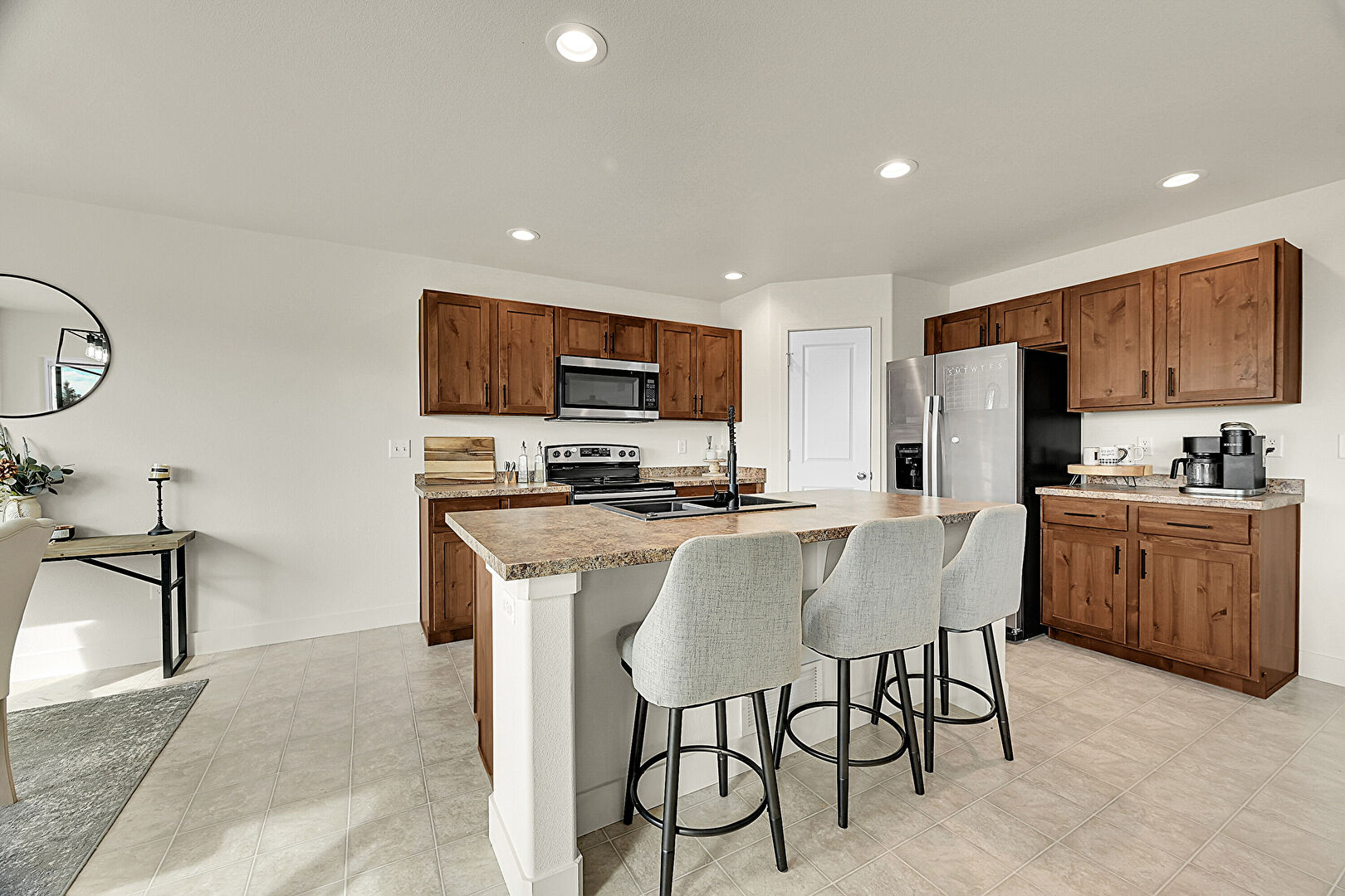 Baseboards Wall, Drywall, Kitchen Bar, Kitchen Island, L Shaped Kitchen, Medium Brown Cabinets, Natural Light, Opens To Living Area, Pendant Lighting, Recessed Lighting, Shaker Cabinets, Vinyl Floor, Kitchen Bar, Kitchen Island, Recessed Lighting, Vinyl Floor