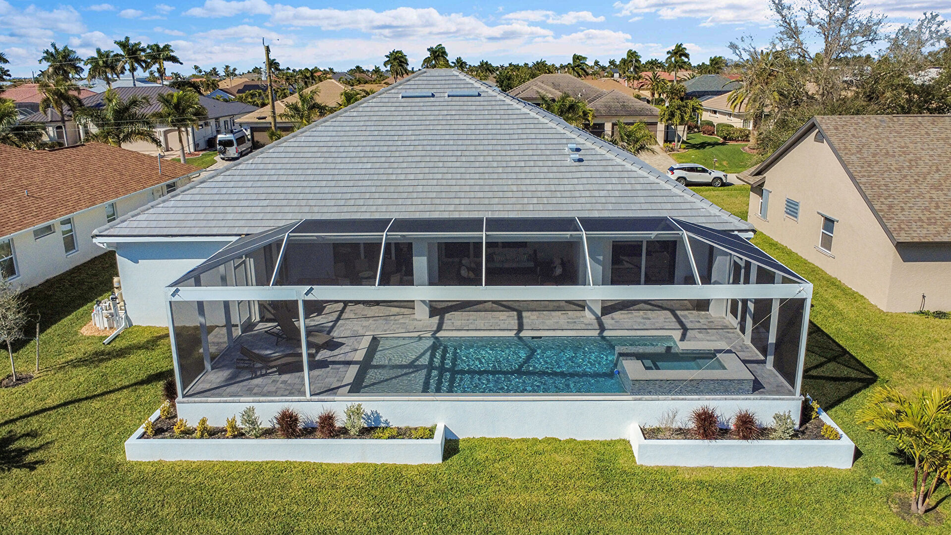 Lanai, Lawn, Pool, Pool Hot Tub Combo, Residential View, Sunroom, Hot Tub