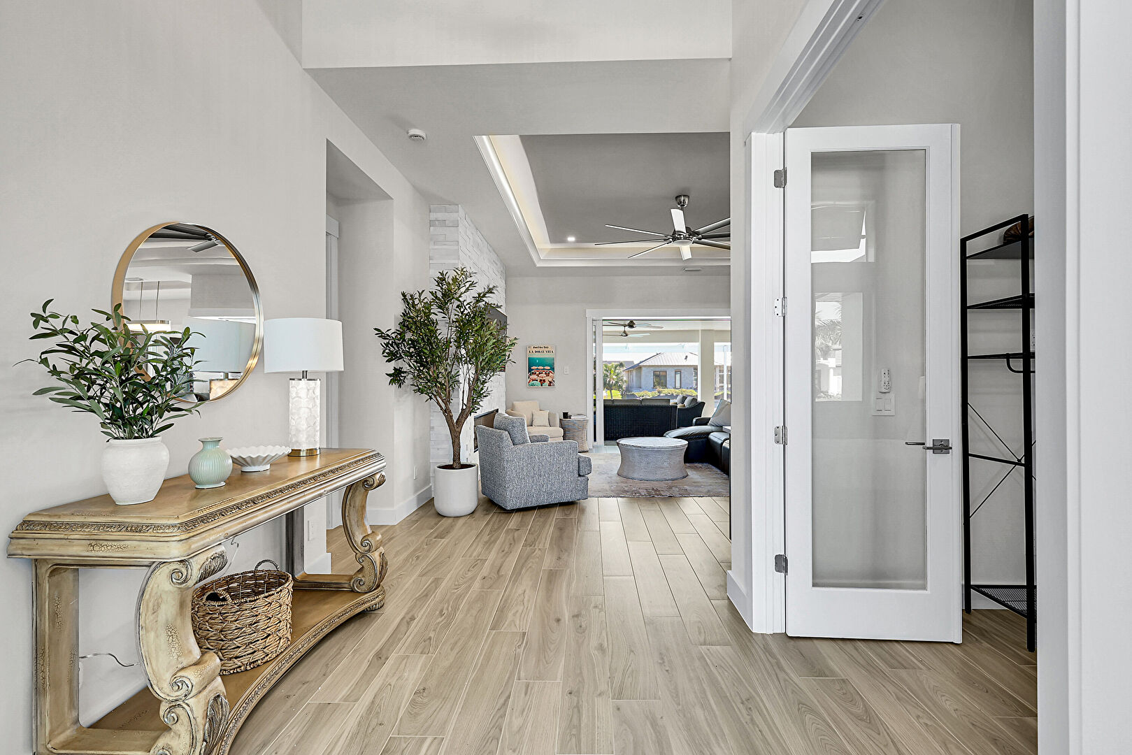 Baseboards Wall, Ceiling Fan, Drywall, French Doors, Natural Light, Notable Chandelier, Tray Ceiling, Wood Finish Floor, High Ceiling, Wood Finish Floor