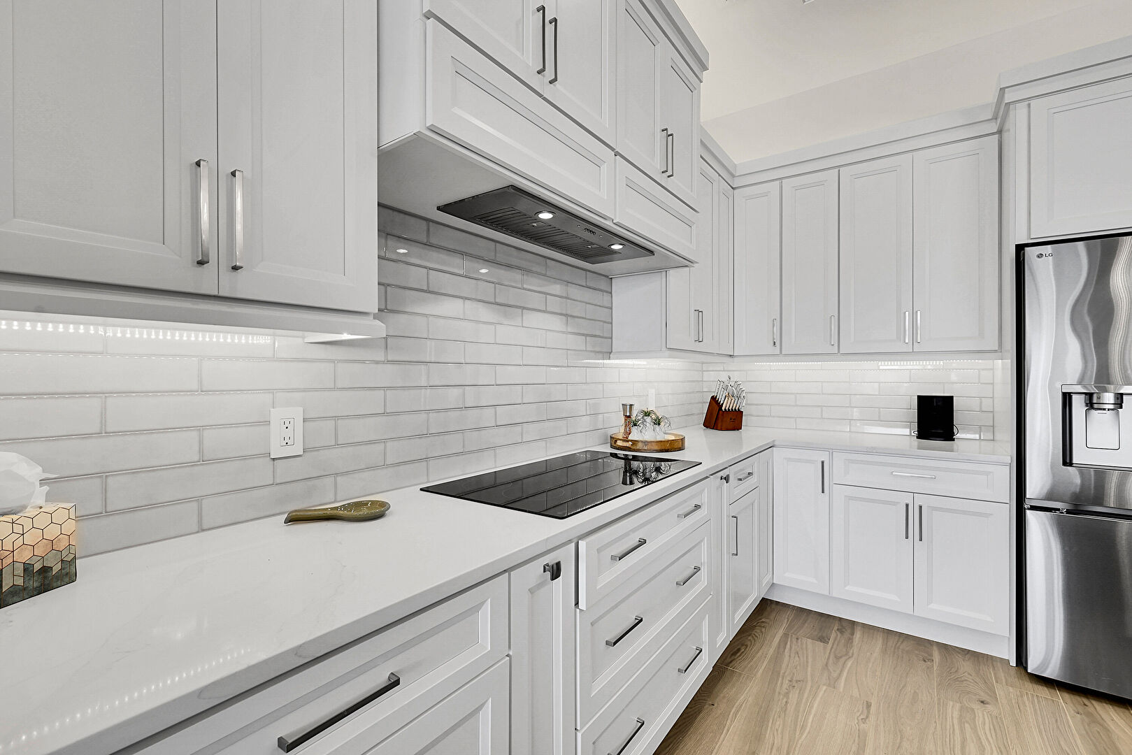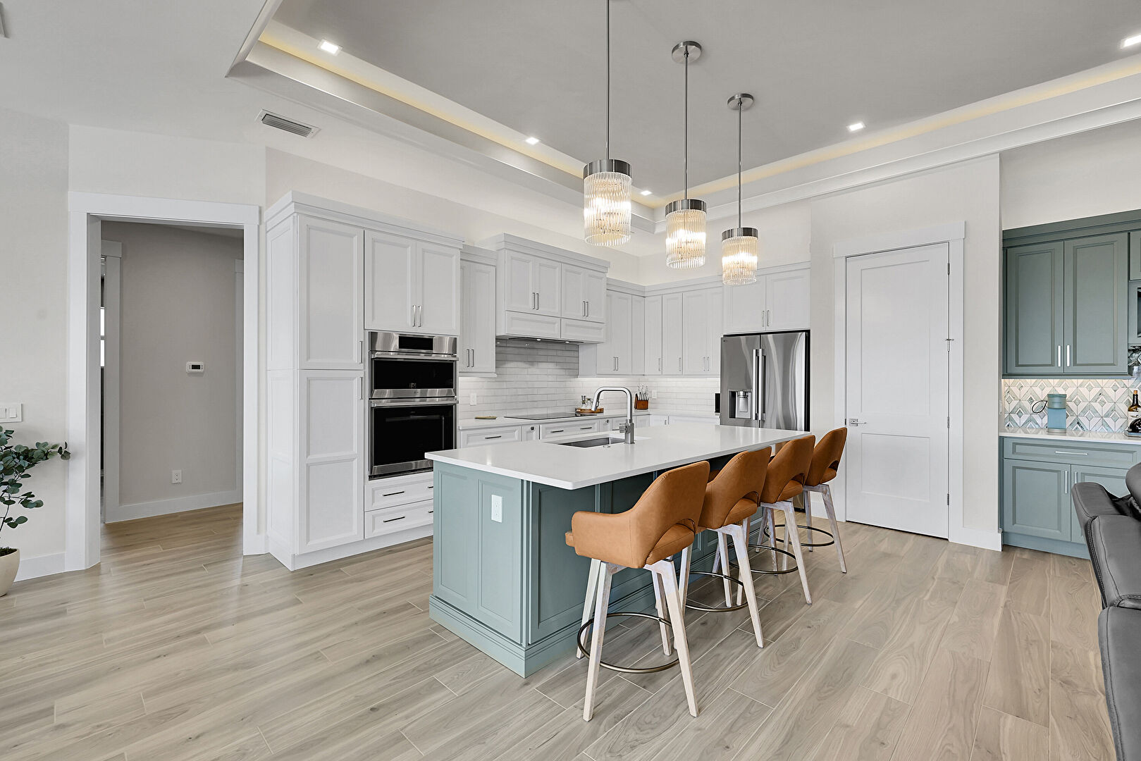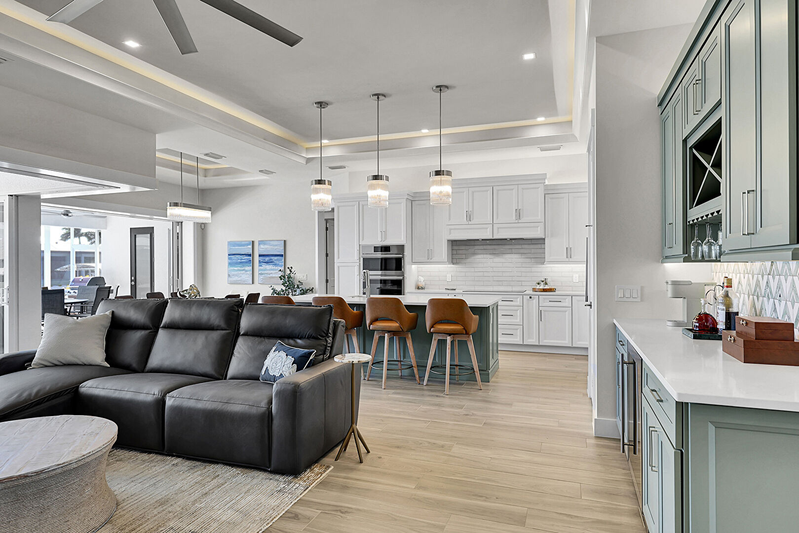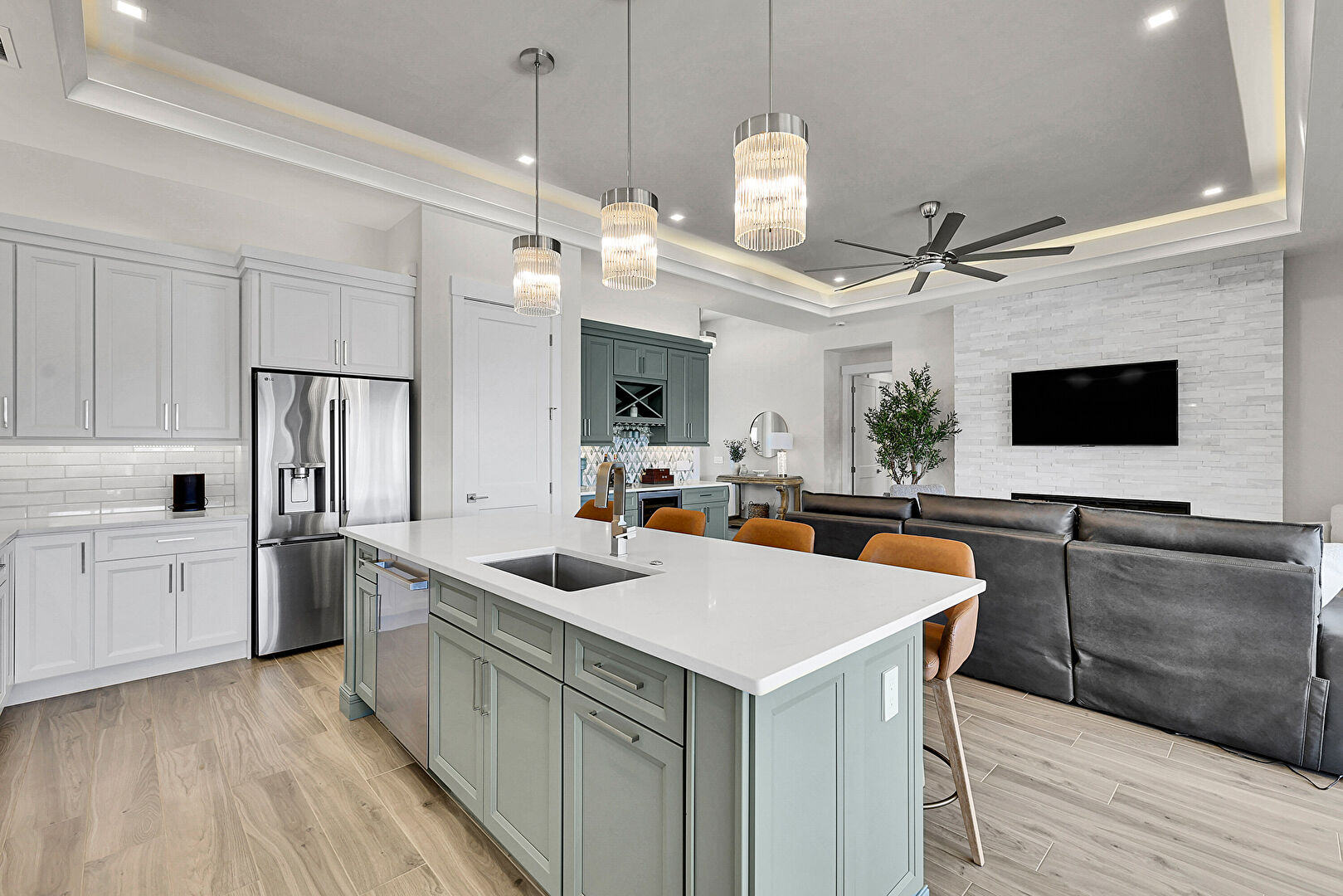 Baseboards Wall, Ceiling Fan, Crown Molding Cabinets, Double Oven, Drywall, Gray Cabinets, Green Cabinets, High Ceiling, Kitchen Bar, Kitchen Island, L Shaped Kitchen, Natural Light, Opens To Living Area, Pendant Lighting, Recessed Lighting, Shaker Cabinets, Stone Countertops, Tray Ceiling, Vent, Wine Cooler, Wood Finish Floor, Ceiling Fan, Crown Molding Cabinets, Drywall, Kitchen Bar, Wood Finish Floor