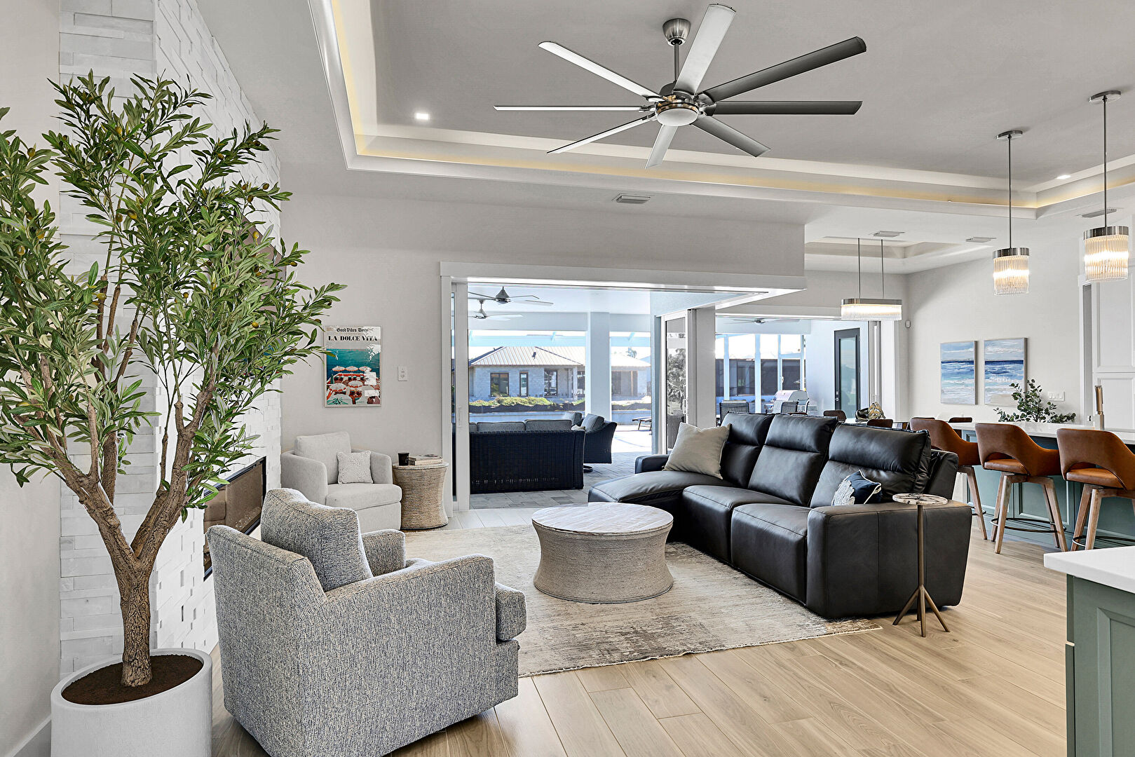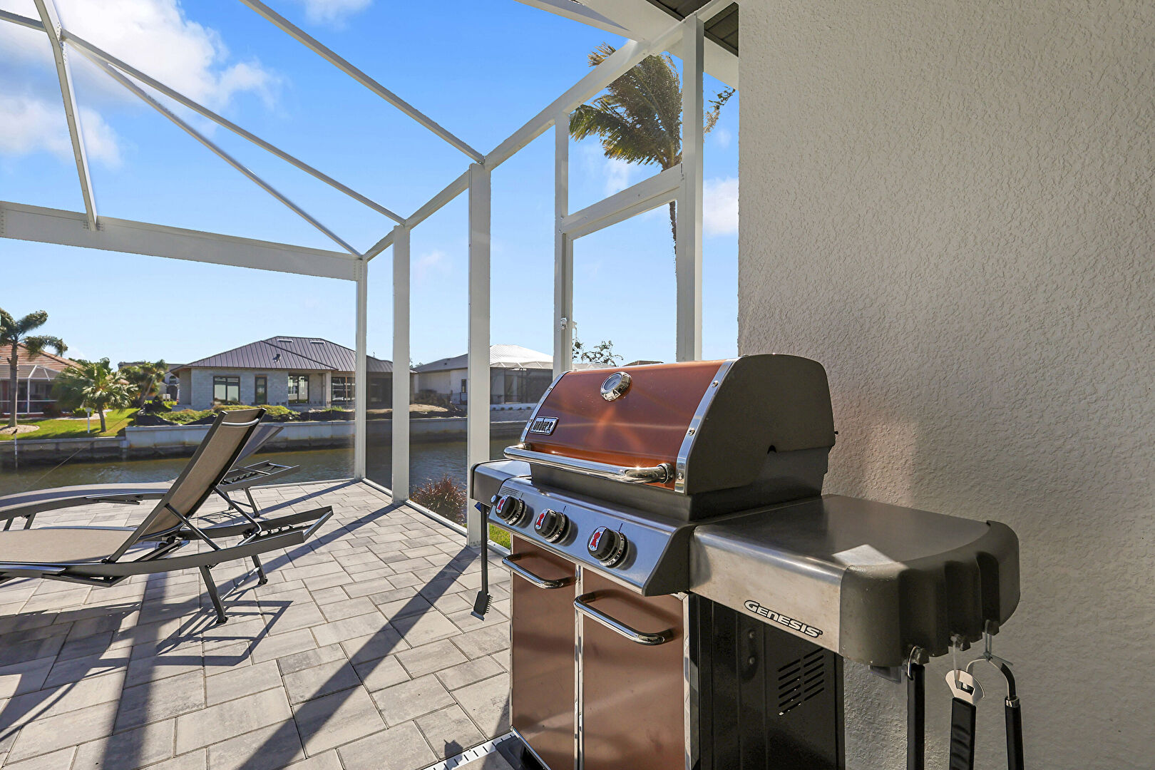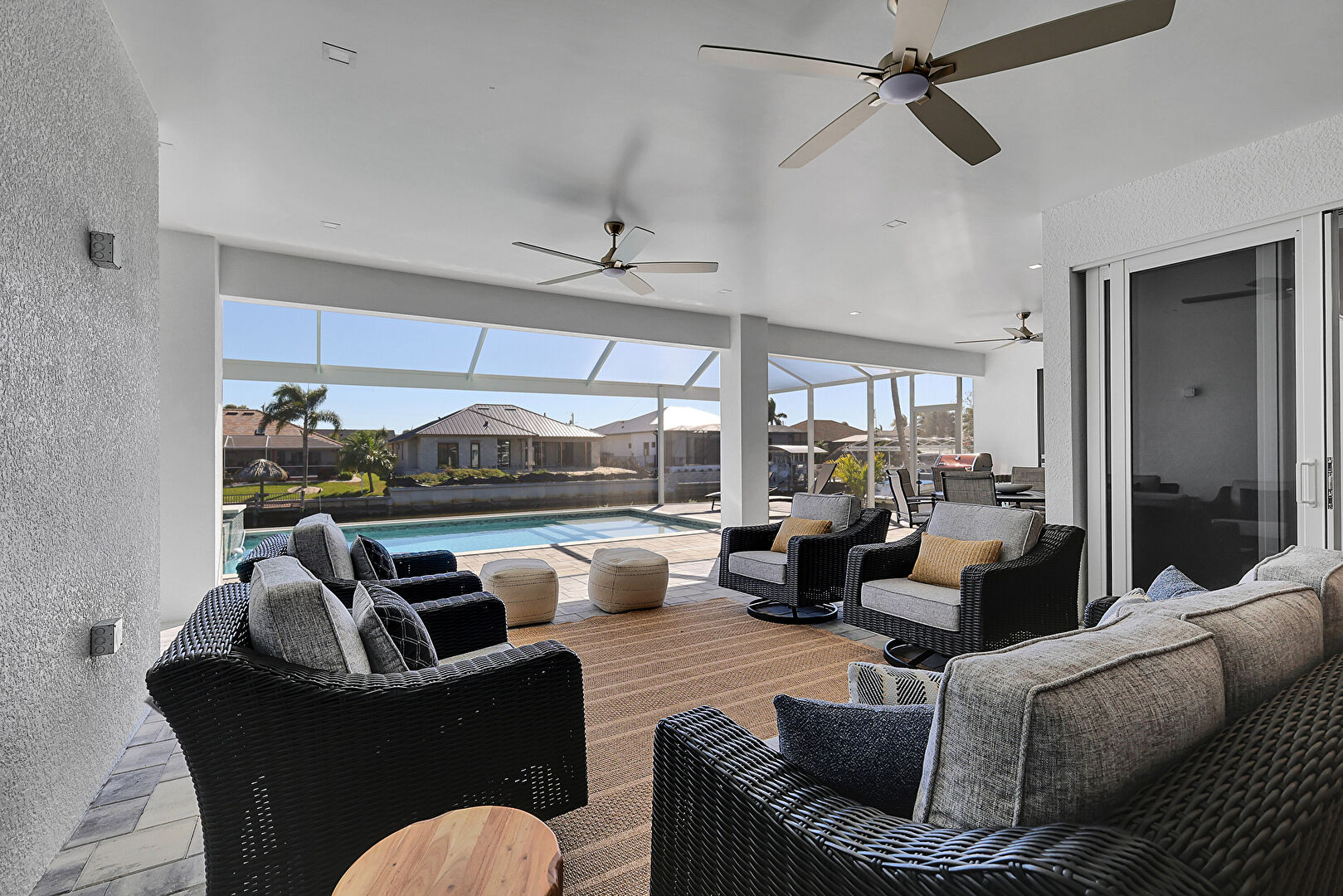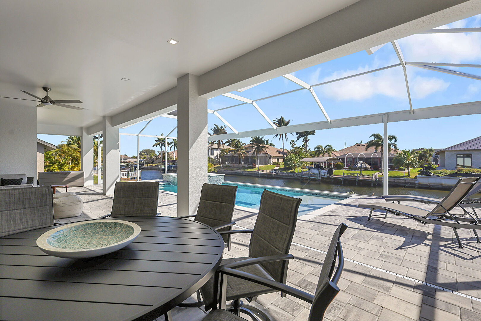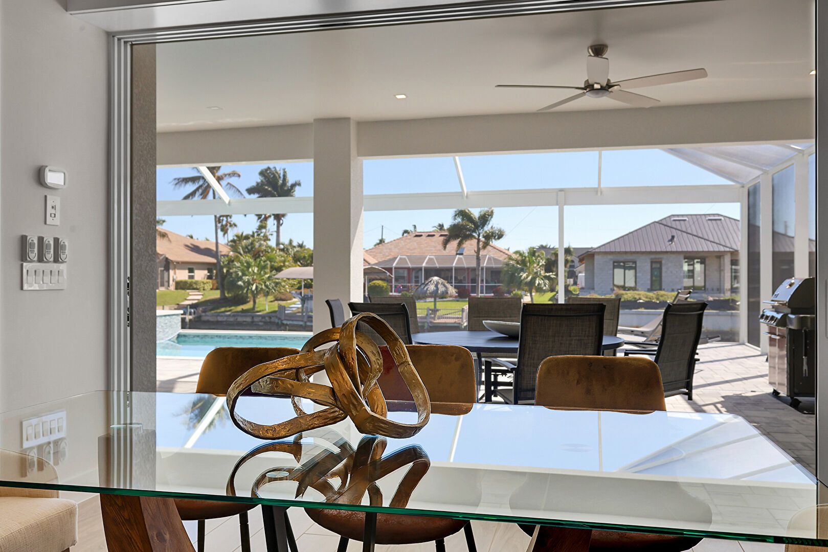Ceiling Fan, L Shaped Kitchen, Lanai, Outdoor Dining Area, Outdoor Living Space, Patio, Pool, Residential View, Sunroom, Water View, Waterfront, Grill, Outdoor Dining Area, Outdoor Living Space, Patio, Textured Wall, Water View