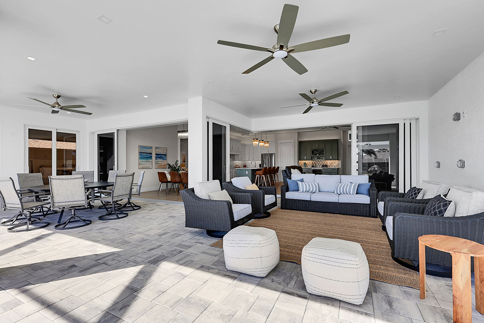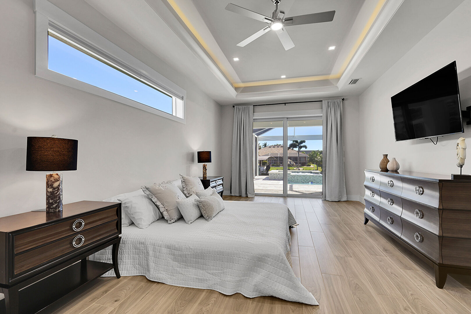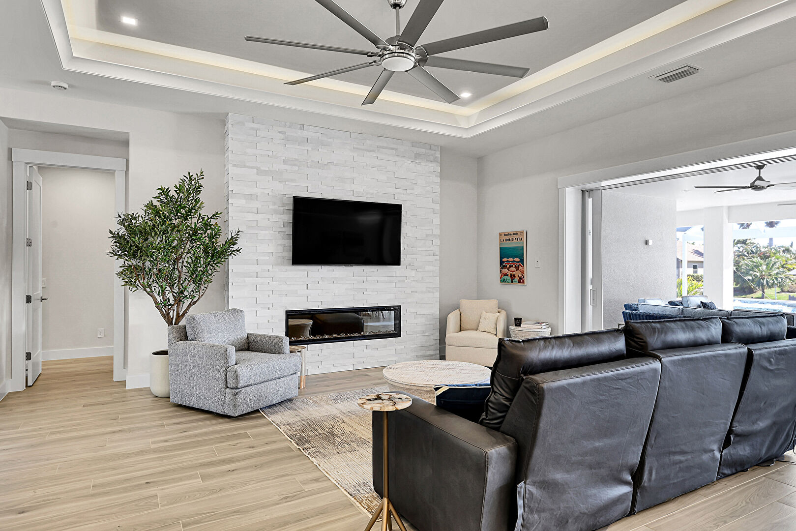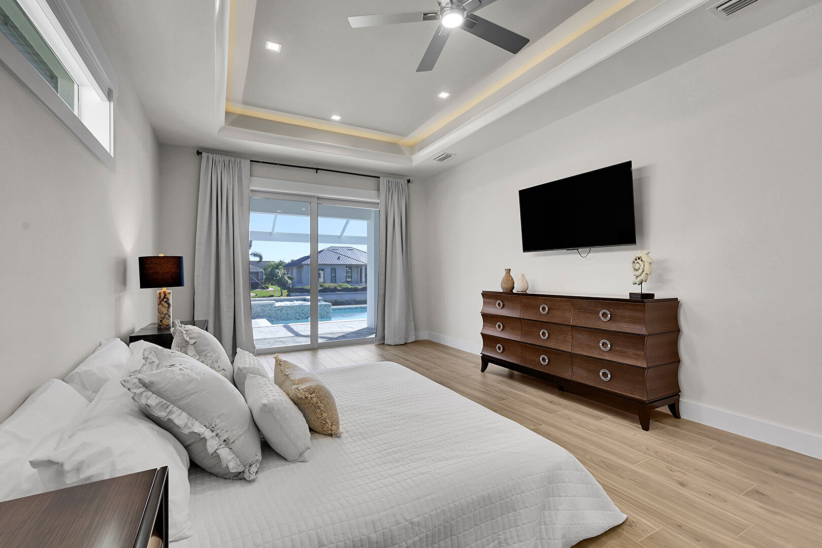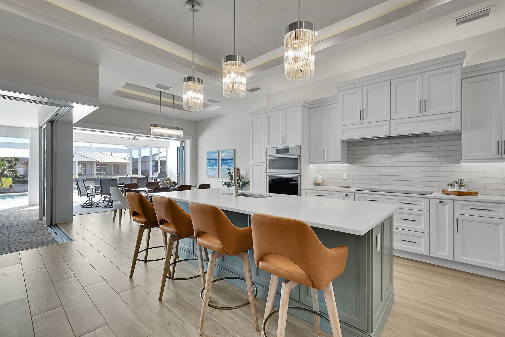 Ceiling Fan, L Shaped Kitchen, Lanai, Outdoor Dining Area, Outdoor Living Space, Patio, Pool, Residential View, Sunroom, Water View, Waterfront, Grill, Outdoor Dining Area, Outdoor Living Space, Patio, Textured Wall, Water View