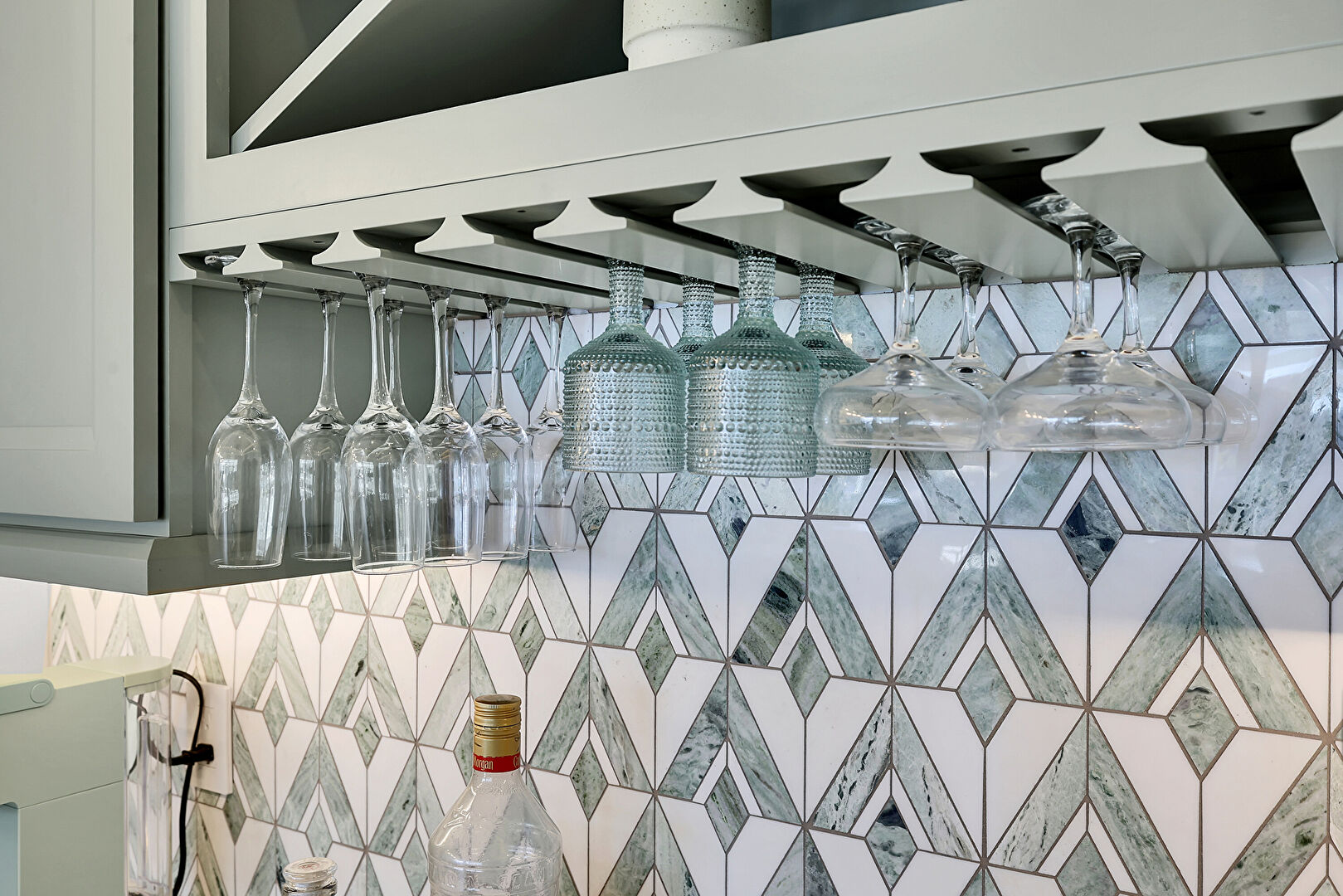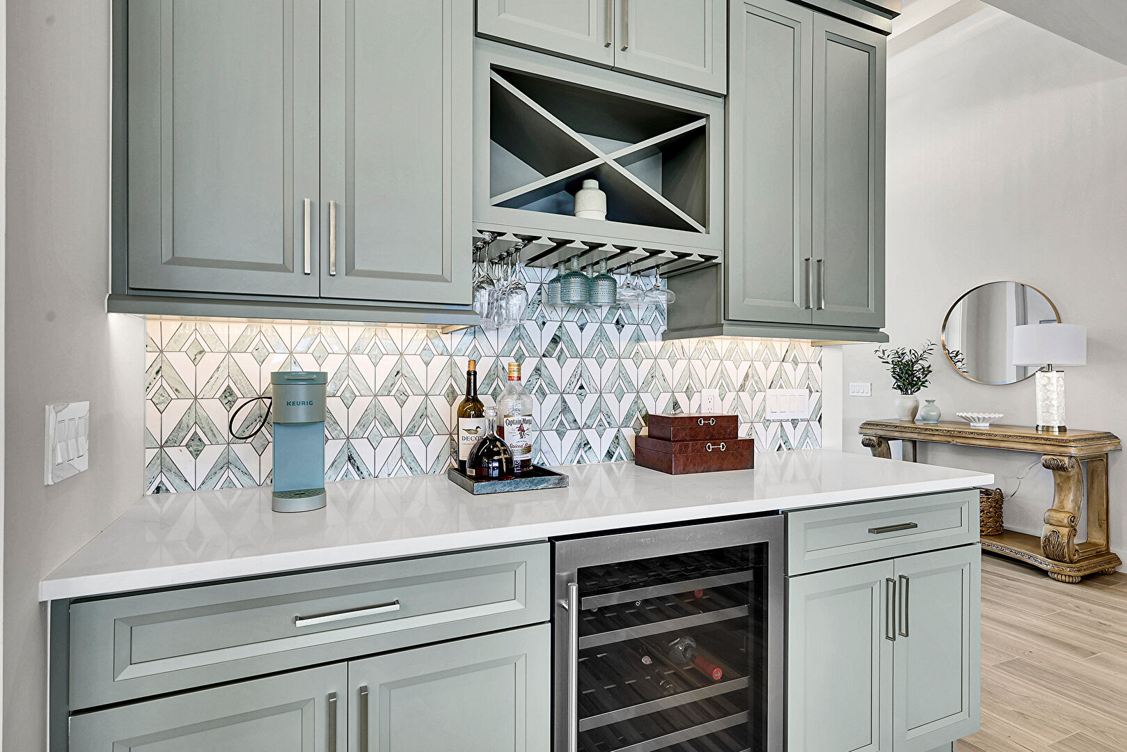 Crown Molding Cabinets, Drywall, Gray Cabinets, Indoor Bar, Stone Countertops, Wine Cooler, Wood Finish Floor, Shaker Cabinets