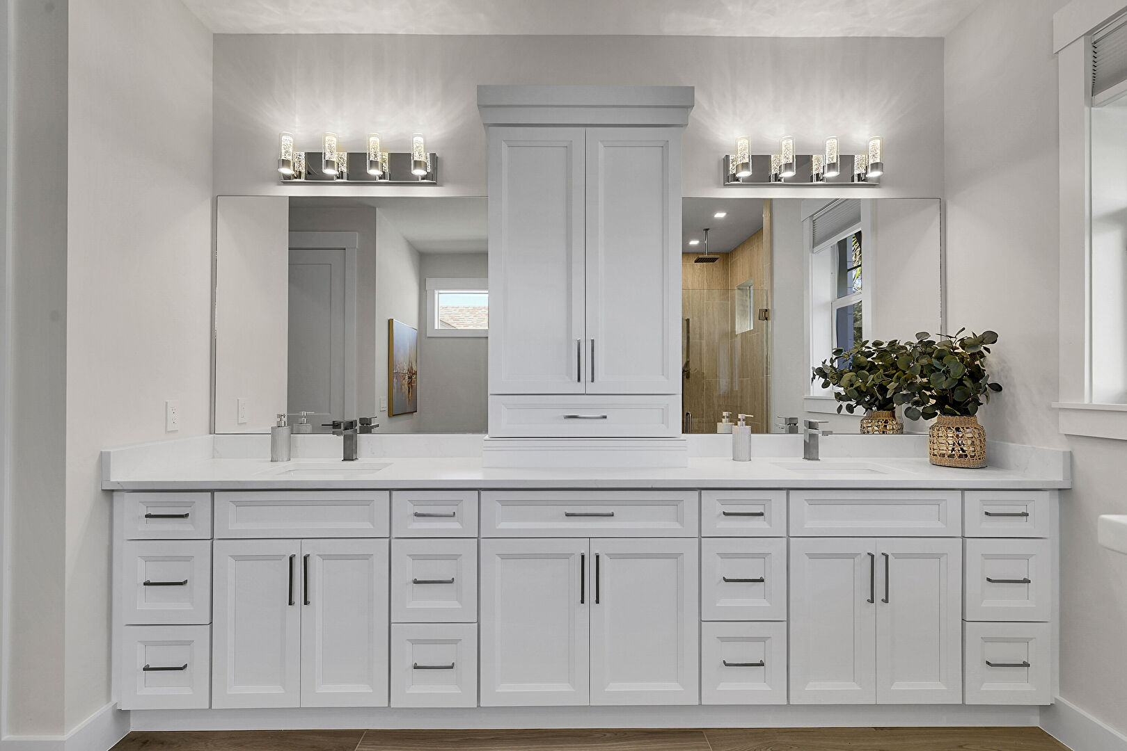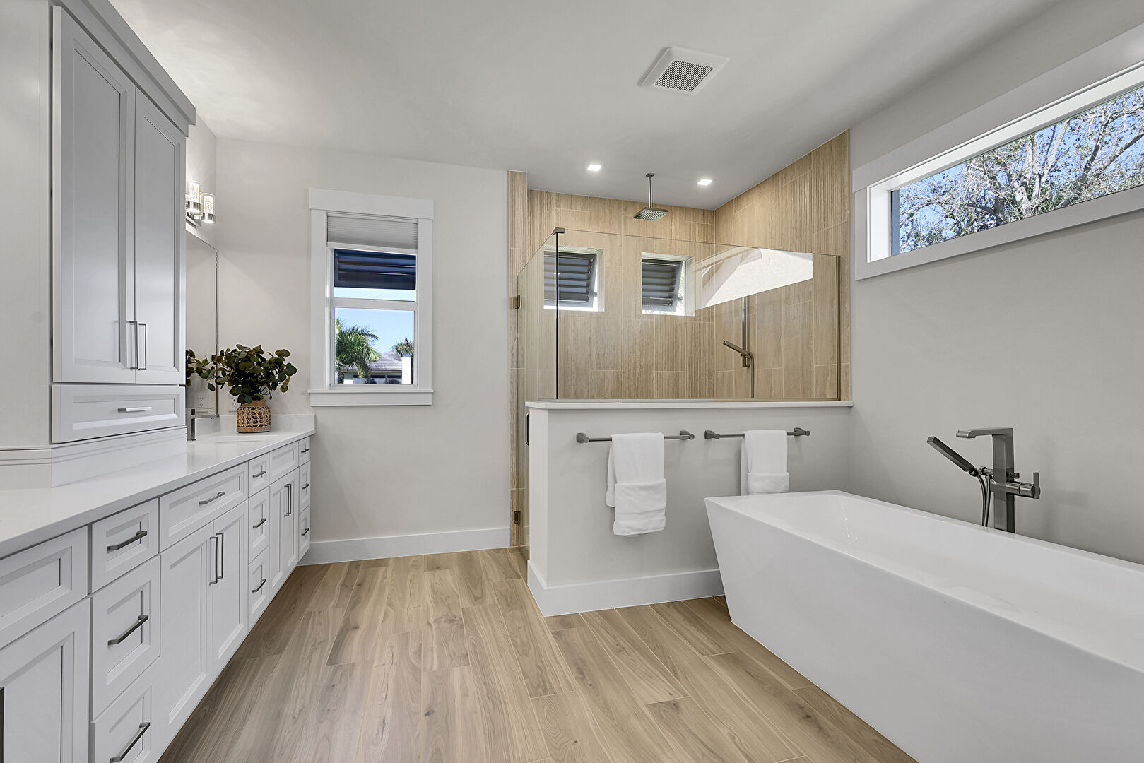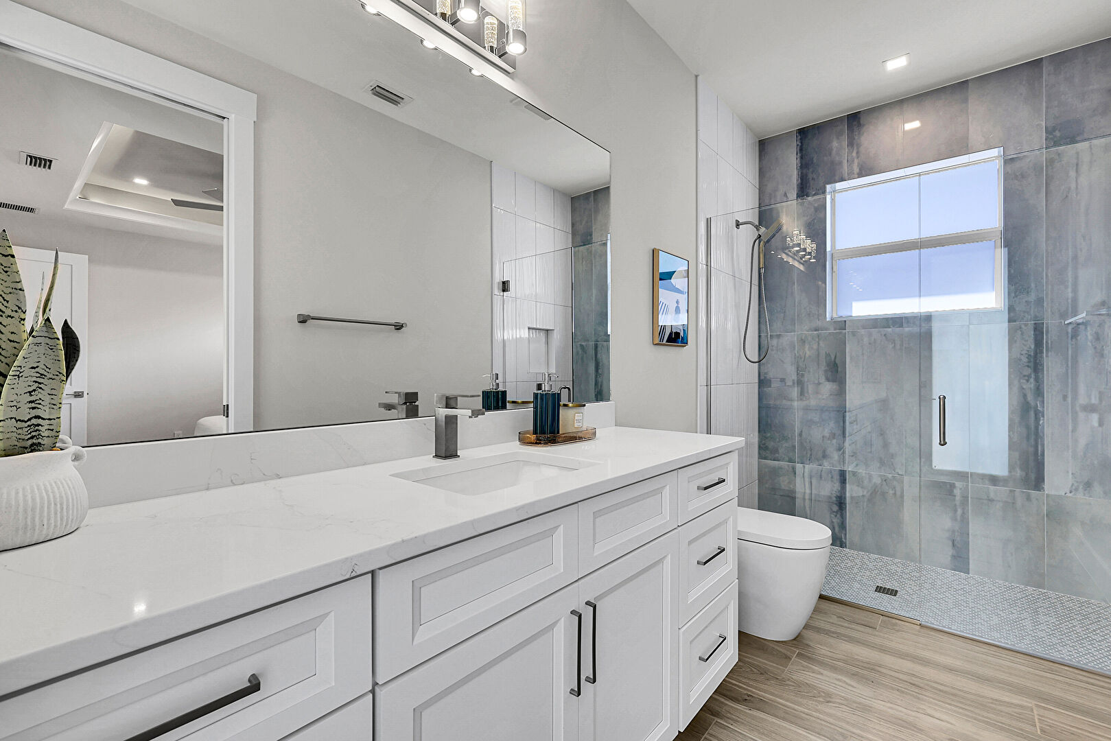 Baseboards Wall, Double Vanity, Drywall, Full Bathroom, Natural Light, Recessed Lighting, Vanity, Vent, Wood Finish Floor, Baseboards Wall, Drywall, Full Bathroom, Natural Light, Wood Finish Floor