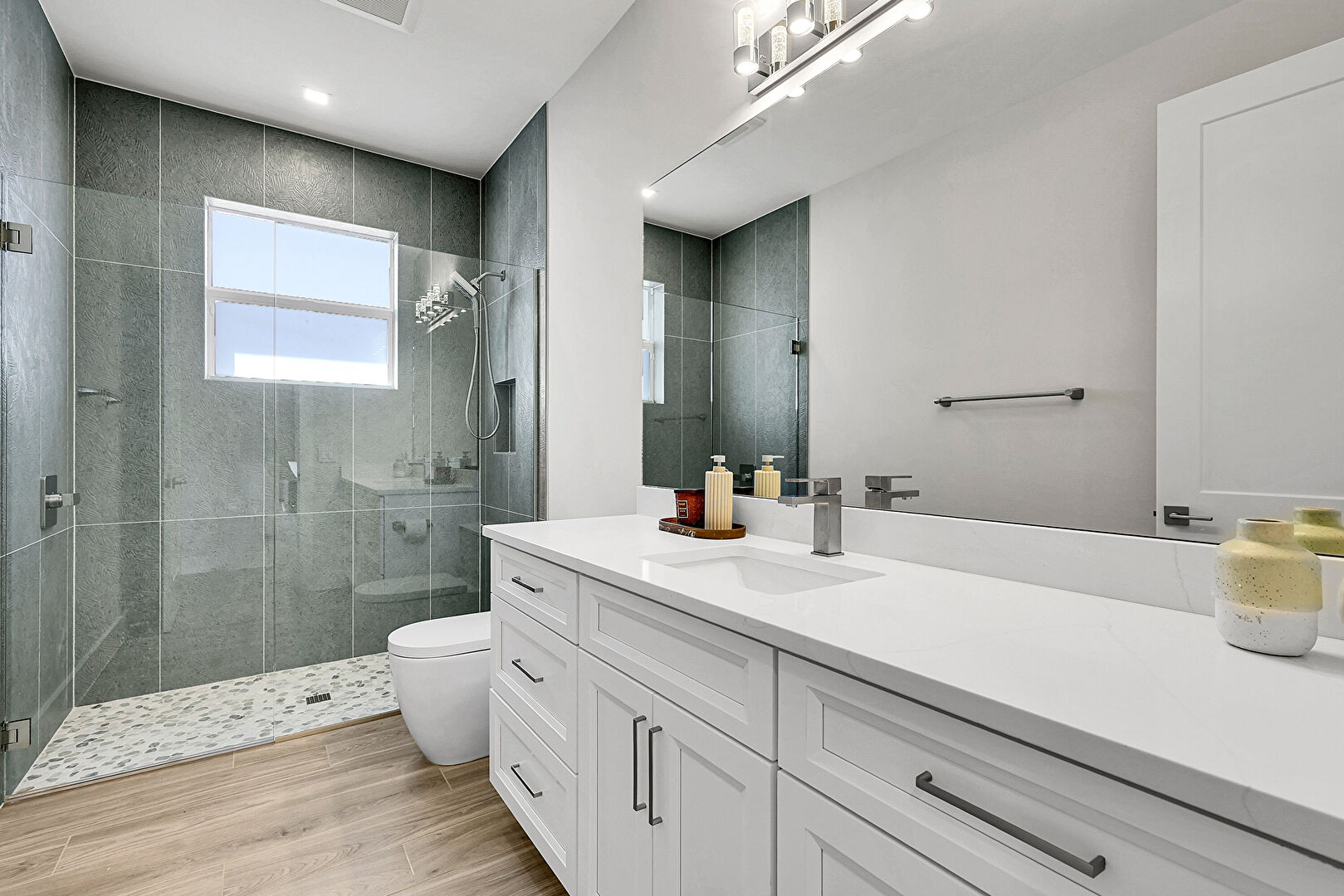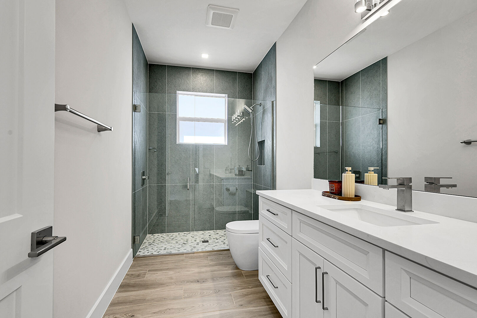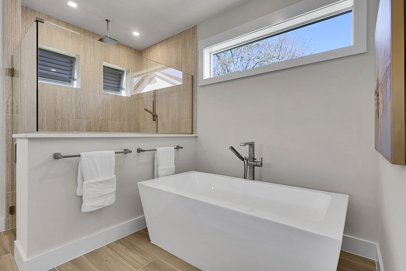 Baseboards Wall, Double Vanity, Drywall, Full Bathroom, Natural Light, Recessed Lighting, Vanity, Vent, Wood Finish Floor, Baseboards Wall, Drywall, Full Bathroom, Natural Light, Wood Finish Floor