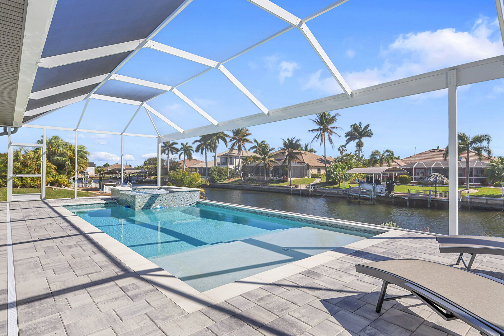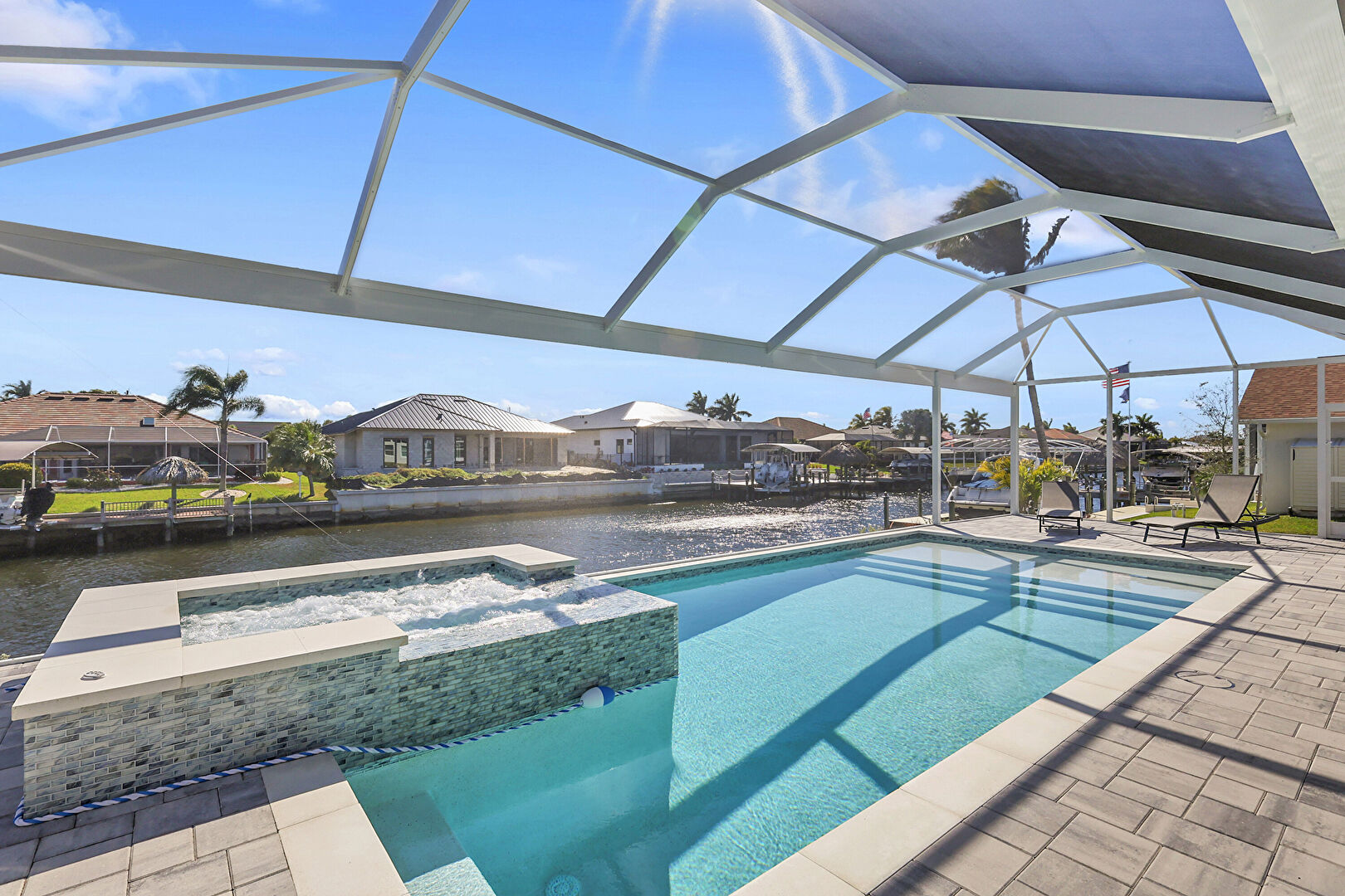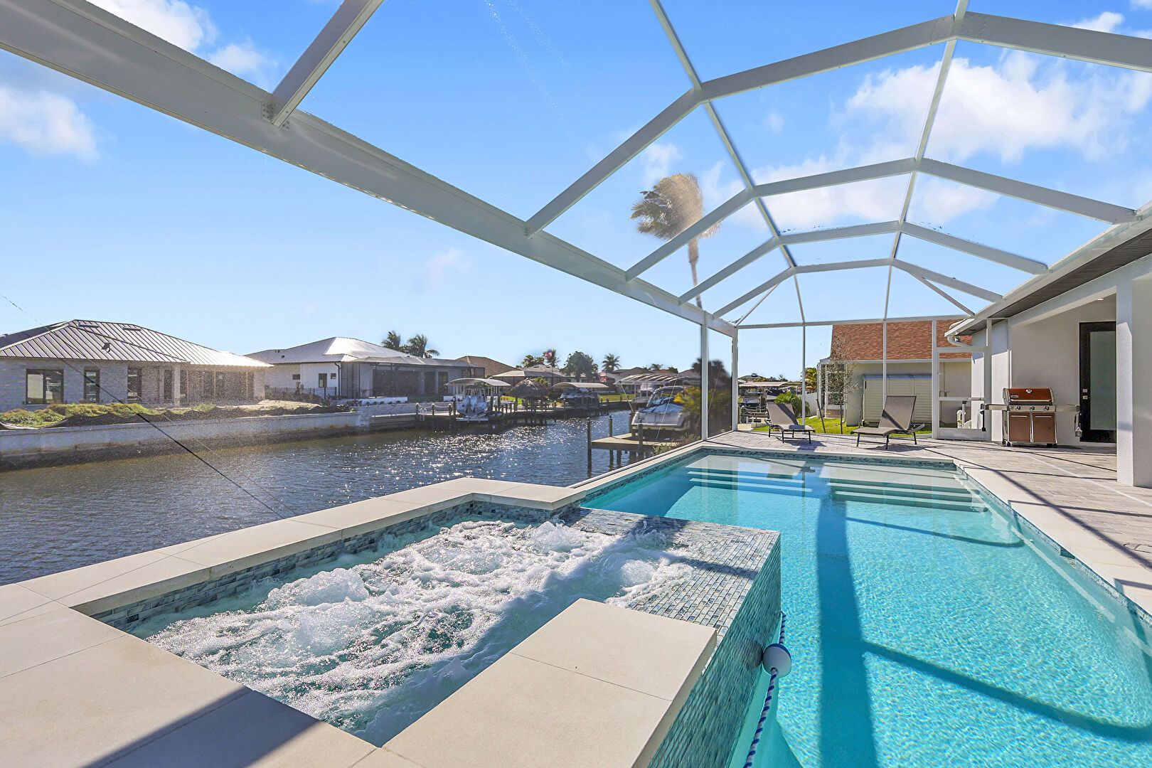 Grill, Hot Tub, Lanai, Outdoor Dining Area, Outdoor Living Space, Patio, Pool, Pool Hot Tub Combo, Residential View, Sunroom, Water View, Waterfront, Waterfront Bulkhead, Fence, Patio, Pool Hot Tub Combo, Waterfront