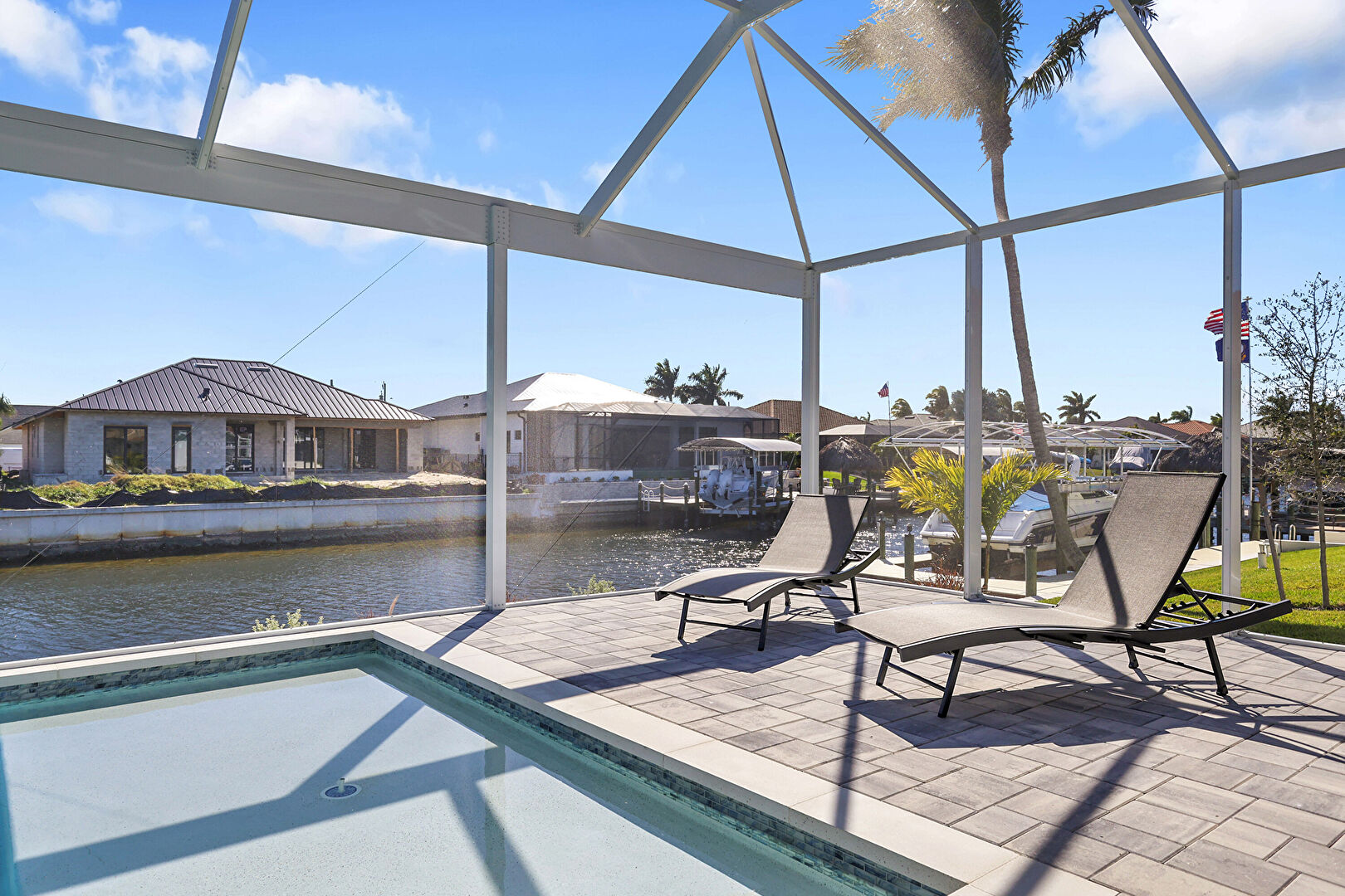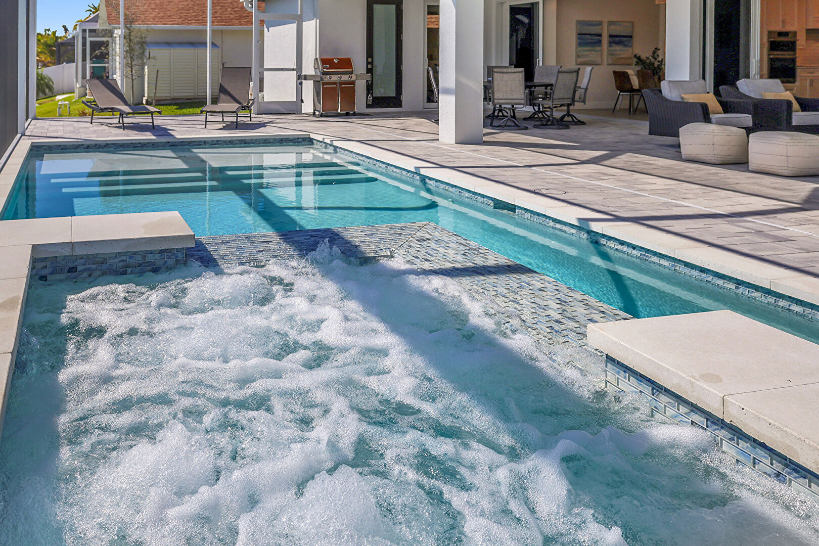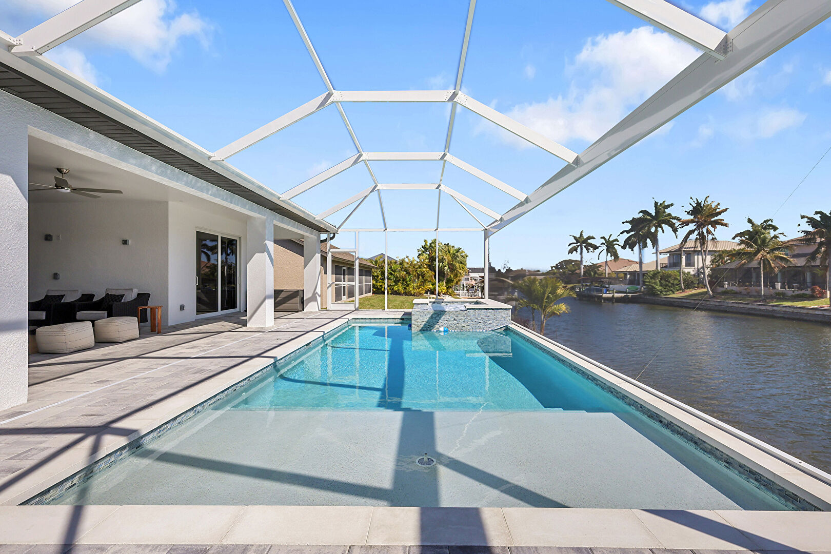 Grill, Hot Tub, Lanai, Outdoor Dining Area, Outdoor Living Space, Patio, Pool, Pool Hot Tub Combo, Residential View, Sunroom, Water View, Waterfront, Waterfront Bulkhead, Fence, Patio, Pool Hot Tub Combo, Waterfront