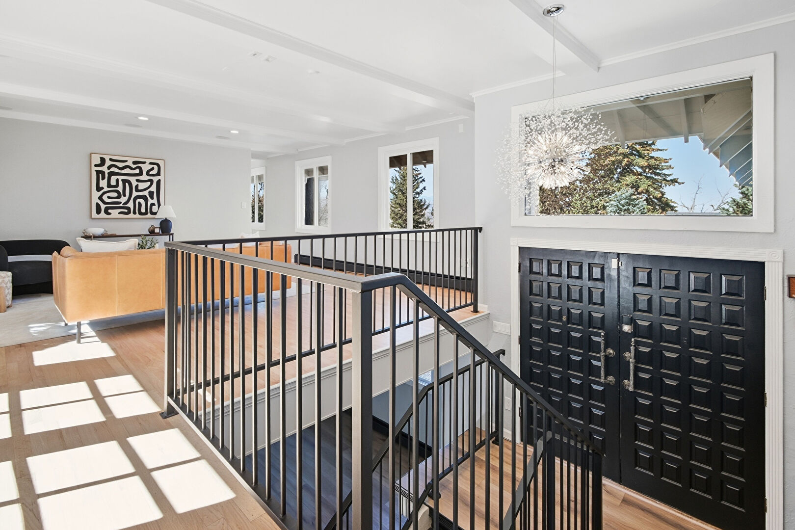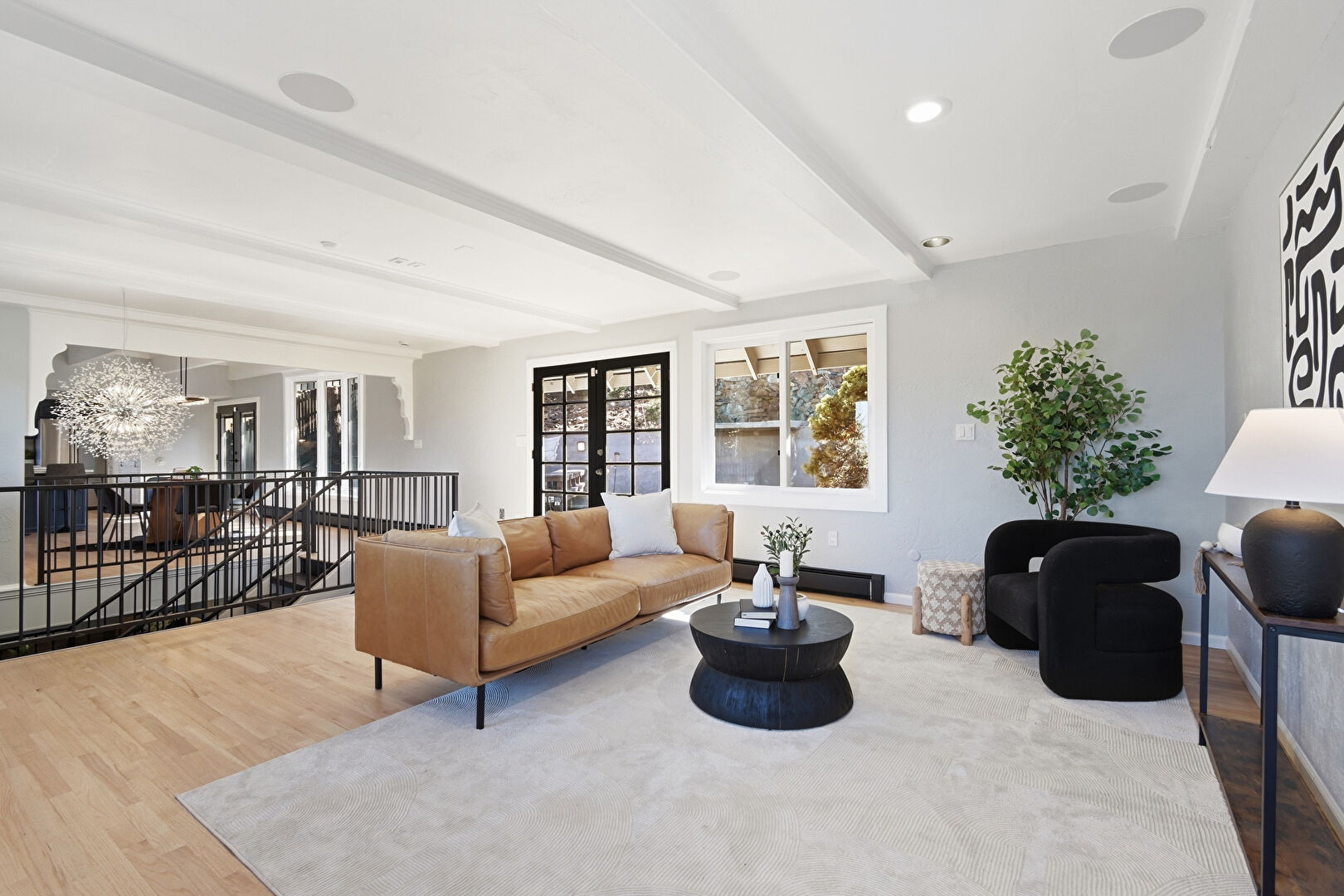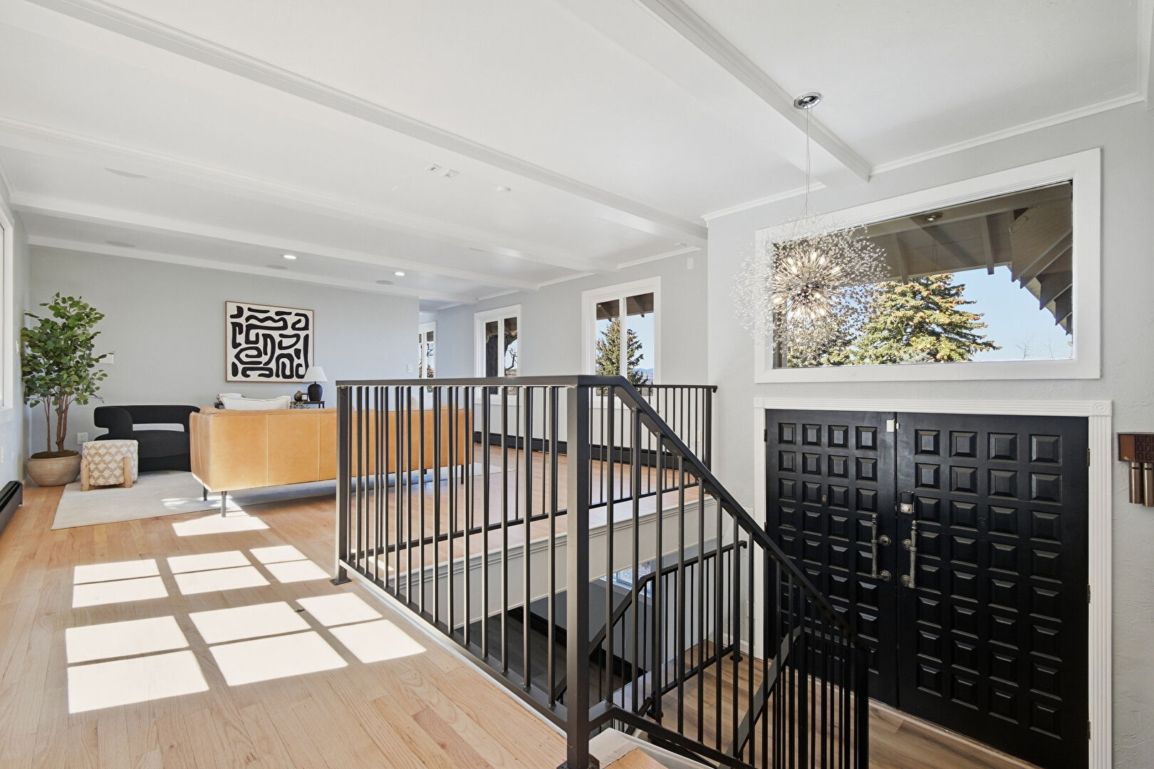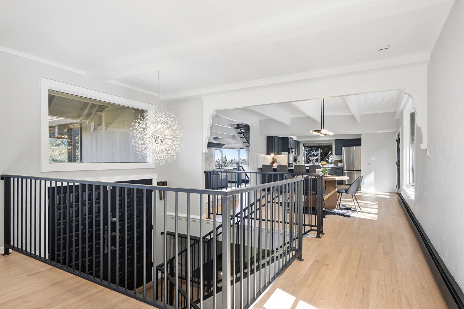 Baseboard Radiator, Baseboards Wall, Beamed Ceiling, Crown Molding, Drywall, Loft, Natural Light, Notable Chandelier, Recessed Lighting, Upstairs Landing, Wood Finish Floor, Notable Chandelier, Wood Finish Floor