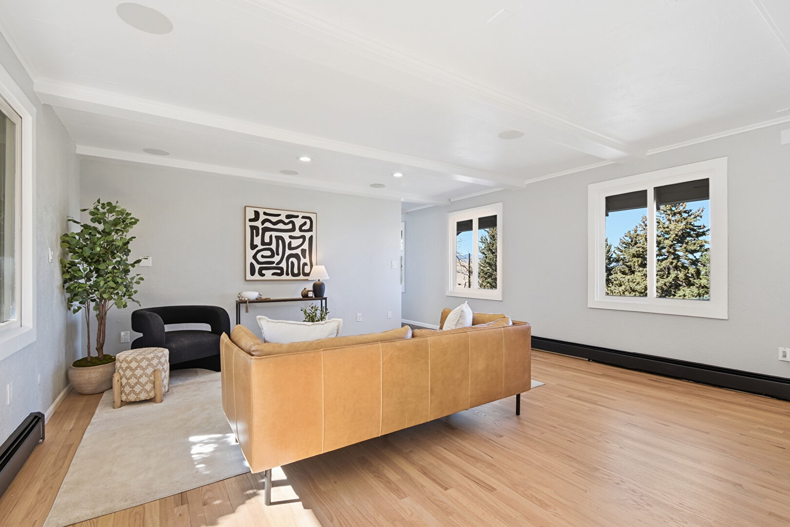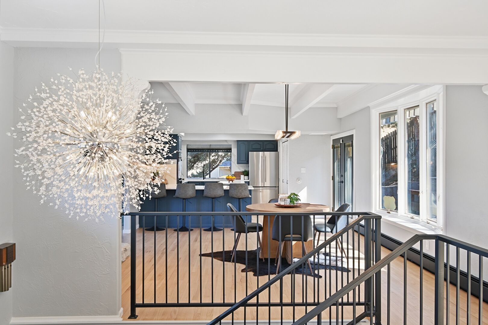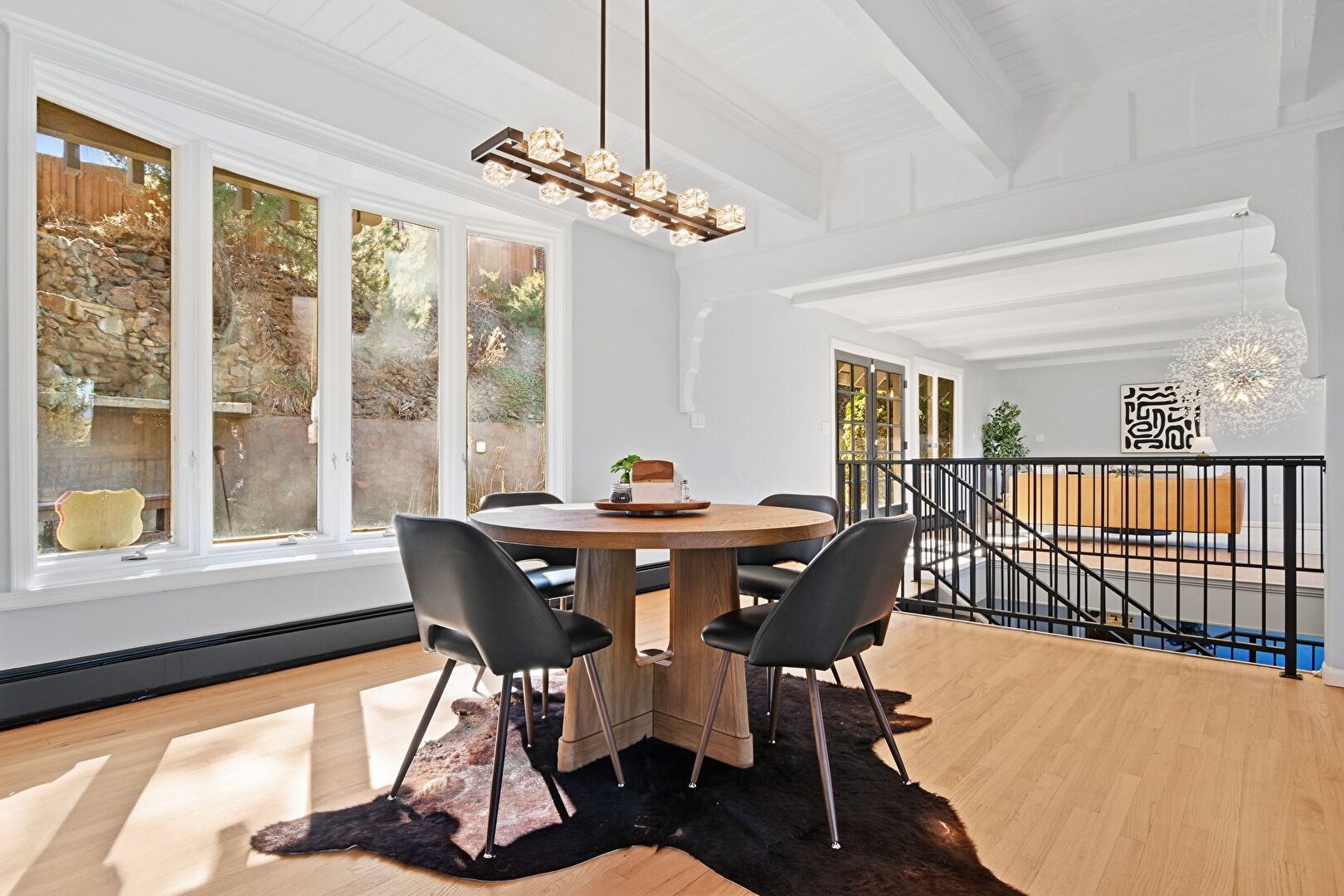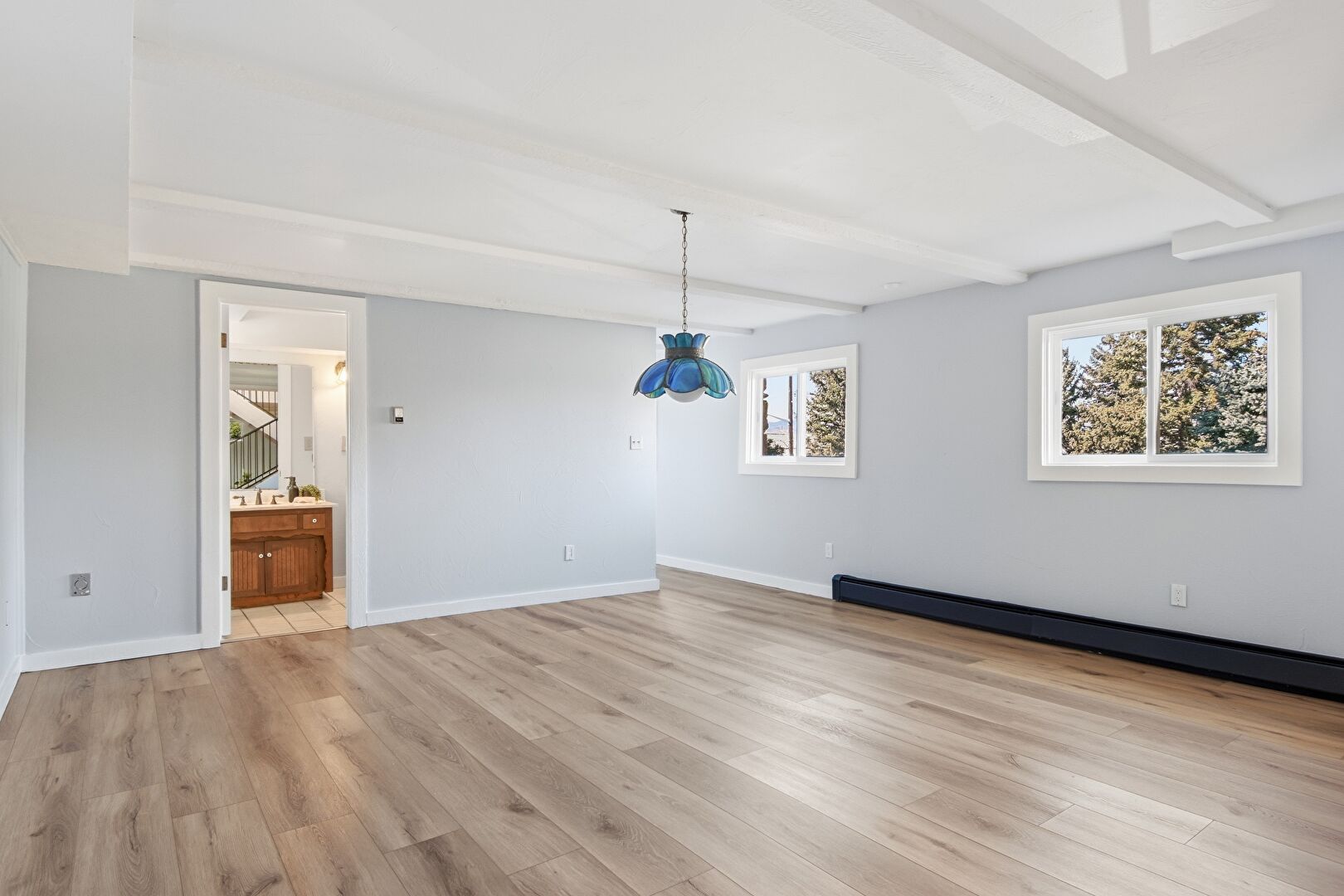 Baseboard Radiator, Baseboards Wall, Beamed Ceiling, Crown Molding, Drywall, Loft, Natural Light, Notable Chandelier, Recessed Lighting, Upstairs Landing, Wood Finish Floor, Notable Chandelier, Wood Finish Floor