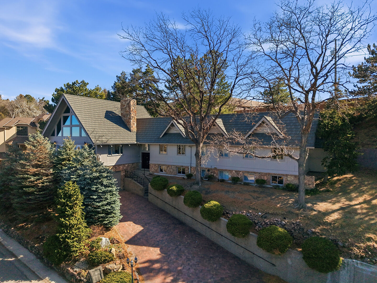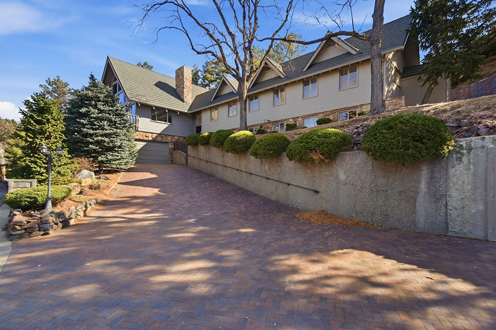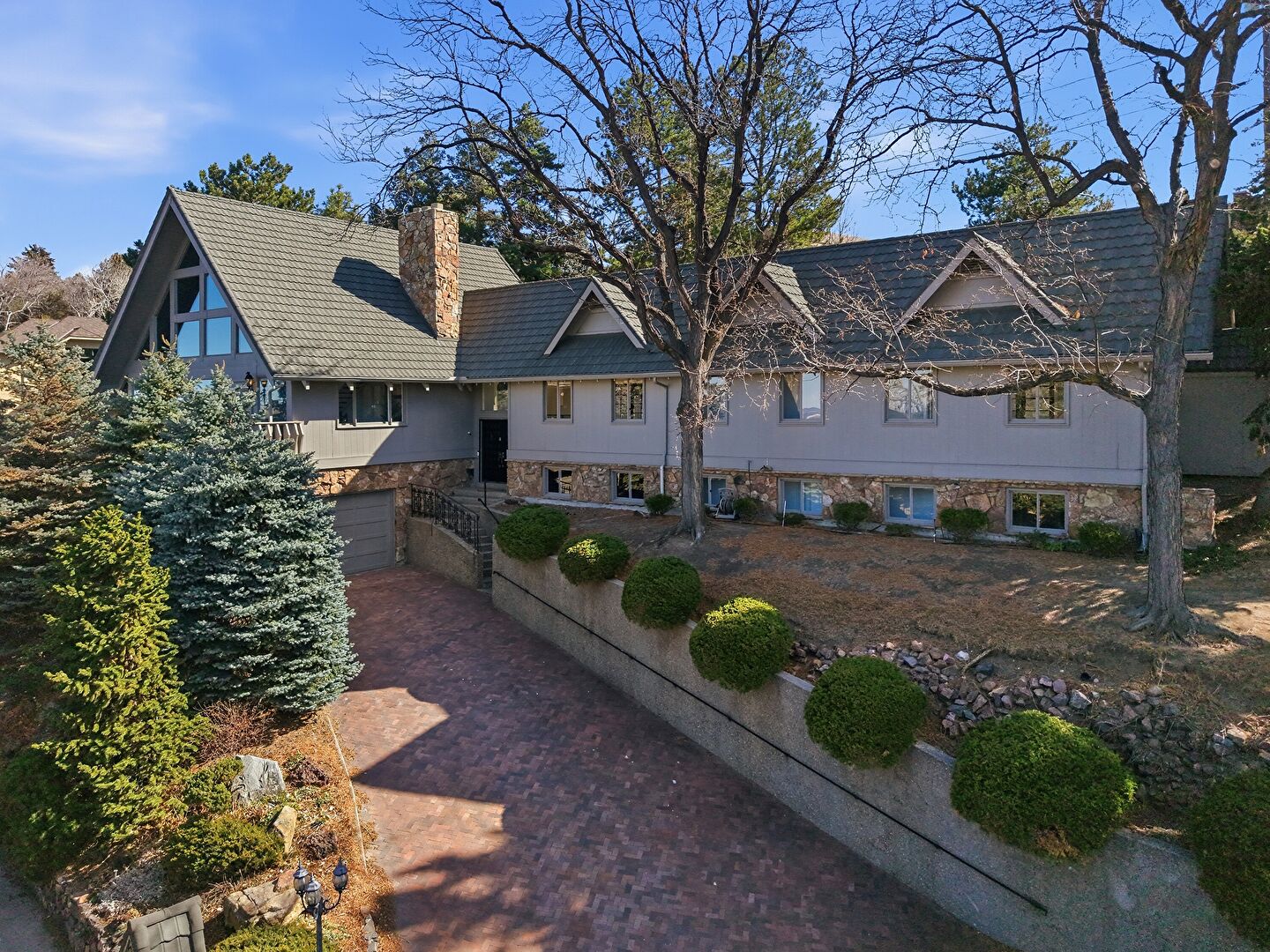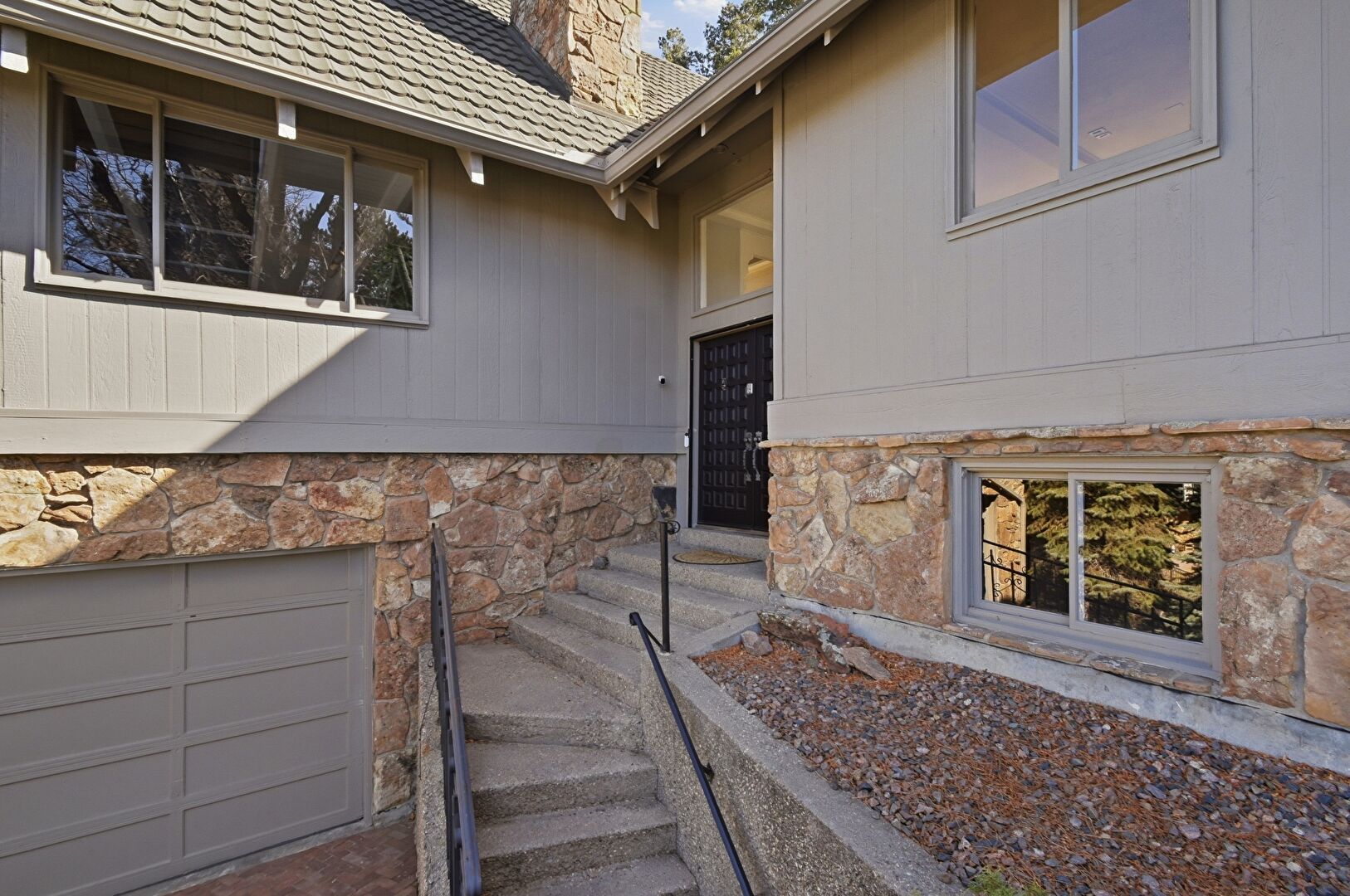 Built In Garage, Gutters, Stone Siding, Vertical Siding, Chimney, Vertical Siding