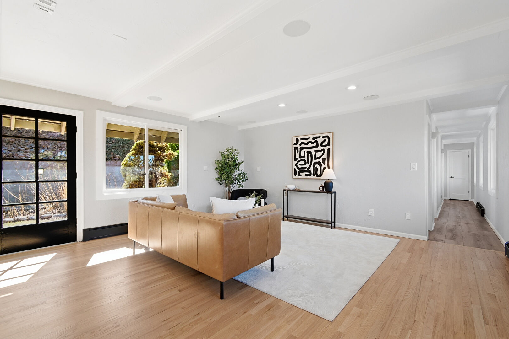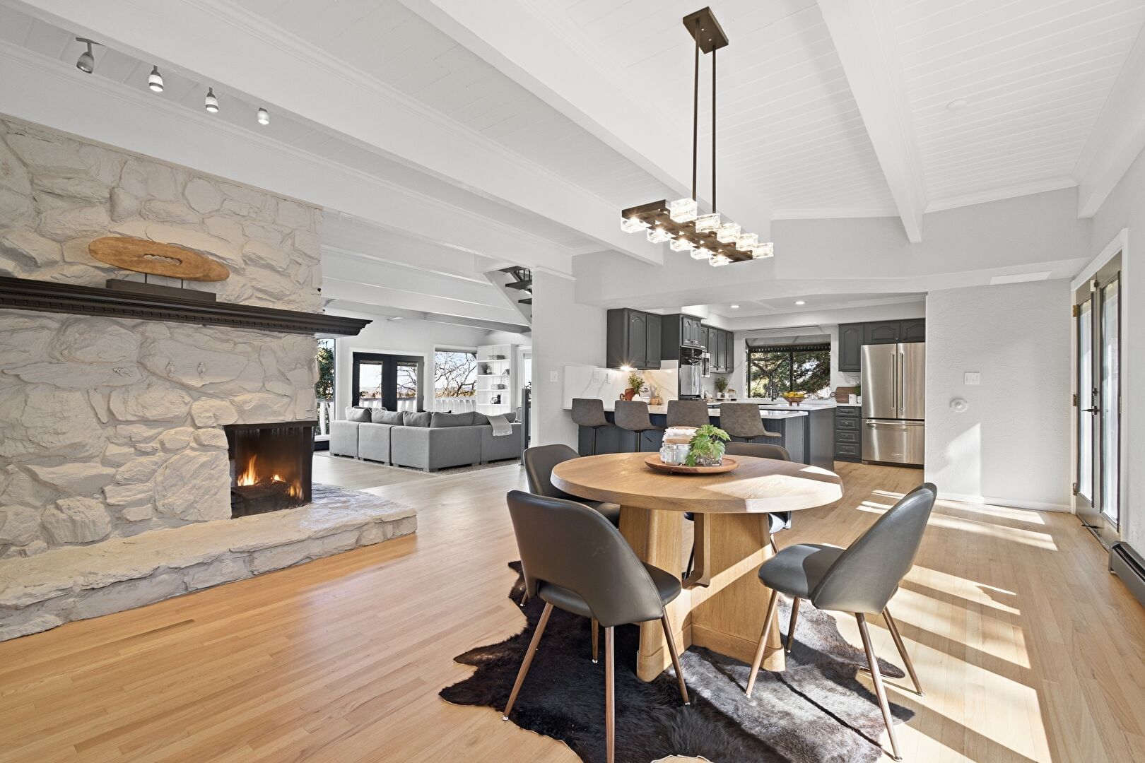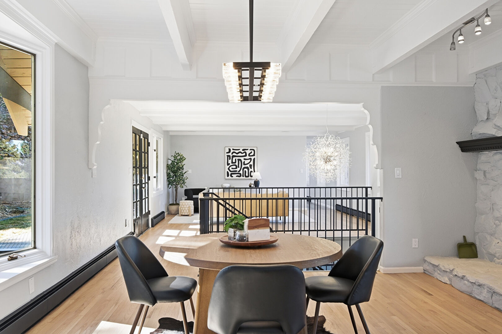 Baseboard Radiator, Baseboards Wall, Beamed Ceiling, Crown Molding, Drywall, Natural Light, Notable Chandelier, Recessed Lighting, U Shaped Kitchen, Wood Finish Floor, Baseboards Wall, Beamed Ceiling, Fireplace, French Doors, Natural Light