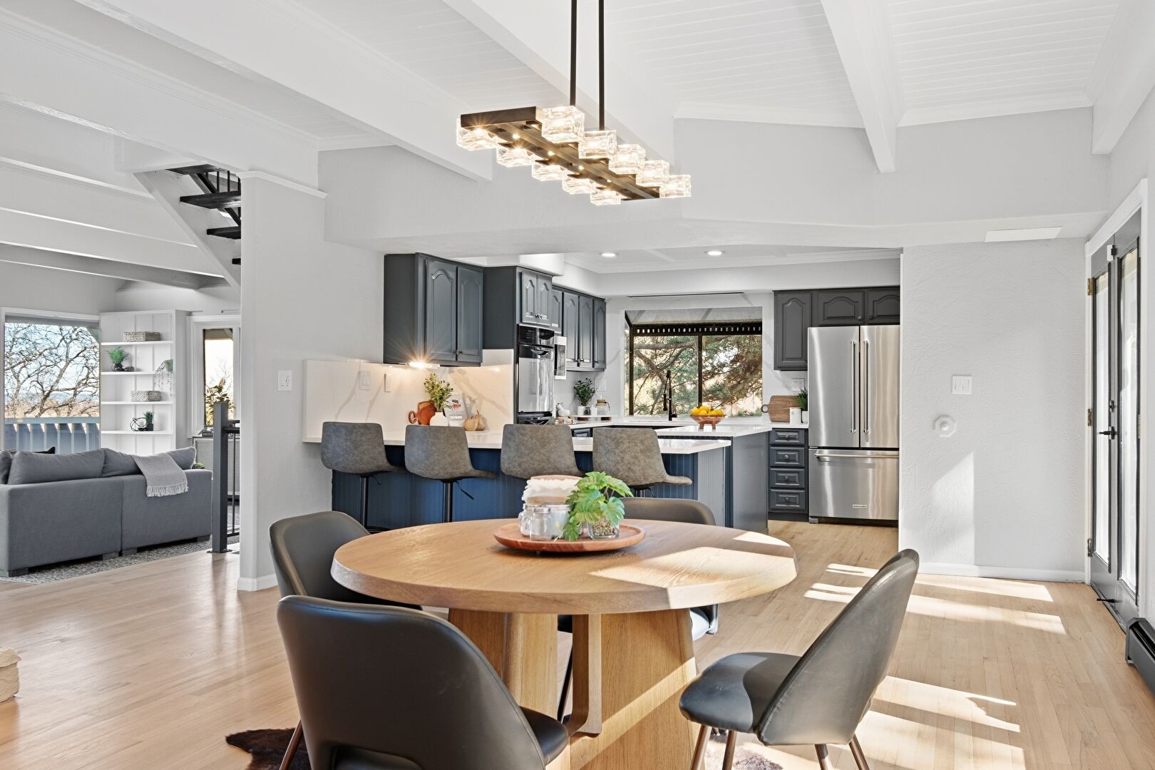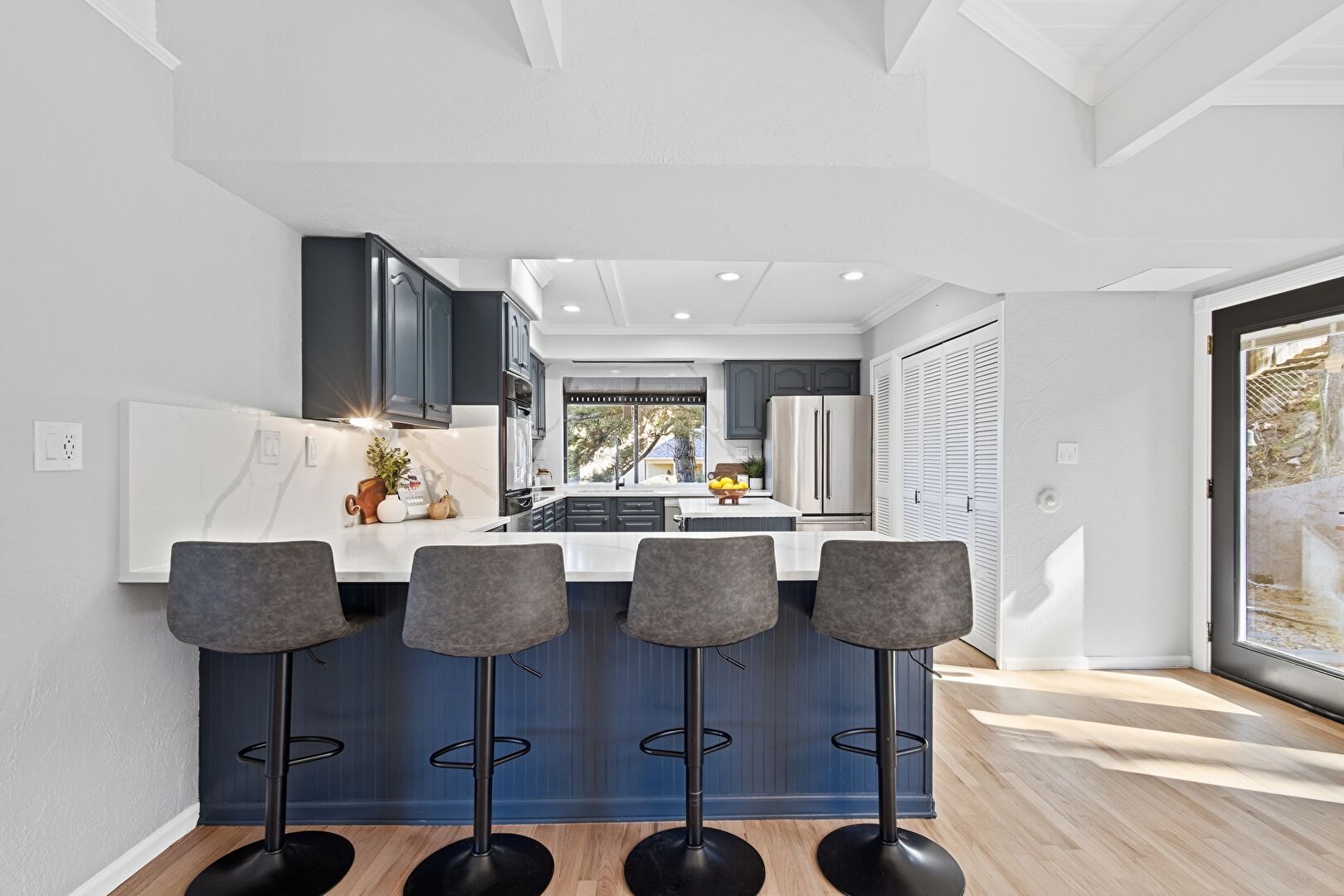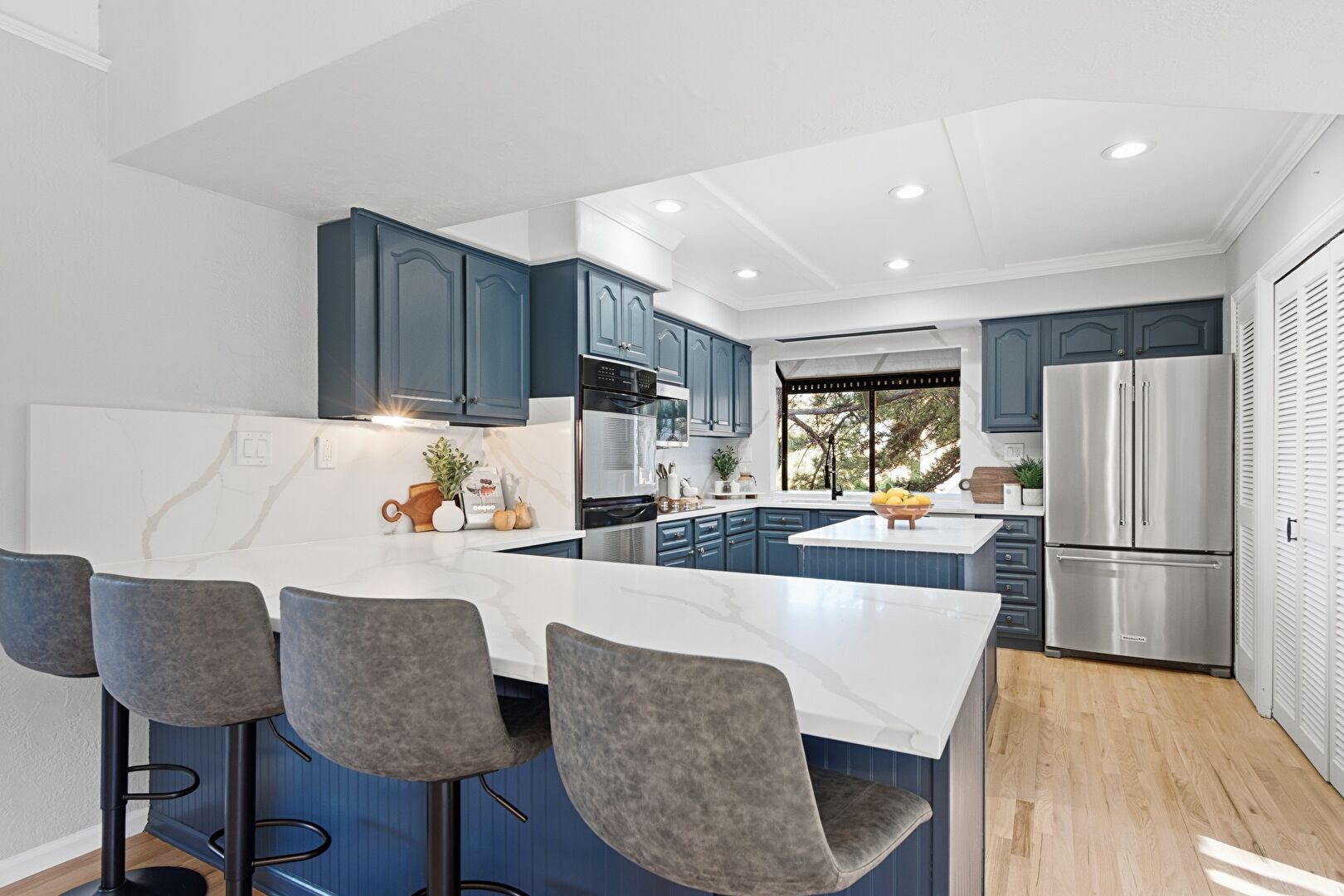 Arched Cabinets, Baseboards Wall, Beamed Ceiling, Blue Cabinets, Crown Molding, Double Oven, Drywall, Gray Cabinets, Kitchen Bar, Kitchen Island, Kitchen Peninsula, L Shaped Kitchen, Natural Light, Opens To Living Area, Raised Cabinets, Recessed Lighting, Stone Countertops, U Shaped Kitchen, Wood Finish Floor, Blue Cabinets, Pendant Lighting, Stone Countertops, U Shaped Kitchen