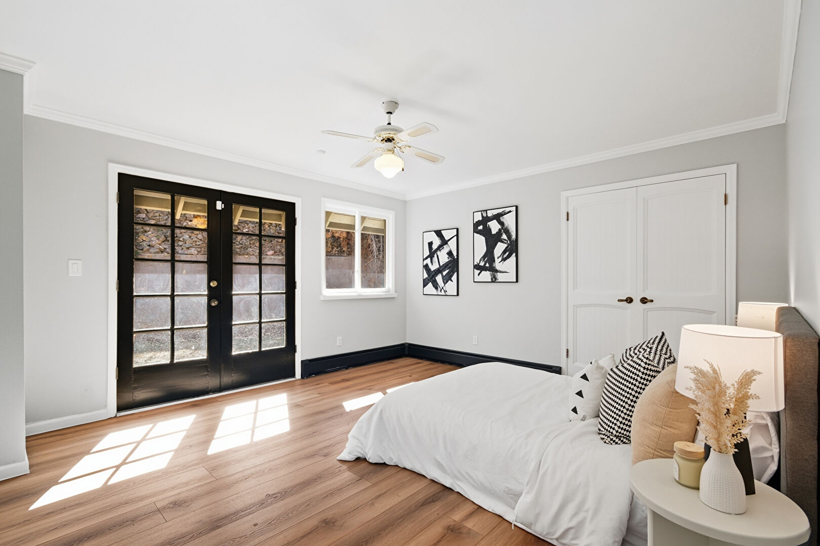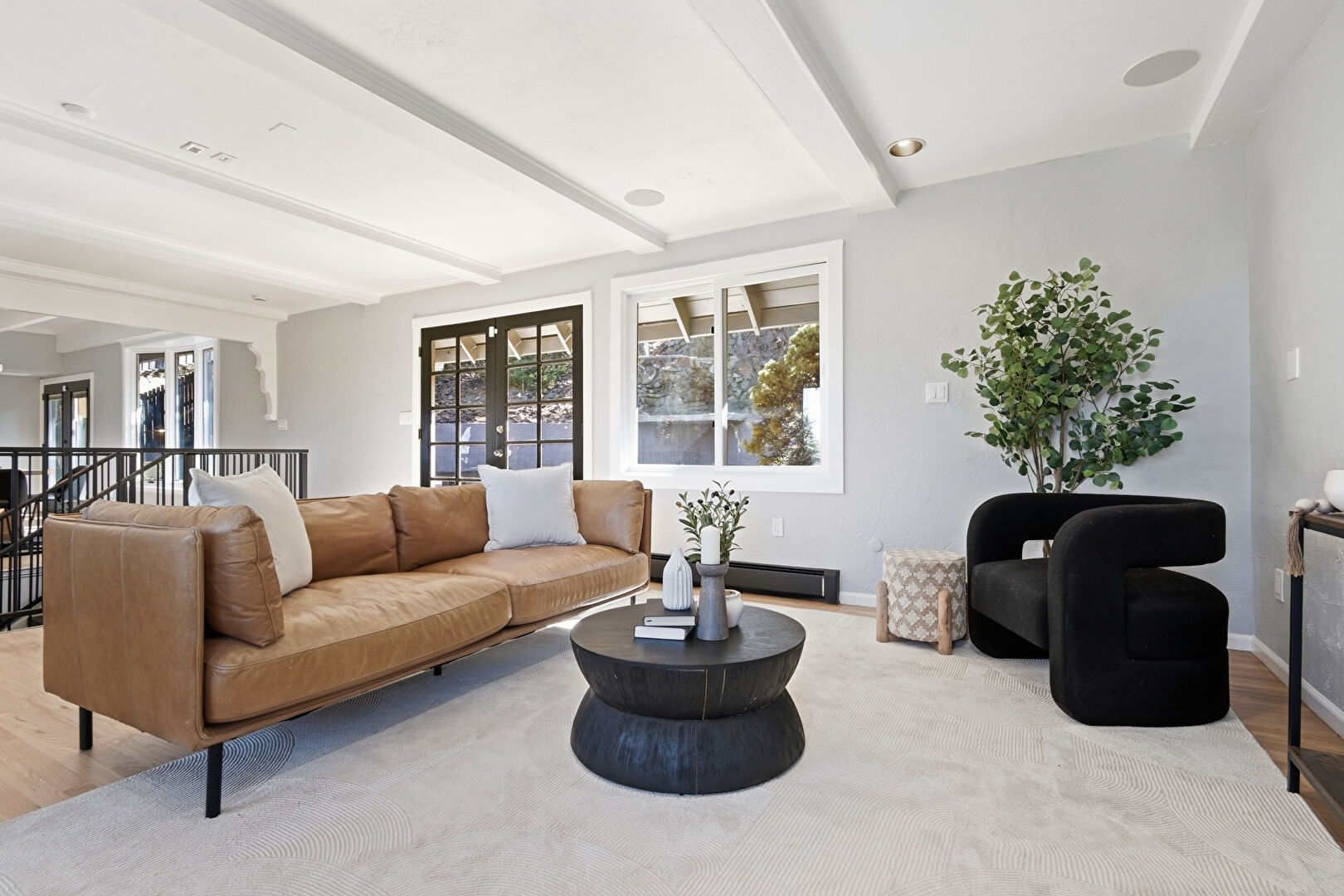 Baseboard Radiator, Baseboards Wall, Basement, Beamed Ceiling, Drywall, Fireplace, French Doors, Natural Light, Recessed Lighting, Stairs, Stone Wall, Wood Finish Floor, Wood Wall, Baseboards Wall, Beamed Ceiling, Crown Molding, Natural Light, Notable Chandelier, Stairs, Vent, Wood Finish Floor