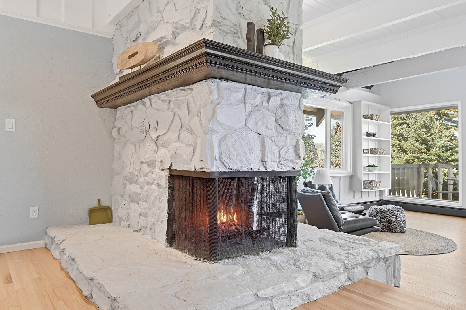 Baseboards Wall, Beamed Ceiling, Drywall, Wood Ceiling, Wood Finish Floor, Cathedral Ceiling, Fireplace