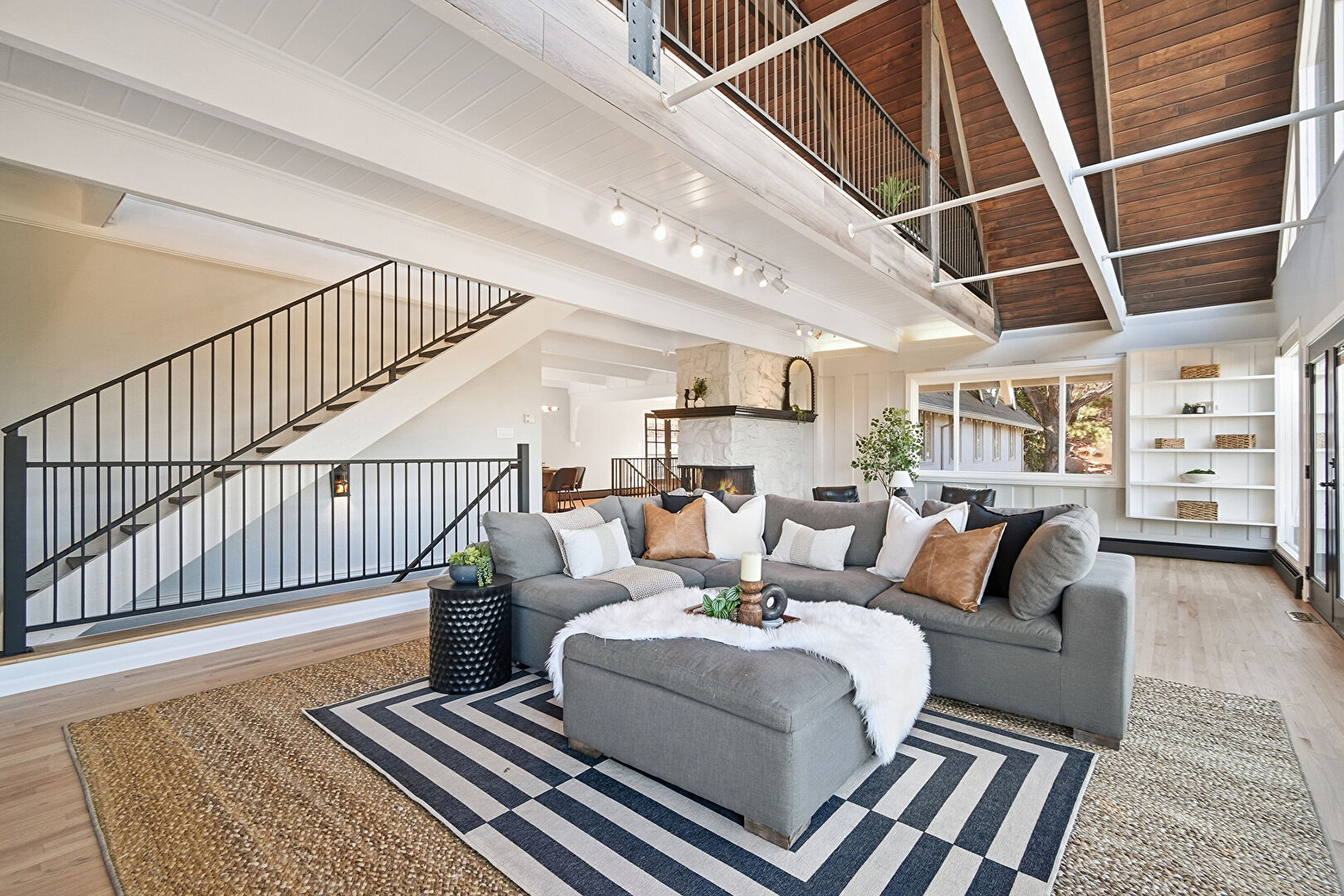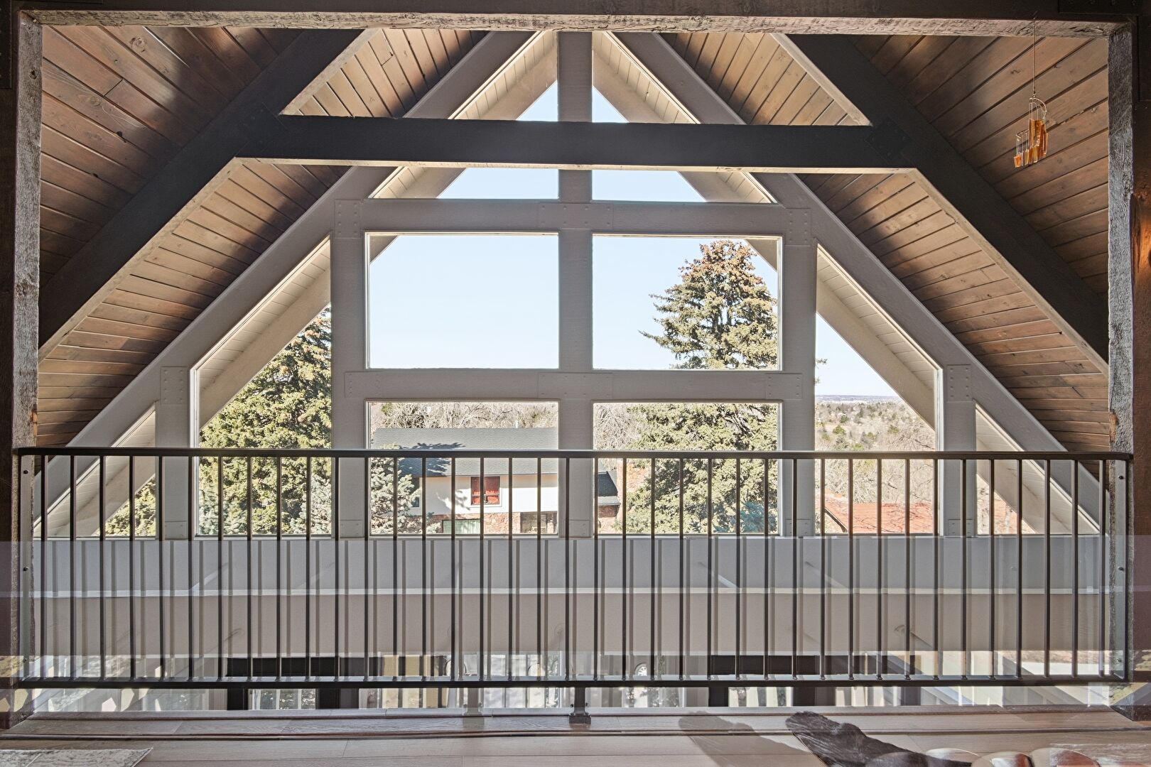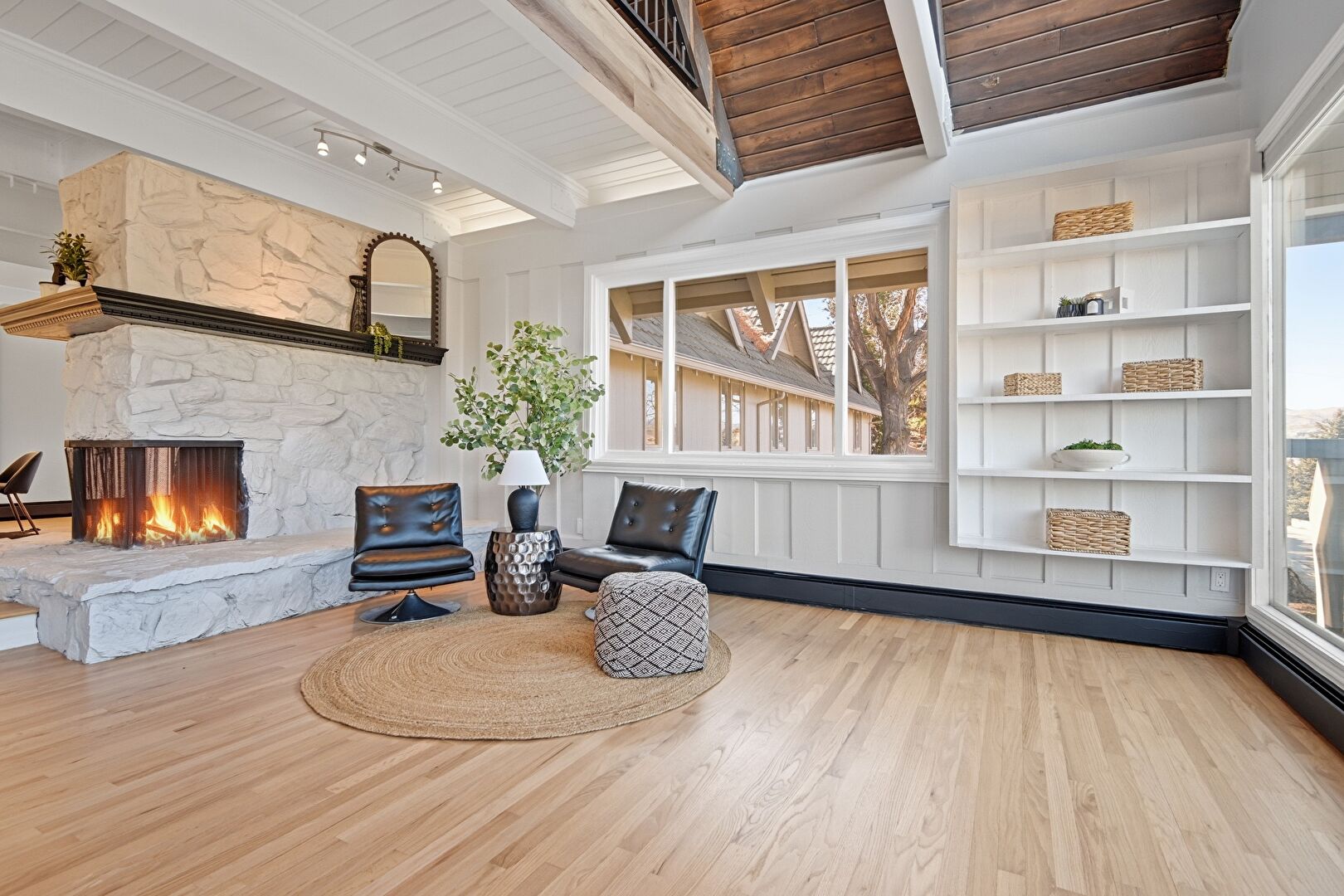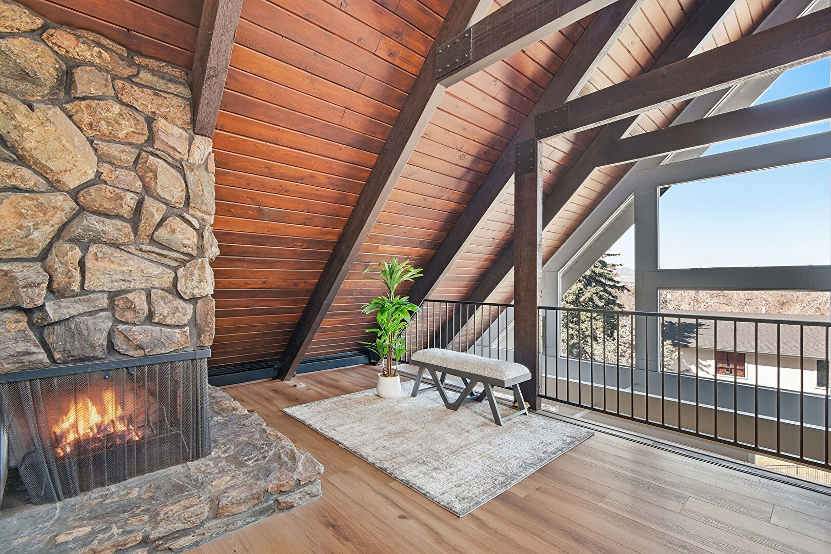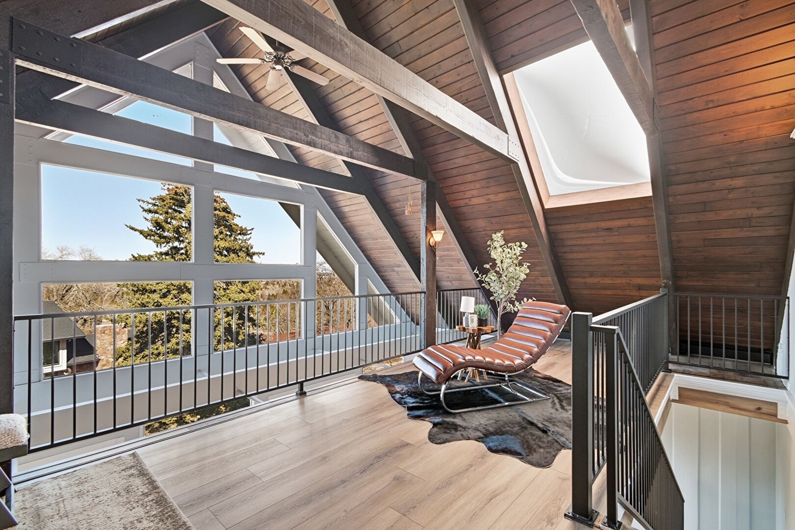 Baseboards Wall, Beamed Ceiling, Cathedral Ceiling, Ceiling Fan, Drywall, High Ceiling, Loft, Natural Light, Skylight, Upstairs Landing, Vaulted Ceiling, Wood Ceiling, Wood Finish Floor, Fireplace, Vaulted Ceiling, Wood Ceiling