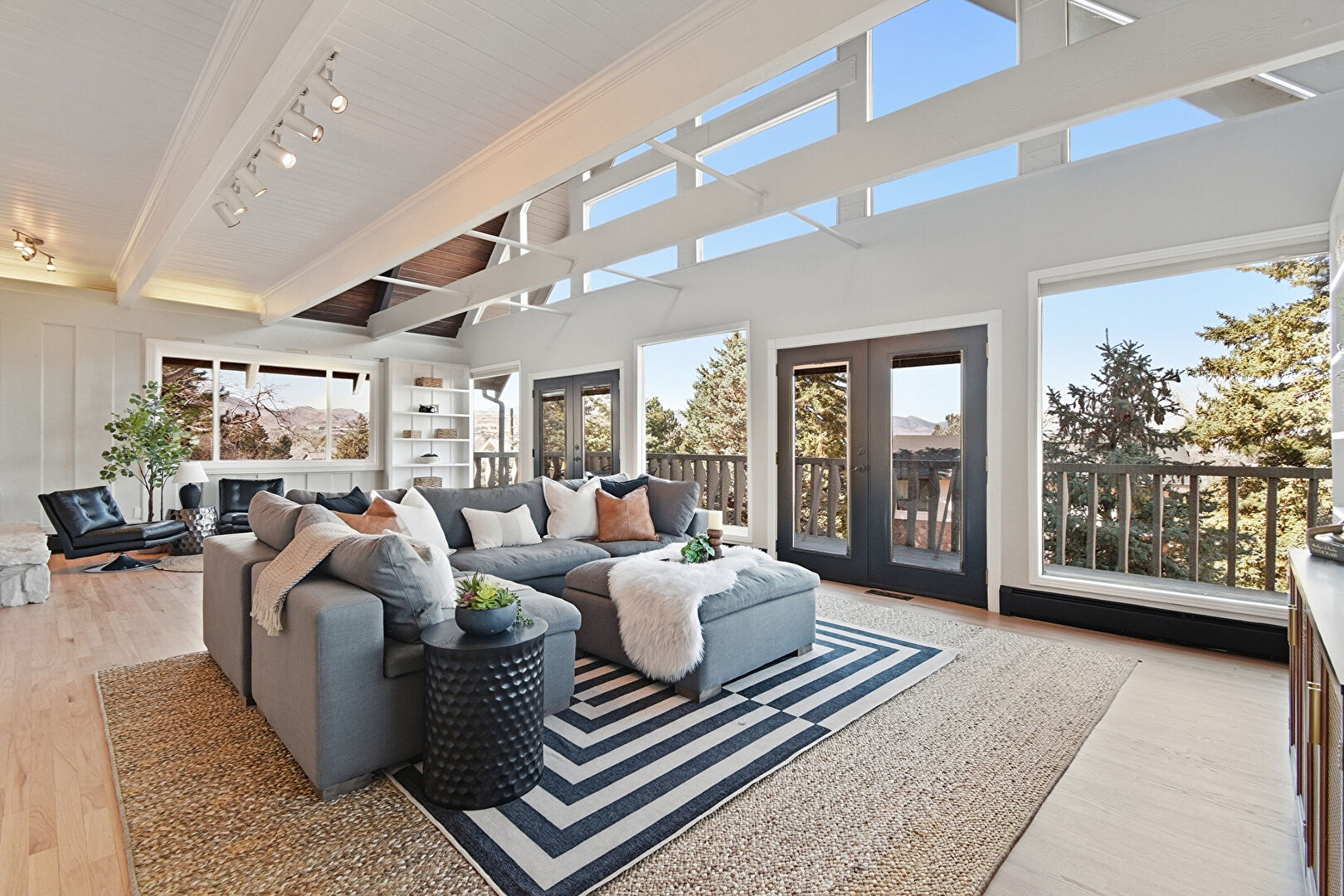 Baseboard Radiator, Baseboards Wall, Beamed Ceiling, Built In Shelves, Crown Molding, Drywall, Fireplace, French Doors, High Ceiling, Natural Light, Paneling Wall, Stairs, Track Lighting, Vaulted Ceiling, Vent, Wood Ceiling, Wood Finish Floor, Baseboards Wall, Beamed Ceiling, Drywall, Natural Light, Stairs, Track Lighting, Vaulted Ceiling, Wood Ceiling, Wood Finish Floor