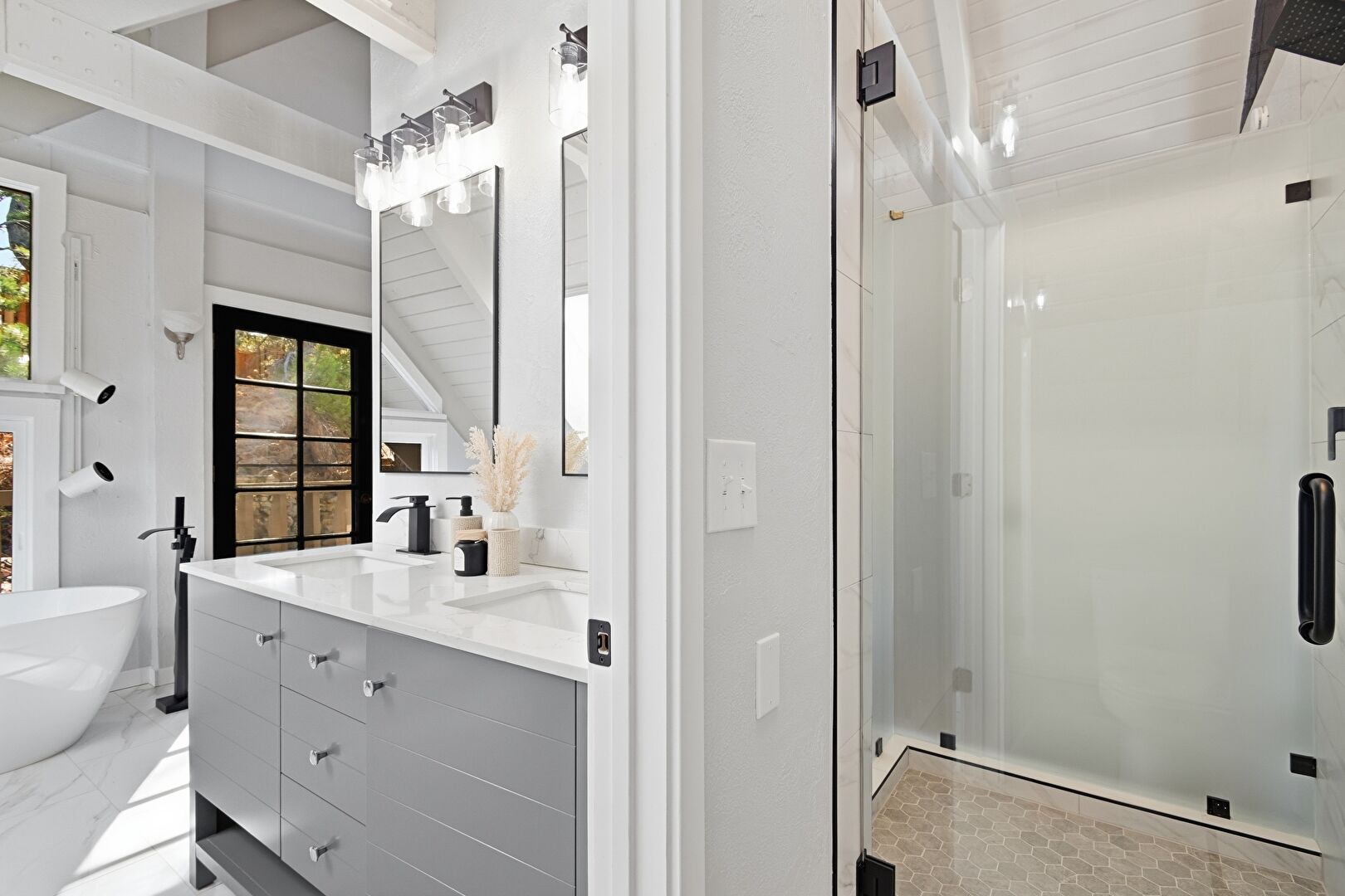 Baseboard Radiator, Beamed Ceiling, Cathedral Ceiling, Crown Molding, Double Vanity, Drywall, Ensuite Bathroom, Full Bathroom, Half Bathroom, Marble Finish Floor, Natural Light, Tile Floor, Vanity, Vaulted Ceiling, Wood Ceiling, Combined Bath Shower, Drywall, Full Bathroom, Natural Light