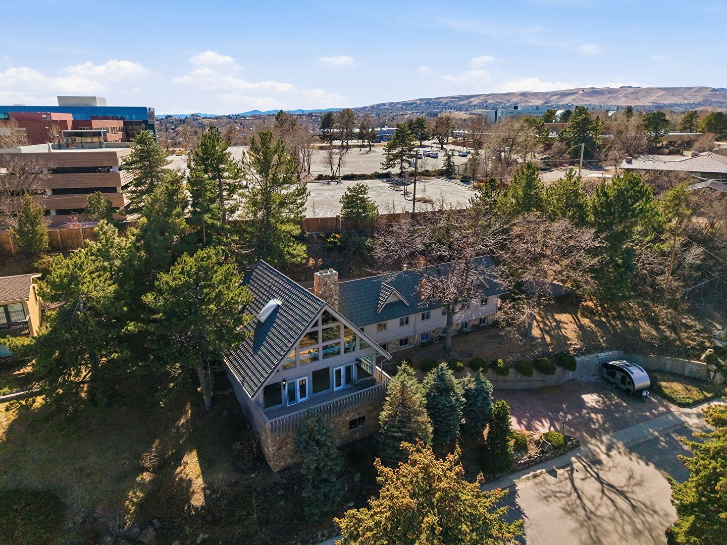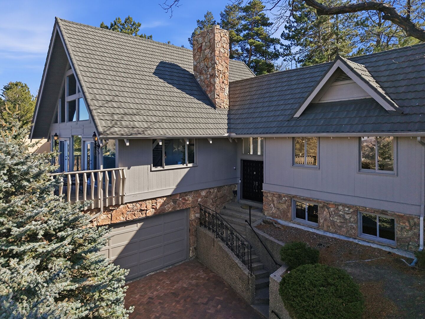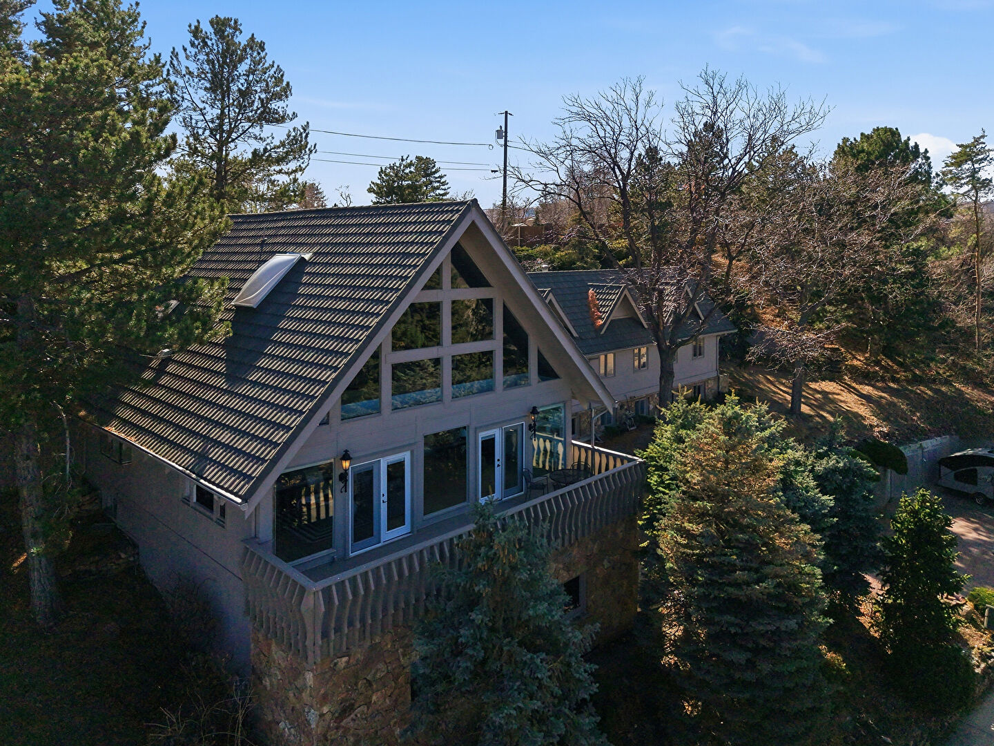 Basement Garage, Built In Garage, Chimney, Deck, Downspout, Driveway, French Doors, Glass Siding, Mountain View, Residential View, Stairs, Stone Siding, Stoop, Tile Roof, Vertical Siding, Water View, Basement Garage, Chimney, Glass Siding, Gutters, Mountain View, Residential View, Water View, Woods View