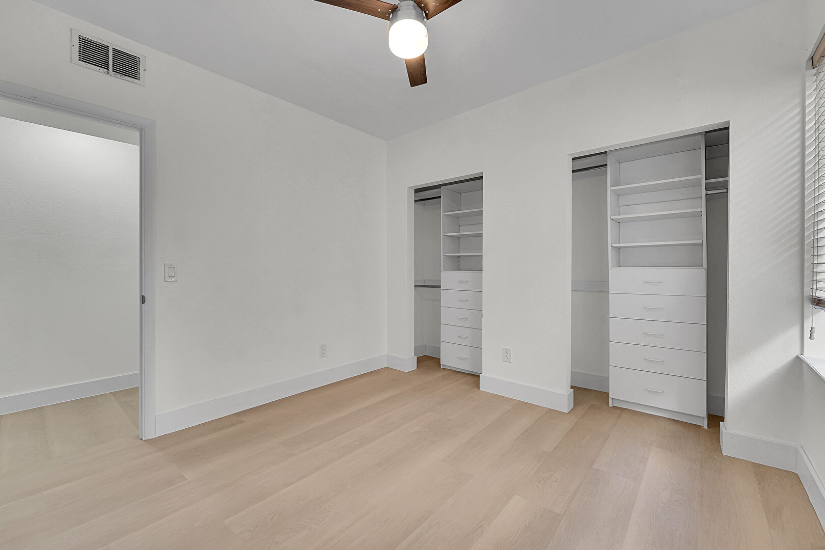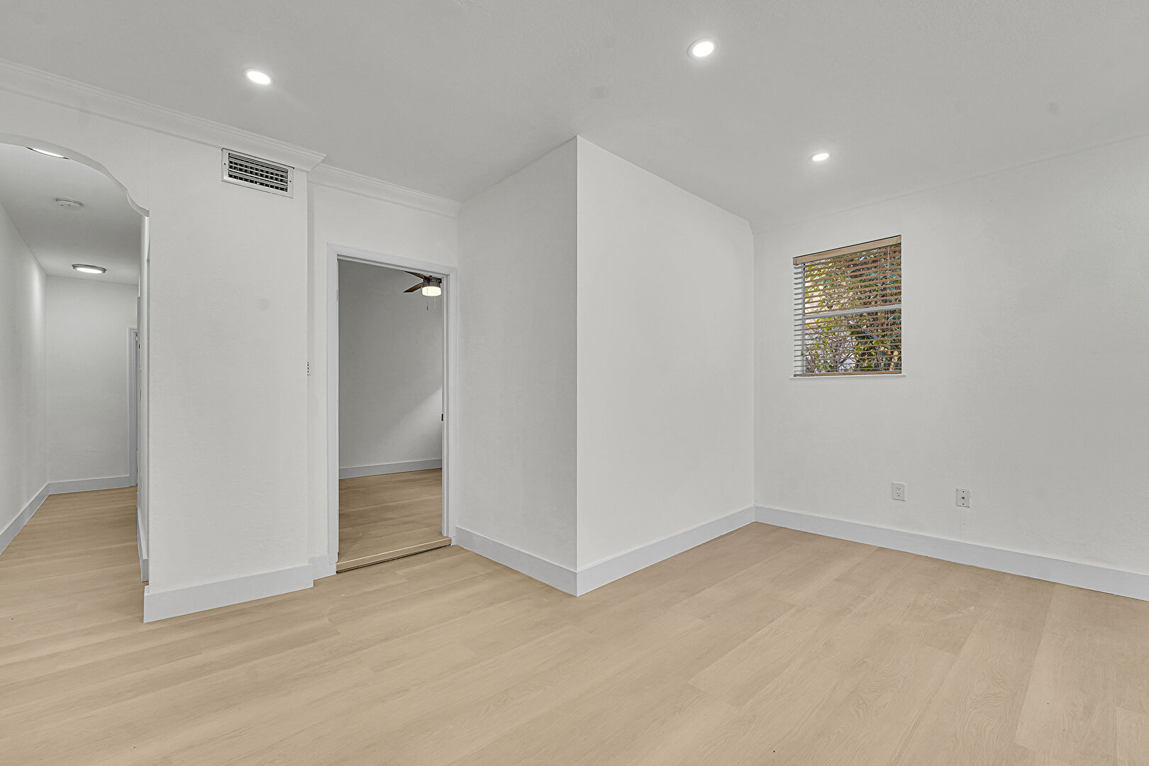 Arched Walkways, Baseboards Wall, Ceiling Fan, Crown Molding, Drywall, Ensuite Bathroom, Natural Light, Recessed Lighting, Two Closets, Vent, Wood Finish Floor, Ceiling Fan, Closet, Drywall, Ensuite Bathroom, Vent, Wood Finish Floor