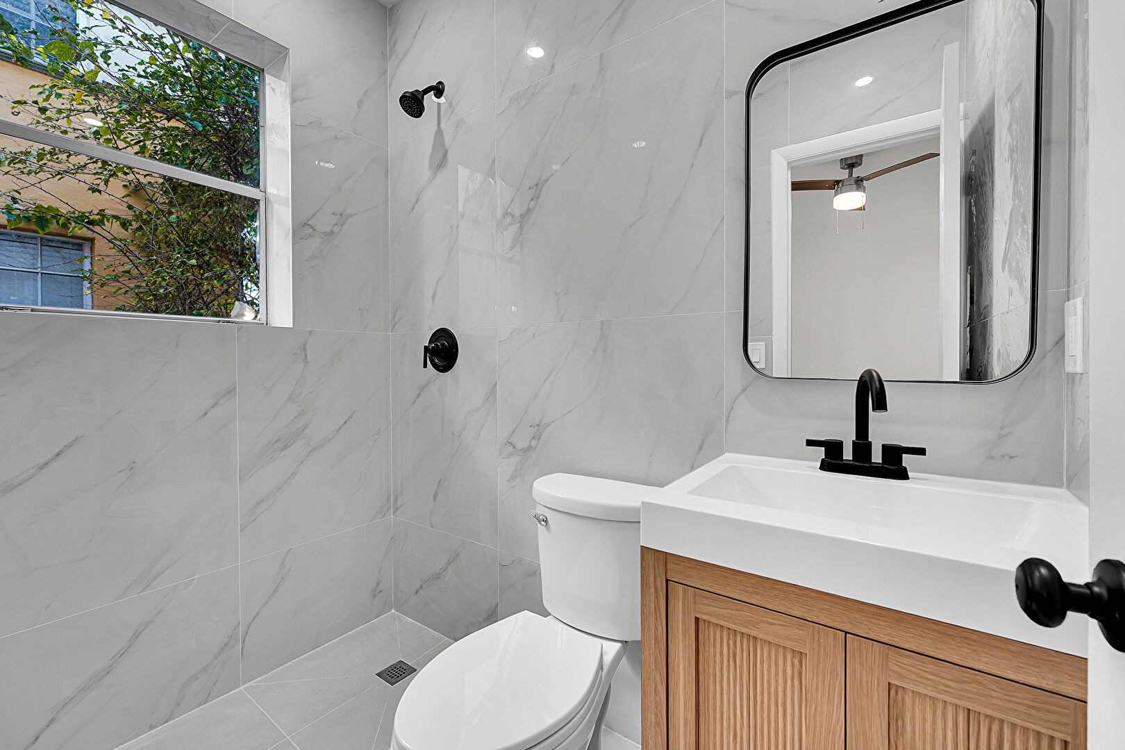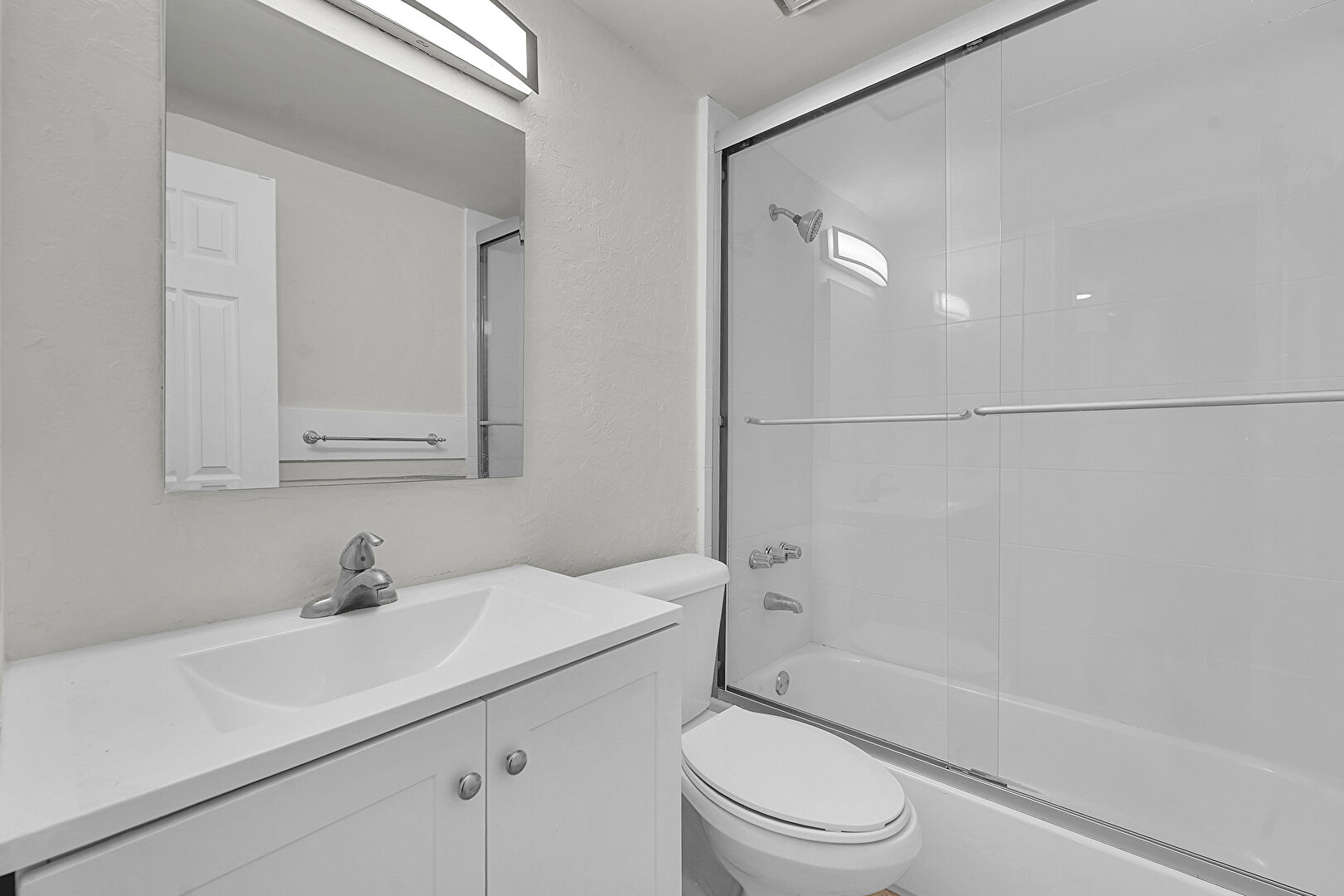Combined Bath Shower, Full Bathroom, Natural Light, Vanity, Textured Wall, Tile Wall