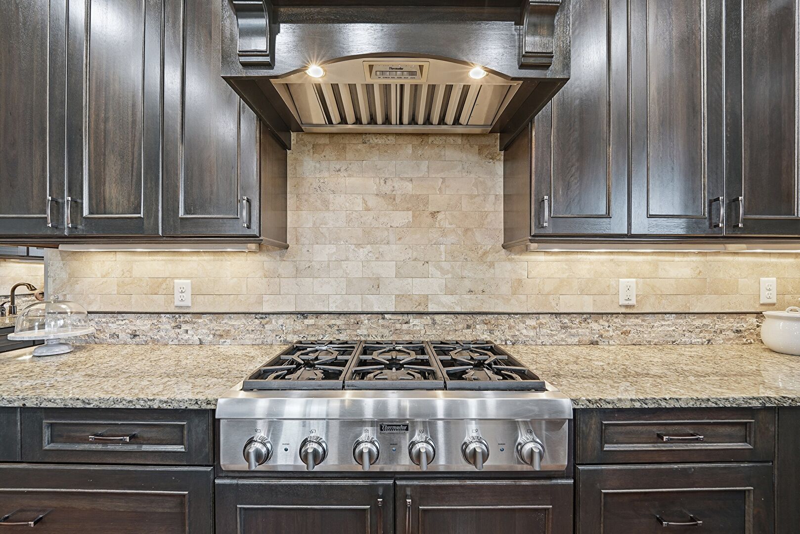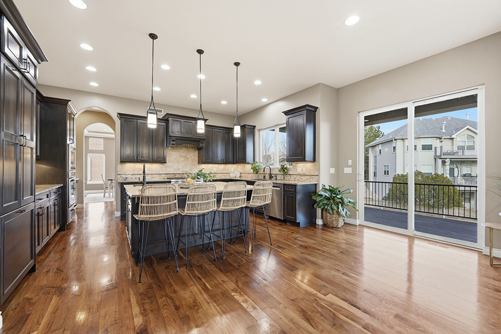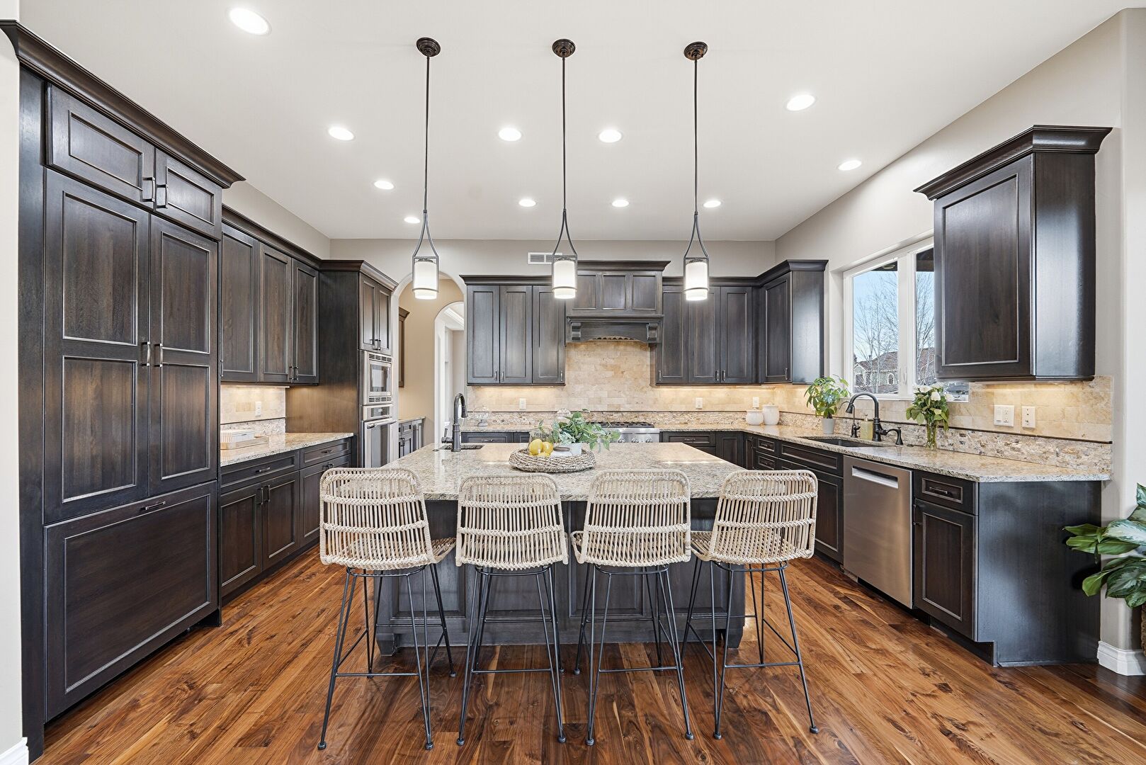 Arched Walkways, Baseboards Wall, Black Cabinets, Ceiling Fan, Crown Molding Cabinets, Dark Brown Cabinets, Double Oven, Drywall, Fireplace, Kitchen Bar, Kitchen Island, Natural Light, Opens To Living Area, Pendant Lighting, Raised Cabinets, Recessed Lighting, Shaker Cabinets, Stone Countertops, U Shaped Kitchen, Warming Drawer, Wood Finish Floor, Crown Molding Cabinets, Dark Brown Cabinets, Stone Countertops, Wood Finish Floor