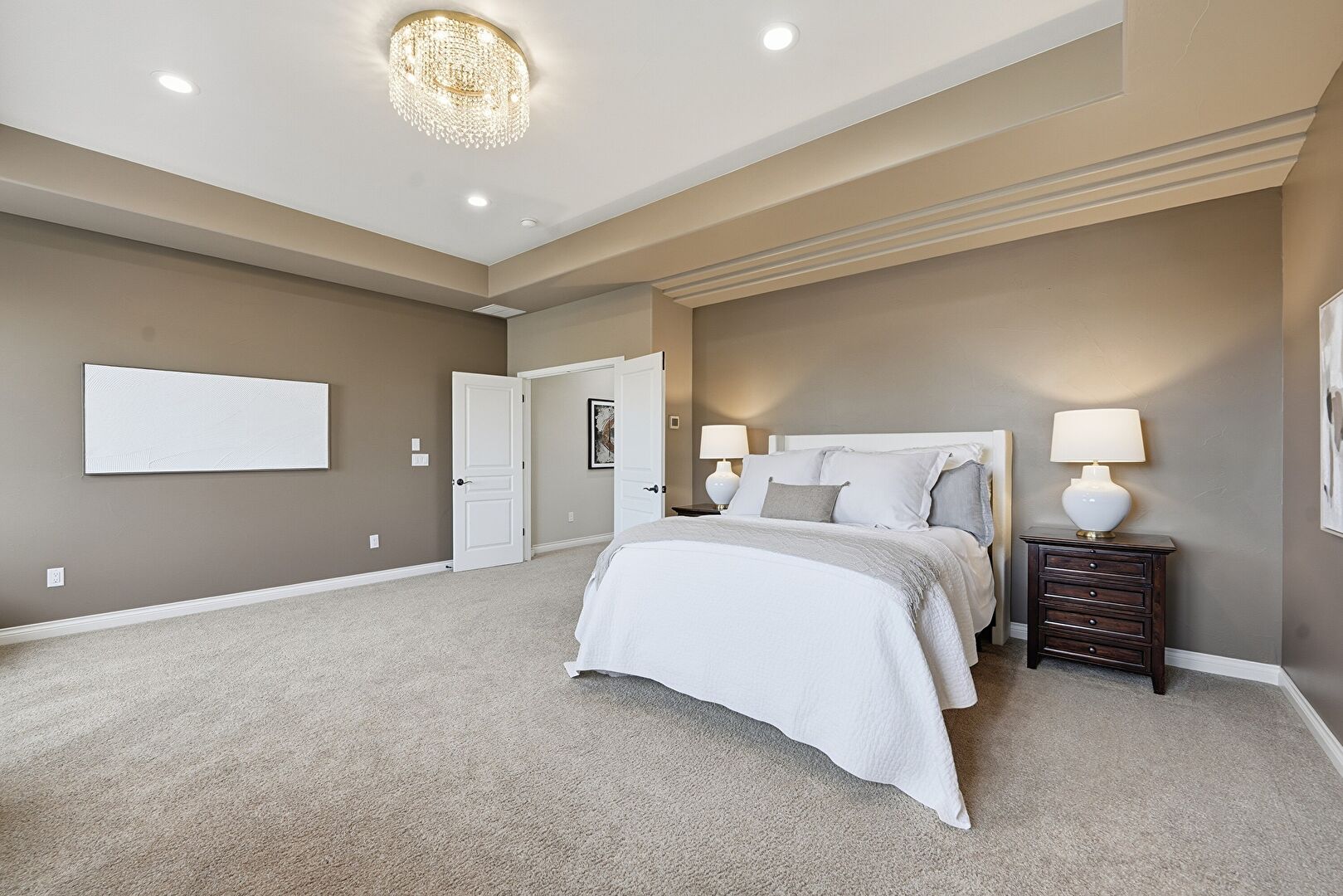 Baseboards Wall, Carpet, Drywall, Ensuite Bathroom, Natural Light, Notable Chandelier, Recessed Lighting, Tray Ceiling, Vent, Baseboards Wall, Tray Ceiling