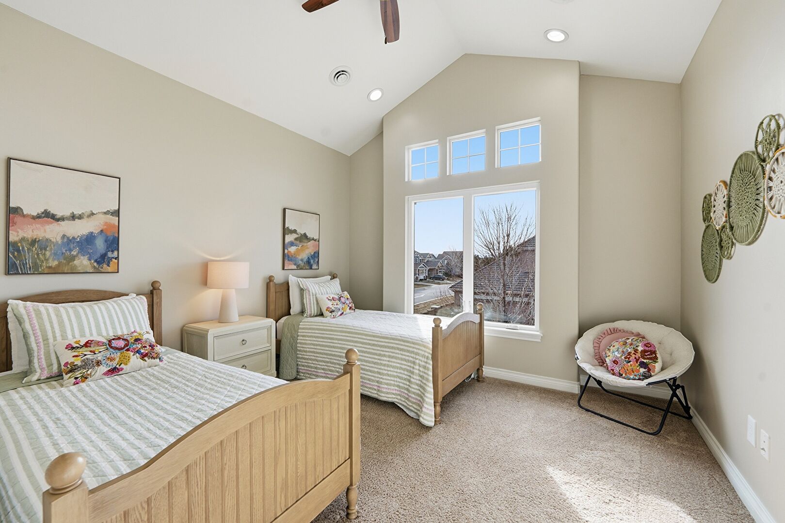 Baseboards Wall, Carpet, Cathedral Ceiling, Ceiling Fan, Drywall, High Ceiling, Natural Light, Recessed Lighting, Vaulted Ceiling, Vent, Ceiling Fan, Drywall, Recessed Lighting