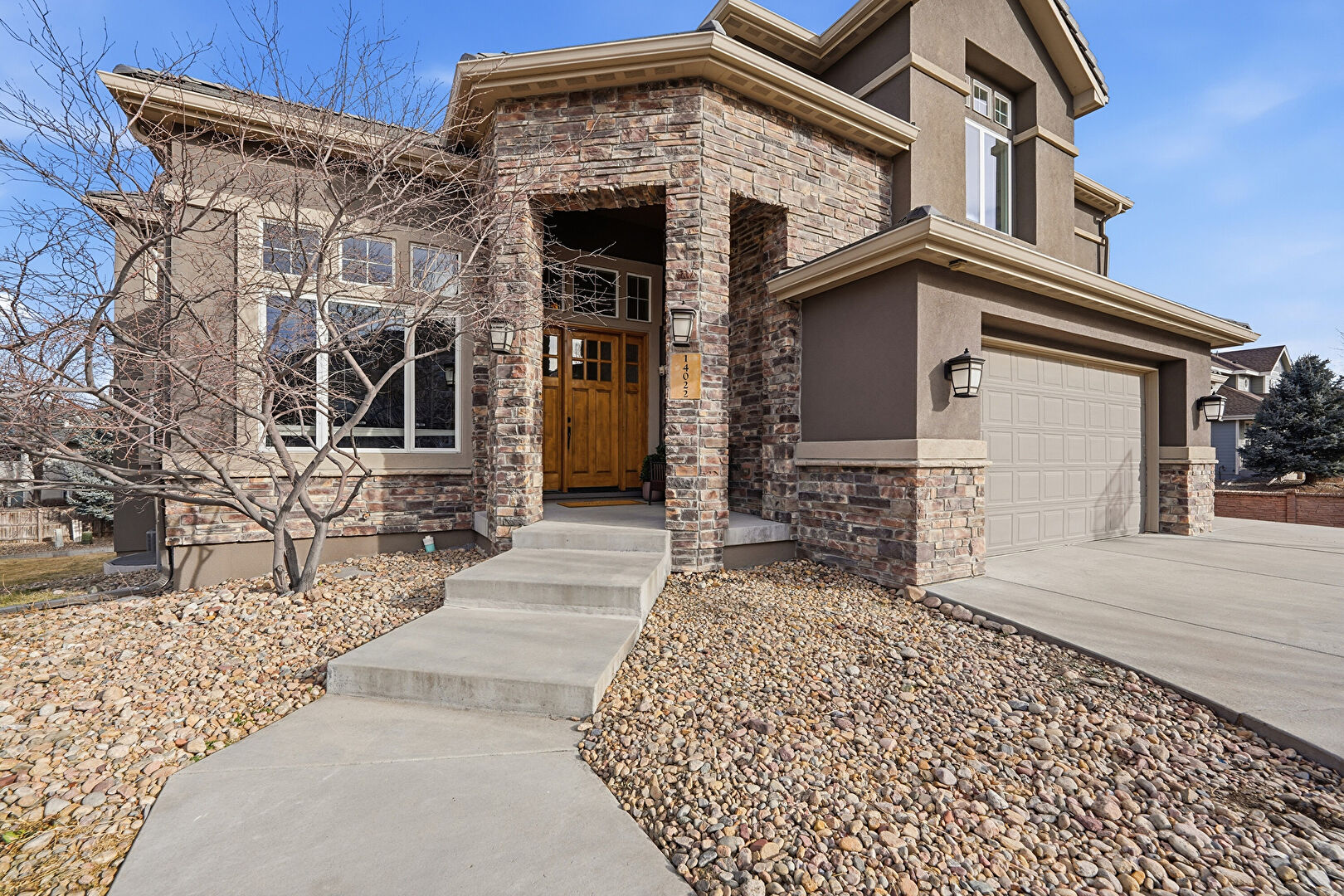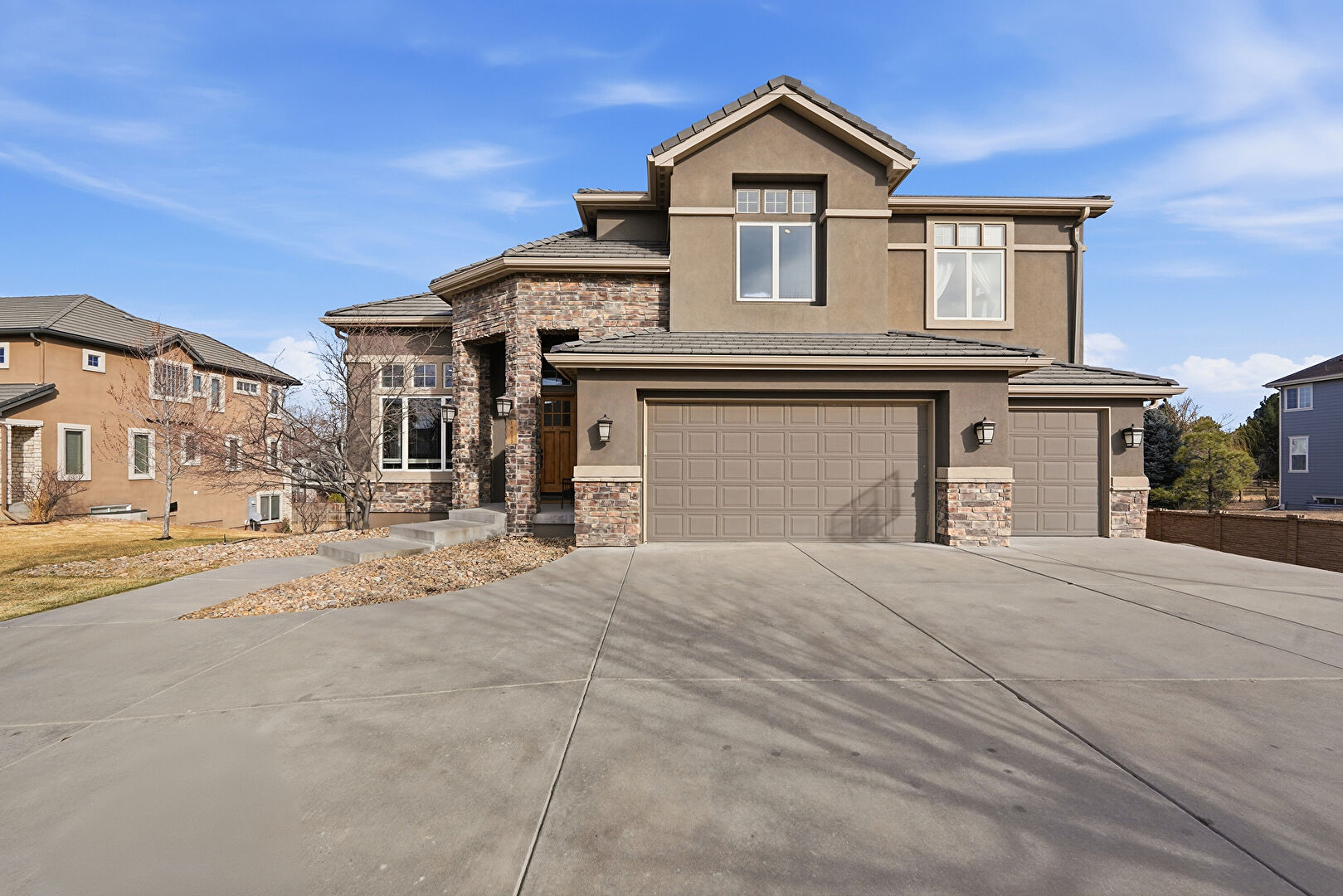Built In Garage, Central Ac, Driveway, Fence, Lawn, Residential View, Stone Siding, Stucco Siding, Tile Roof, Porch, Residential View