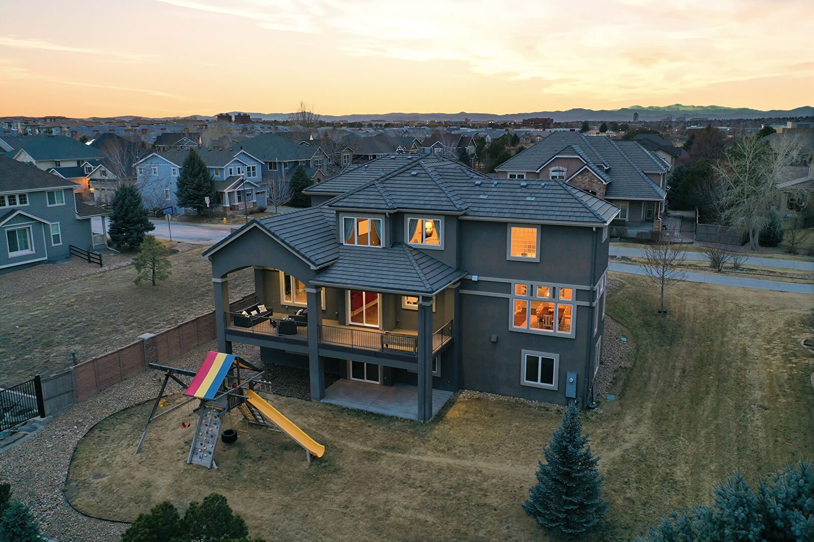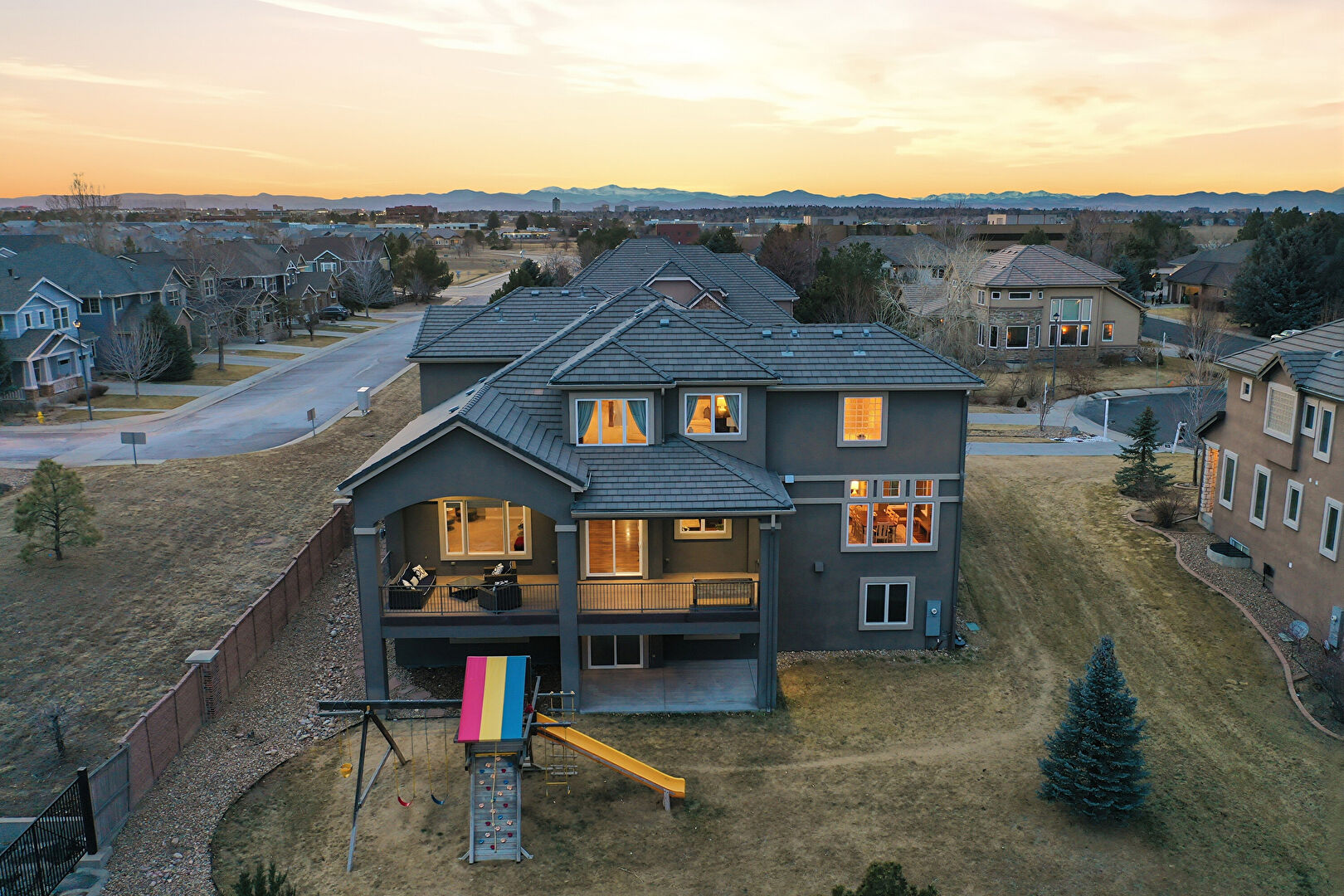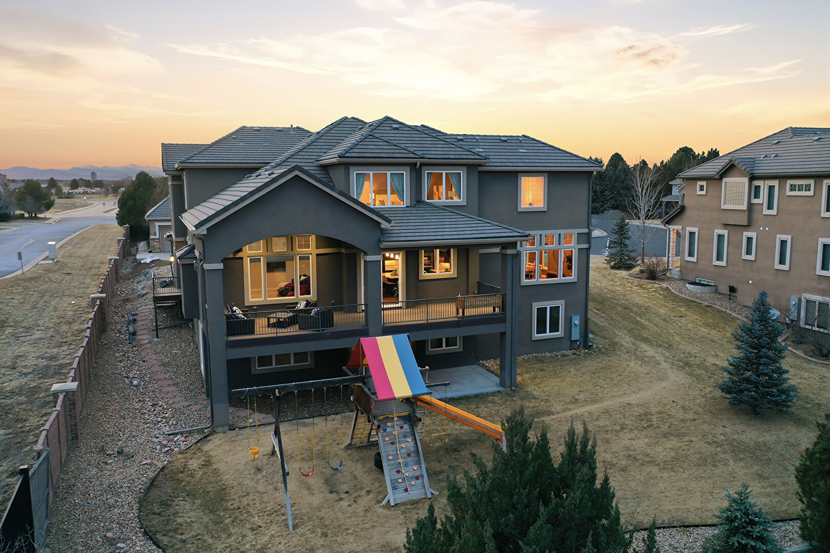 Balcony, Basement Walk Out, Built In Garage, Central Ac, Concrete Foundation, Deck, Downspout, Driveway, Electric Meter, Fence, Gutters, Lawn, Patio, Playground, Porch, Residential View, Stone Siding, Stoop, Stucco Siding, Tile Roof, Central Ac, Downspout, Driveway, Electric Meter, Gutters, Mountain View, Outdoor Living Space, Patio, Residential View, Stoop, Stucco Siding, Tile Roof