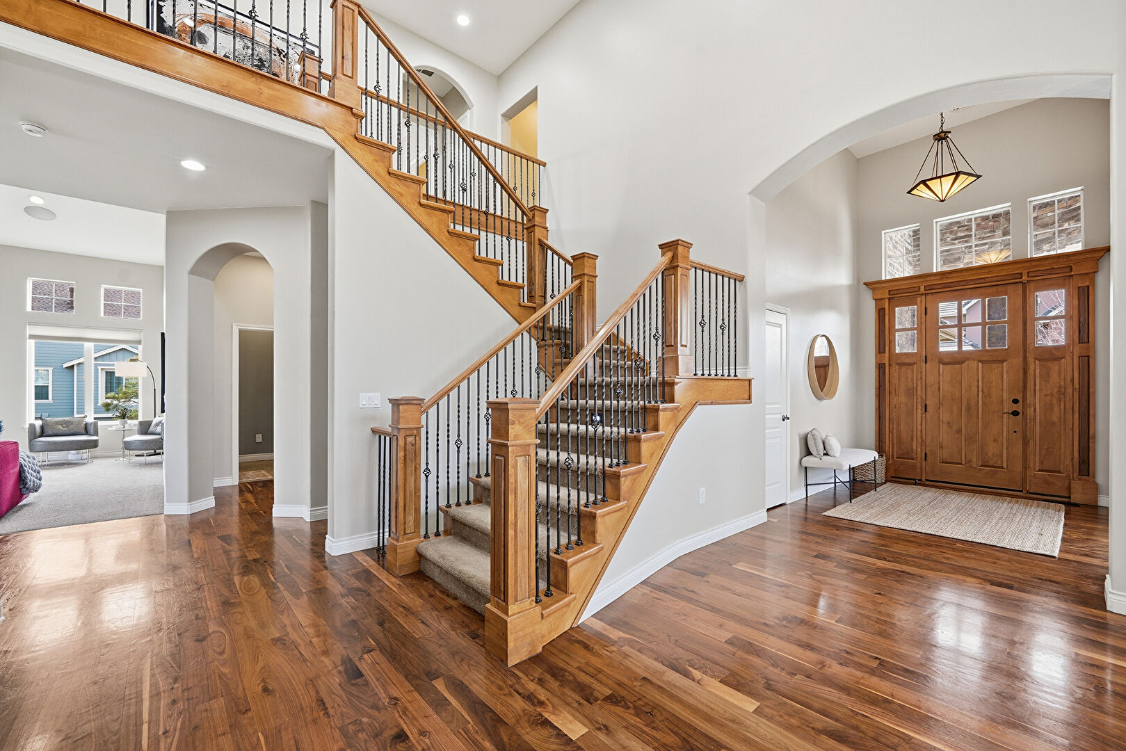 Baseboards Wall, Drywall, High Ceiling, Natural Light, Recessed Lighting, Stairs, Vent, Wood Finish Floor, Arched Walkways