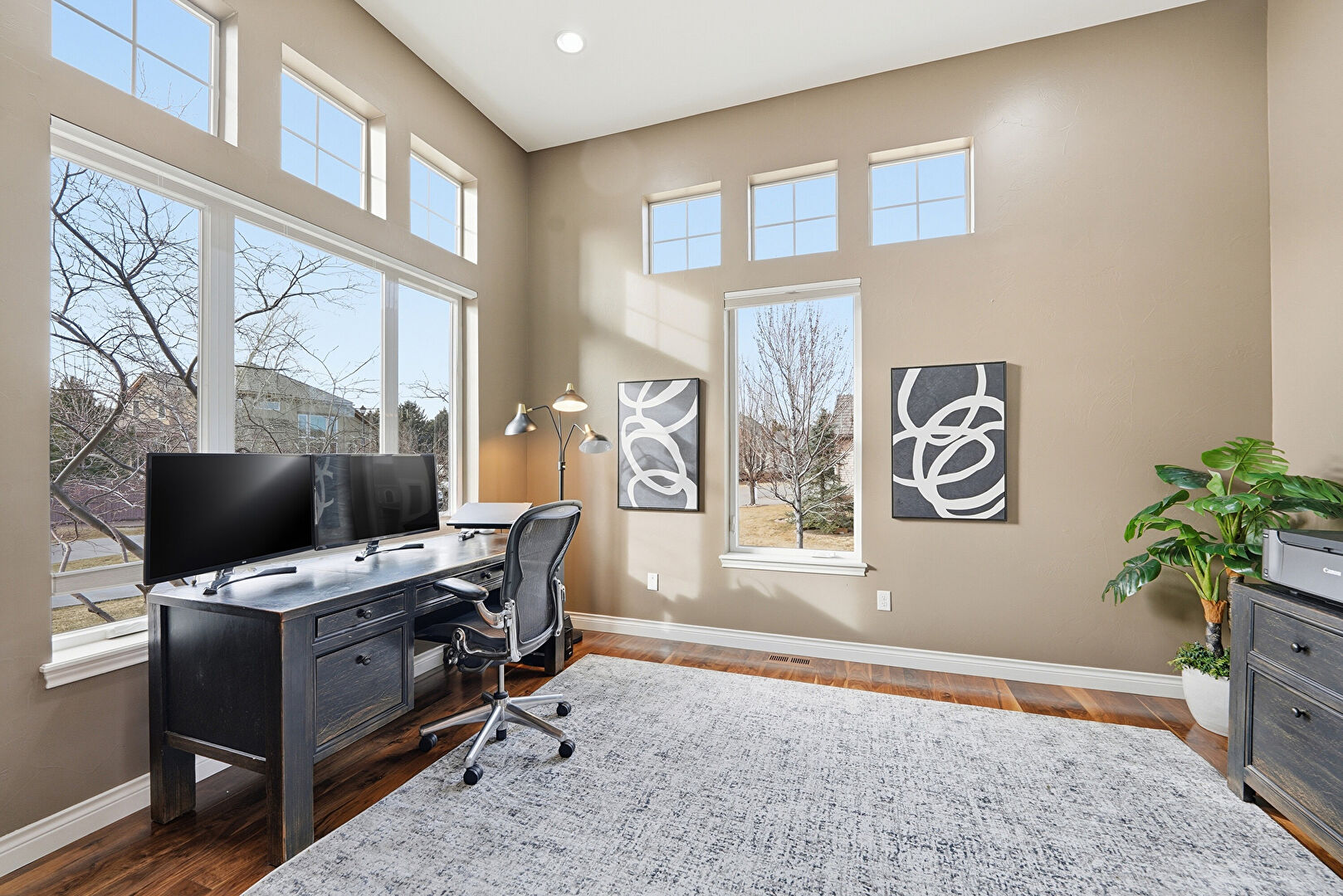Baseboards Wall, Drywall, High Ceiling, Office Area, Recessed Lighting, Vent, Wood Finish Floor, Natural Light
