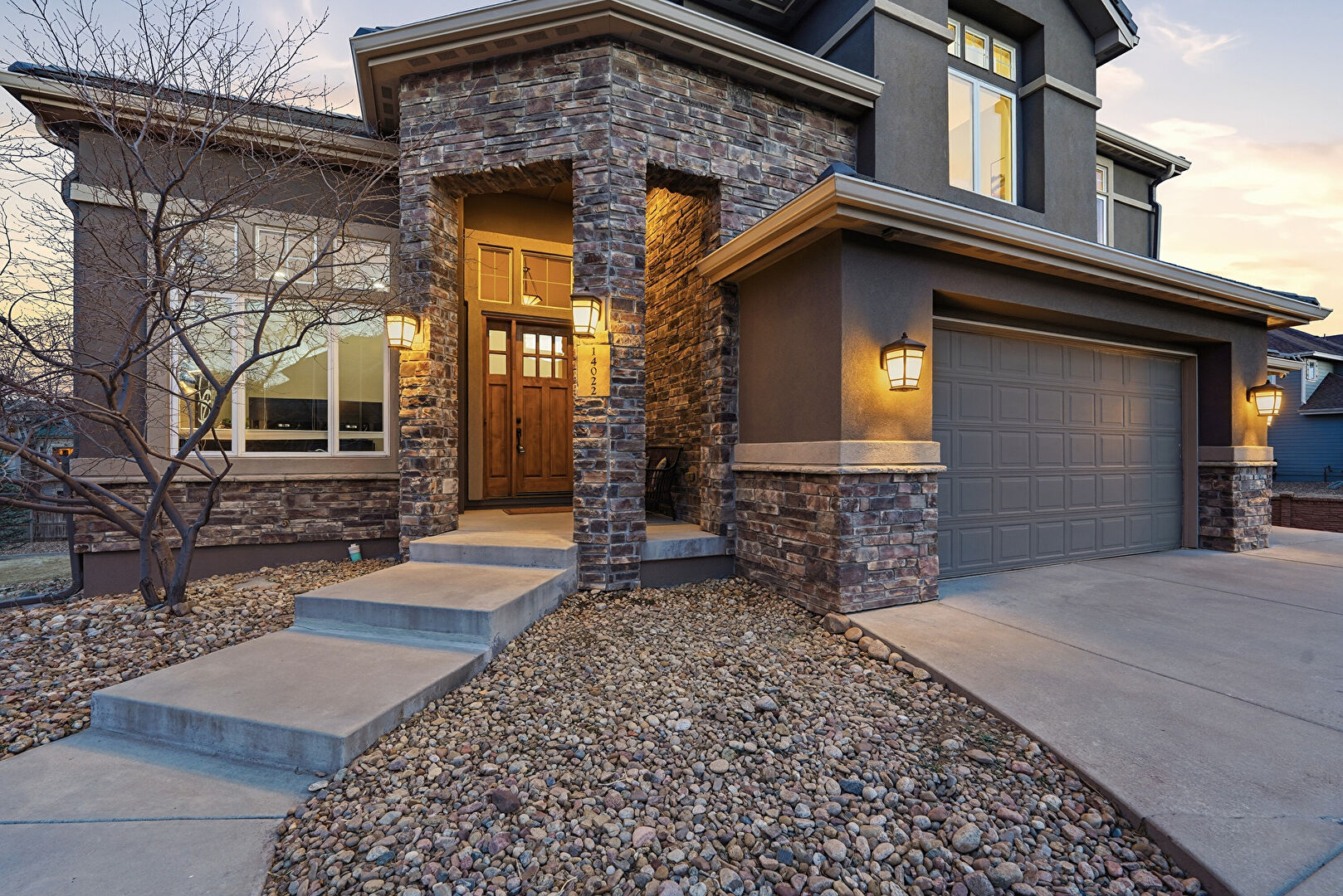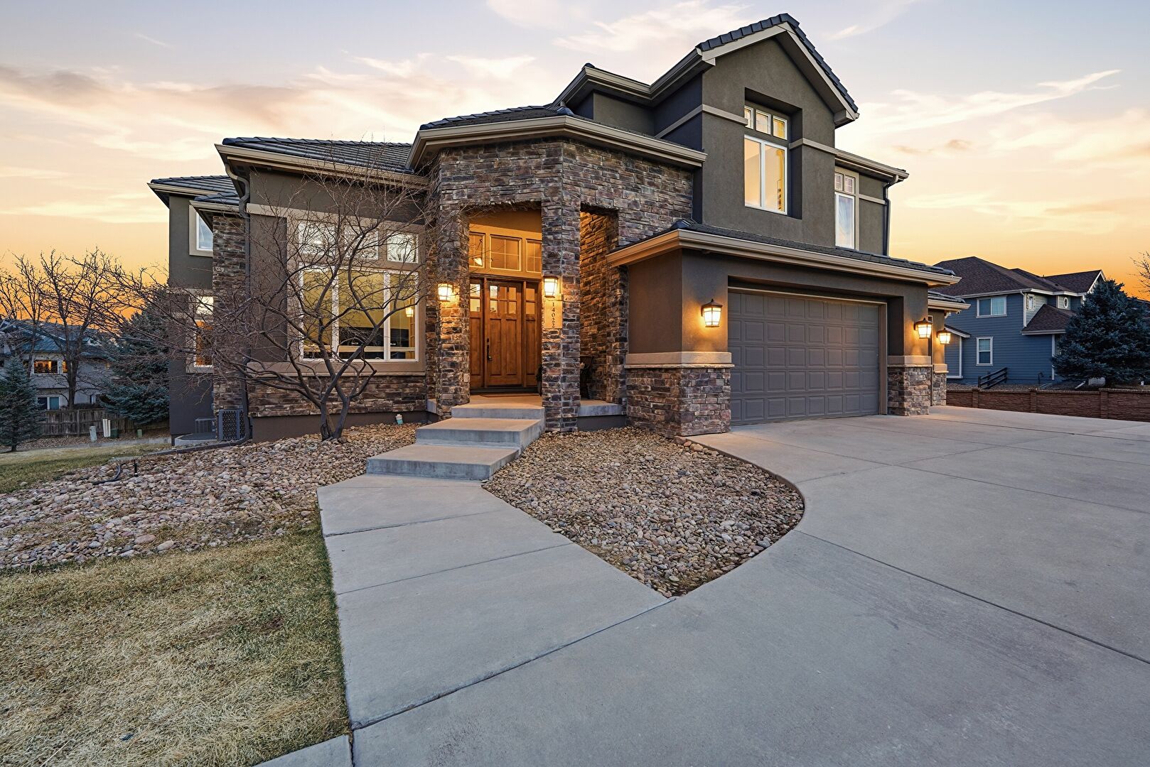 Brick Siding, Built In Garage, Concrete Foundation, Downspout, Driveway, Stone Siding, Stoop, Stucco Siding, Gutters, Stucco Siding